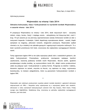Nowy Sącz, 6 maja 2014 r. Informacja prasowa Wojewodzic na wiosnę i lato 2014 Odważna kolorystyka, klasa i funkcjonalność to wyróżniki torebek Wojewodzica w sezonie wiosna – lato 2014. W propozycji Wojewodzica na wiosnę i lato 2014, obok nasyconych barw – soczystej zieleni, mięty, koralu, fuksji i ciepłego oranżu - odnajdziemy też klasyczną biel, czerń i brąz. W tym sezonie po raz pierwszy zaprezentowane zostały limitowane torebki ze skór z motywami leoparda i krokodyla. Całość dopełniają wysmakowane detale – suwaki, klapki zamykane na magnesy, pikowane wstawki, eleganckie przeszycia. Wojewodzic zadbał również o to, by w kolekcji nie zabrakło gorących i egzotycznych motywów roślinnych. To z kolei wyróżnik prestiżowej linii Gold, stworzonej dla najbardziej wymagających klientów marki. Torby sygnowane logiem WW to nie tylko najwyższa jakość skór z toskańskich garbarni, ale także funkcjonalność. Przemyślane, praktyczne rozwiązania nadające komfort użytkowania, stanowią podstawę torebek marki Wojewodzic. Boczne zamki, zgrabnie powiększające smukłą torebkę, są wyznacznikiem toreb XXL, dzięki czemu producentowi udało się połączyć szyk i funkcjonalność w jednej formie. Przegrody na telefon i tableta, kieszenie zapinane na zamek, smyczka na klucze, czy zapinana na rzepy, wyjmowana kosmetyczka, to kolejne udogodnienia, które są gwarantem funkcjonalności torebek z logiem WW. *** Wojewodzic jest rodzimym producentem wysokiej jakości torebek damskich i galanterii skórzanej nieprzerwanie od 1996 r. Wszystkie torby wykonywane są z najwyższej jakości skór włoskich, oferowane w wielu wariantach kolorystycznych czterech linii: Day Classics, Work Smart, Friday Lounge oraz Night&Shine. Dodatkową linią, stworzoną na potrzeby najbardziej wymagających klientów, jest linia Gold. ul. 29 Listopada 9 33-300 Nowy Sącz tel. +48 18 4444 755 tel./fax +48 18 443 87 98 e-mail: [email protected] Obecnie torby Wojewodzic to ponad 130 modeli wprowadzanych na rynek co pół roku (kolekcje wiosna – lato i jesień – zima) oraz sieć dystrybucji licząca ponad 80 placówek na terenie kraju. Wojewodzic to dojrzała marka, która stała się gwarantem stylu i jakości każdej torby sygnowanej logiem WW. Ze względu na tę jakość i podążanie za aktualnymi trendami, torby oraz inne dodatki marki Wojewodzic bardzo chętnie wybierane są przez znane osobistości ze świata biznesu, polityki i mody. Kontakt dla mediów: Rafał Wójs [email protected] 883 969 963. ul. 29 Listopada 9 33-300 Nowy Sącz tel. +48 18 4444 755 tel./fax +48 18 443 87 98 e-mail: [email protected]