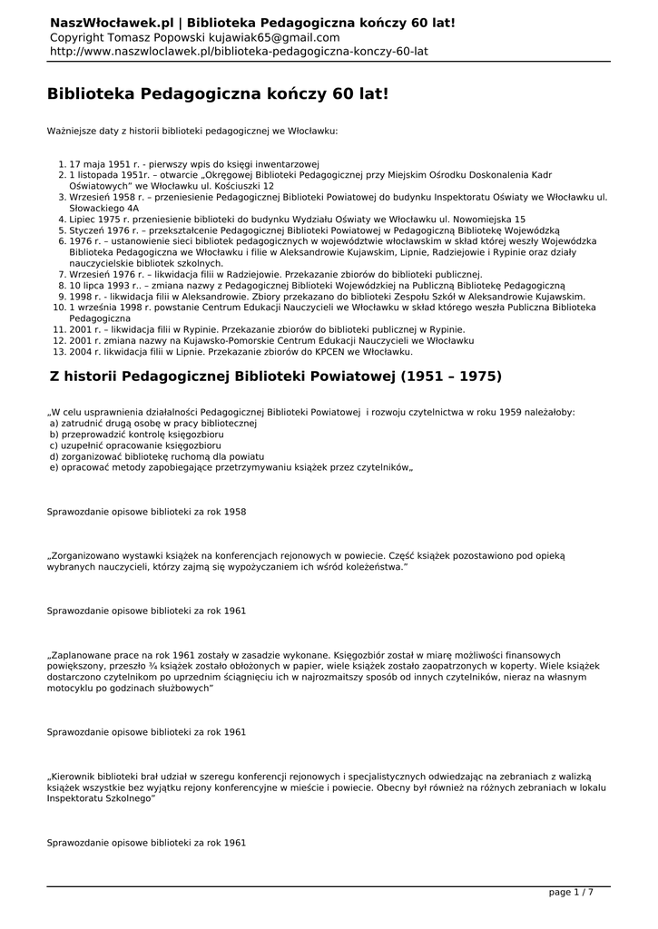 NaszWłocławek.pl | Biblioteka Pedagogiczna kończy 60 lat! Copyright Tomasz Popowski [email protected] http://www.naszwloclawek.pl/biblioteka-pedagogiczna-konczy-60-lat Biblioteka Pedagogiczna kończy 60 lat! Ważniejsze daty z historii biblioteki pedagogicznej we Włocławku: 1. 17 maja 1951 r. - pierwszy wpis do księgi inwentarzowej 2. 1 listopada 1951r. – otwarcie „Okręgowej Biblioteki Pedagogicznej przy Miejskim Ośrodku Doskonalenia Kadr Oświatowych” we Włocławku ul. Kościuszki 12 3. Wrzesień 1958 r. – przeniesienie Pedagogicznej Biblioteki Powiatowej do budynku Inspektoratu Oświaty we Włocławku ul. Słowackiego 4A 4. Lipiec 1975 r. przeniesienie biblioteki do budynku Wydziału Oświaty we Włocławku ul. Nowomiejska 15 5. Styczeń 1976 r. – przekształcenie Pedagogicznej Biblioteki Powiatowej w Pedagogiczną Bibliotekę Wojewódzką 6. 1976 r. – ustanowienie sieci bibliotek pedagogicznych w województwie włocławskim w skład której weszły Wojewódzka Biblioteka Pedagogiczna we Włocławku i filie w Aleksandrowie Kujawskim, Lipnie, Radziejowie i Rypinie oraz działy nauczycielskie bibliotek szkolnych. 7. Wrzesień 1976 r. – likwidacja filii w Radziejowie. Przekazanie zbiorów do biblioteki publicznej. 8. 10 lipca 1993 r.. – zmiana nazwy z Pedagogicznej Biblioteki Wojewódzkiej na Publiczną Bibliotekę Pedagogiczną 9. 1998 r. - likwidacja filii w Aleksandrowie. Zbiory przekazano do biblioteki Zespołu Szkół w Aleksandrowie Kujawskim. 10. 1 września 1998 r. powstanie Centrum Edukacji Nauczycieli we Włocławku w skład którego weszła Publiczna Biblioteka Pedagogiczna 11. 2001 r. – likwidacja filii w Rypinie. Przekazanie zbiorów do biblioteki publicznej w Rypinie. 12. 2001 r. zmiana nazwy na Kujawsko-Pomorskie Centrum Edukacji Nauczycieli we Włocławku 13. 2004 r. likwidacja filii w Lipnie. Przekazanie zbiorów do KPCEN we Włocławku. Z historii Pedagogicznej Biblioteki Powiatowej (1951 – 1975) „W celu usprawnienia działalności Pedagogicznej Biblioteki Powiatowej i rozwoju czytelnictwa w roku 1959 należałoby: a) zatrudnić drugą osobę w pracy bibliotecznej b) przeprowadzić kontrolę księgozbioru c) uzupełnić opracowanie księgozbioru d) zorganizować bibliotekę ruchomą dla powiatu e) opracować metody zapobiegające przetrzymywaniu książek przez czytelników„ Sprawozdanie opisowe biblioteki za rok 1958 „Zorganizowano wystawki książek na konferencjach rejonowych w powiecie. Część książek pozostawiono pod opieką wybranych nauczycieli, którzy zajmą się wypożyczaniem ich wśród koleżeństwa.” Sprawozdanie opisowe biblioteki za rok 1961 „Zaplanowane prace na rok 1961 zostały w zasadzie wykonane. Księgozbiór został w miarę możliwości finansowych powiększony, przeszło ¾ książek zostało obłożonych w papier, wiele książek zostało zaopatrzonych w koperty. Wiele książek dostarczono czytelnikom po uprzednim ściągnięciu ich w najrozmaitszy sposób od innych czytelników, nieraz na własnym motocyklu po godzinach służbowych” Sprawozdanie opisowe biblioteki za rok 1961 „Kierownik biblioteki brał udział w szeregu konferencji rejonowych i specjalistycznych odwiedzając na zebraniach z walizką książek wszystkie bez wyjątku rejony konferencyjne w mieście i powiecie. Obecny był również na różnych zebraniach w lokalu Inspektoratu Szkolnego” Sprawozdanie opisowe biblioteki za rok 1961 page 1 / 7 NaszWłocławek.pl | Biblioteka Pedagogiczna kończy 60 lat! Copyright Tomasz Popowski [email protected] http://www.naszwloclawek.pl/biblioteka-pedagogiczna-konczy-60-lat „Prace gospodarcze. Zakupiono i uszyto firanki do biblioteki. Zakupiono obrus na stolik i ceratę na biurko”. Sprawozdanie opisowe biblioteki za rok 1962 „Dobór książek do PBP według zapotrzebowania czytelników, wskazań Dyrektora SN w Toruniu i uzgadniany z Komisją Zakupu Książek” Sprawozdanie opisowe biblioteki za rok 1962 „Przez cały rok apelowano do czytelników o terminowy zwrot książek i zwracano uwagę na szkodliwość przetrzymywania ich” Sprawozdanie opisowe biblioteki za rok 1962 „Biblioteka współpracuje także z podinspektorami szkolnymi. Przygotowała dla nich wykazy podstawowych lektur metodycznych i światopoglądowych celem zalecania ich nauczycielom przy spostrzeżeniach powizytacyjnych” Sprawozdanie opisowe biblioteki za rok 1963 „Zakupiono do biblioteki 5 stolików, 3 skrzynki katalogowe, 2 lampy, przestawny piec w magazynie książek.” Sprawozdanie opisowe biblioteki za rok 1964 „Biblioteka posiada wszystkie pozycje książkowe wymienione w wykazie Ministerstwa Oświaty i to w kilku egzemplarzach” Sprawozdanie opisowe biblioteki za rok 1965 „Biblioteka dbała także o czystość i porządek księgozbioru. Wszystkie książki zaopatrzone są w sygnaturę firmową Biblioteki. Ponad 1000 książek zostało oprawionych w papier ochronny. W tej dziedzinie wydatnie pomógł nam kol. Władysław Markowski emerytowany kierownik szkoły z Chocenia, który przez okres 2 miesięcy po 3 godziny dziennie pracował społecznie” Sprawozdanie opisowe biblioteki za rok 1965 Ogólnie należy stwierdzić, że praca w roku 1965 układała nam się sprawnie i zgodnie z założeniami i wymaganiami władz zwierzchnich” Sprawozdanie opisowe biblioteki za rok 1965 page 2 / 7 NaszWłocławek.pl | Biblioteka Pedagogiczna kończy 60 lat! Copyright Tomasz Popowski [email protected] http://www.naszwloclawek.pl/biblioteka-pedagogiczna-konczy-60-lat „Biblioteka włączyła się czynnie do finału konkursu czytelniczego pn. „Tysiąclecie Państwa Polskiego”. Wspólna nasza praca nad rozwojem czytelnictwa książek o tematyce związanej z tysiącleciem dała piękne rezultaty, gdyż miasto i powiat Włocławek uzyskał I miejsce w woj. bydgoskim na szczeblu szkół podstawowych i licealnych.” Sprawozdanie opisowe biblioteki za rok 1966 „Stale troszczyliśmy się o wygląd książek opra