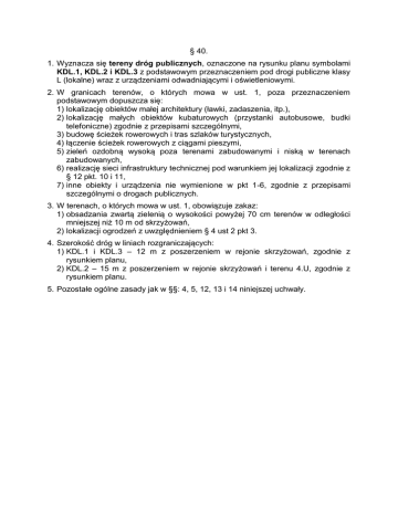 § 40. 1. Wyznacza się tereny dróg publicznych, oznaczone na rysunku planu symbolami KDL.1, KDL.2 i KDL.3 z podstawowym przeznaczeniem pod drogi publiczne klasy L (lokalne) wraz z urządzeniami odwadniającymi i oświetleniowymi. 2. W granicach terenów, o których mowa w ust. 1, poza przeznaczeniem podstawowym dopuszcza się: 1) lokalizację obiektów małej architektury (ławki, zadaszenia, itp.), 2) lokalizację małych obiektów kubaturowych (przystanki autobusowe, budki telefoniczne) zgodnie z przepisami szczególnymi, 3) budowę ścieżek rowerowych i tras szlaków turystycznych, 4) łączenie ścieżek rowerowych z ciągami pieszymi, 5) zieleń ozdobną wysoką poza terenami zabudowanymi i niską w terenach zabudowanych, 6) realizację sieci infrastruktury technicznej pod warunkiem jej lokalizacji zgodnie z § 12 pkt. 10 i 11, 7) inne obiekty i urządzenia nie wymienione w pkt 1-6, zgodnie z przepisami szczególnymi o drogach publicznych. 3. W terenach, o których mowa w ust. 1, obowiązuje zakaz: 1) obsadzania zwartą zielenią o wysokości powyżej 70 cm terenów w odległości mniejszej niż 10 m od skrzyżowań, 2) lokalizacji ogrodzeń z uwzględnieniem § 4 ust 2 pkt 3. 4. Szerokość dróg w liniach rozgraniczających: 1) KDL.1 i KDL.3 – 12 m z poszerzeniem w rejonie skrzyżowań, zgodnie z rysunkiem planu, 2) KDL.2 – 15 m z poszerzeniem w rejonie skrzyżowań i terenu 4.U, zgodnie z rysunkiem planu. 5. Pozostałe ogólne zasady jak w §§: 4, 5, 12, 13 i 14 niniejszej uchwały.