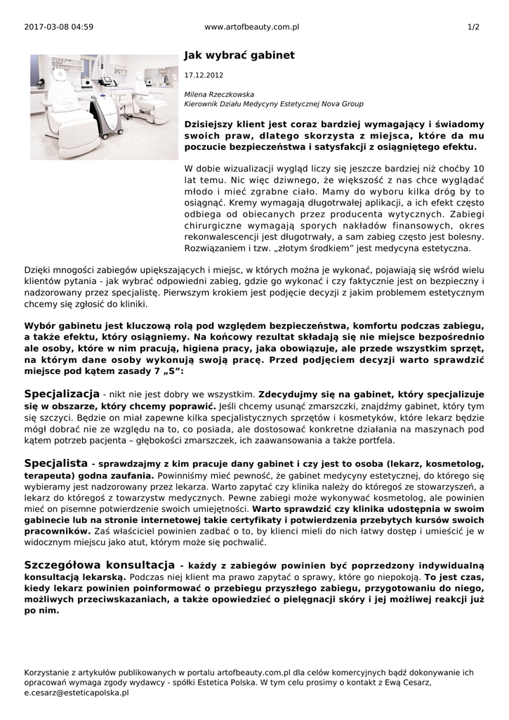 2017-03-08 04:59 www.artofbeauty.com.pl 1/2 Jak wybrać gabinet 17.12.2012 Milena Rzeczkowska Kierownik Działu Medycyny Estetycznej Nova Group Dzisiejszy klient jest coraz bardziej wymagający i świadomy swoich praw, dlatego skorzysta z miejsca, które da mu poczucie bezpieczeństwa i satysfakcji z osiągniętego efektu. W dobie wizualizacji wygląd liczy się jeszcze bardziej niż choćby 10 lat temu. Nic więc dziwnego, że większość z nas chce wyglądać młodo i mieć zgrabne ciało. Mamy do wyboru kilka dróg by to osiągnąć. Kremy wymagają długotrwałej aplikacji, a ich efekt często odbiega od obiecanych przez producenta wytycznych. Zabiegi chirurgiczne wymagają sporych nakładów finansowych, okres rekonwalescencji jest długotrwały, a sam zabieg często jest bolesny. Rozwiązaniem i tzw. „złotym środkiem” jest medycyna estetyczna. Dzięki mnogości zabiegów upiększających i miejsc, w których można je wykonać, pojawiają się wśród wielu klientów pytania - jak wybrać odpowiedni zabieg, gdzie go wykonać i czy faktycznie jest on bezpieczny i nadzorowany przez specjalistę. Pierwszym krokiem jest podjęcie decyzji z jakim problemem estetycznym chcemy się zgłosić do kliniki. Wybór gabinetu jest kluczową rolą pod względem bezpieczeństwa, komfortu podczas zabiegu, a także efektu, który osiągniemy. Na końcowy rezultat składają się nie miejsce bezpośrednio ale osoby, które w nim pracują, higiena pracy, jaka obowiązuje, ale przede wszystkim sprzęt, na którym dane osoby wykonują swoją pracę. Przed podjęciem decyzji warto sprawdzić miejsce pod kątem zasady 7 „S”: Specjalizacja - nikt nie jest dobry we wszystkim. Zdecydujmy się na gabinet, który specjalizuje się w obszarze, który chcemy poprawić. Jeśli chcemy usunąć zmarszczki, znajdźmy gabinet, który tym się szczyci. Będzie on miał zapewne kilka specjalistycznych sprzętów i kosmetyków, które lekarz będzie mógł dobrać nie ze względu na to, co posiada, ale dostosować konkretne działania na maszynach pod kątem potrzeb pacjenta – głębokości zmarszczek, ich zaawansowania a także portfela. Specjalista - sprawdzajmy z kim pracuje dany gabinet i czy jest to osoba (lekarz, kosmetolog, terapeuta) godna zaufania. Powinniśmy mieć pewność, że gabinet medycyny estetycznej, do którego się wybieramy jest nadzorowany przez lekarza. Warto zapytać czy klinika należy do któregoś ze stowarzyszeń, a lekarz do któregoś z towarzystw medycznych. Pewne zabiegi może wykonywać kosmetolog, ale powinien mieć on pisemne potwierdzenie swoich umiejętności. Warto sprawdzić czy klinika udostępnia w swoim gabinecie lub na stronie internetowej takie certyfikaty i potwierdzenia przebytych kursów swoich pracowników. Zaś właściciel powinien zadbać o to, by klienci mieli do nich łatwy dostęp i umieścić je w widocznym miejscu jako atut, którym może się pochwalić. Szczegółowa konsultacja - każdy z zabiegów powinien być poprzedzony indywidualną konsultacją lekarską. Podczas niej klient ma prawo zapytać o sprawy, które go niepokoją. To jest czas, kiedy lekarz powinien poinformować o przebiegu przyszłego zabiegu, przygotowaniu do niego, możliwych przeciwskazaniach, a także opowiedzieć o pielęgnacji skóry i jej możliwej reakcji już po nim. Korzystanie z artykułów publikowanych w portalu artofbeauty.com.pl dla celów komercyjnych bądź dokonywanie ich opracowań wymaga zgody wydawcy - spółki Estetica Polska. W tym celu prosimy o kontakt z Ewą Cesarz, [email protected] 2017-03-08 04:59 www.artofbeauty.com.pl 2/2 Sprzęt - jest równie ważny co wykwalifikowani lekarze. Wybierajmy miejsca, które posiadają tylko wysokiej jakości produkty, od specjalizujących się w tej dziedzinie producentów, z pełną dokumentacją (taką jak certyfikaty medyczne, badania kliniczne, protokoły zabiegowe czy instrukcje). Sprawdzajmy na czym zabieg będzie wykonywany. Podanie na stronie internetowej samych nazw zabiegów takich jak: laserowe usuwanie zmarszczek może świadczyć o mało profesjonalnym podejściu. Skoro w swojej ofercie gabinet posiada sprzęt wysokiej jakości, w którego efektywność wierzymy, dlaczego się nimi nie chwali? Dzięki jasnym i jawnym informacjom dotyczącym nazwy sprzętu i producenta klient może (jeśli sobie życzy) sprawdzić rodowód producenta, a także pochodzenie urządzeń. Standardy - ufajmy światowym liderom w tej dziedzinie, wybierajmy firmy, którym przynajmniej raz w roku przyznano gwiazdkę tzw. „Złotych Standardów w Medycynie Estetycznej” lub inne nagrody na prestiżowych imprezach branżowych. Przy okazji sprawdzania producenta urządzeń dostępnych w wybranym przez nas gabinecie, warto poświęcić czas na research, czy dane urządzenia posiadają certyfikaty, otrzymały nagrody od grona lekarzy lub branży kosmetycznej oraz czy zapewniają personelowi kliniki bezpłatne szkolenia. Serwis i Szkolenia - są to dwie istotne zasady przede wszystkim dla osób decydujących się na otwarcie własnej kliniki medycyny estetycznej. Sprawdźmy zawsze czy dostawca sprzętu jest w stanie zapewnić sprawnie funkcjonujący serwis oraz czy posiada zaplecze treningowe wraz z wykwalifikowanym personelem szkolącym. To także potwierdzenie dla klienta, że osoby, które wykonują zabieg miały styczność ze szkoleniami i wiedzą jak wykorzystać atuty urządzenia by osiągnąć zamierzony przez klienta efekt. Medycyna estetyczna jest dziedziną bardzo prężnie rozwijającą się ale należy pamiętać, że każdy nowy dobrze funkcjonujący łańcuch w biznesie, to również pokusa szybkich pieniędzy dla ludzi oferujących tańszy sprzęt, brak szkoleń czy gorszej jakości kosmetyki. Tym samym raz jeszcze podkreślmy ogromnie istotna jest właściwa i rzetelna selekcja: gabinetów, lekarzy oraz urządzeń. Zabiegi medycyny estetycznej nie są tak inwazyjne jak chirurgia plastyczna ale również niosą za sobą 
