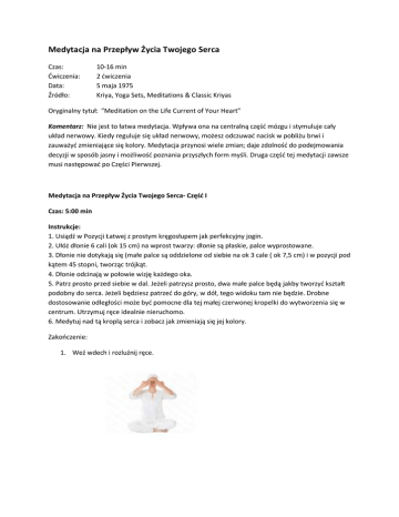 Medytacja na Przepływ Życia Twojego Serca Czas: Ćwiczenia: Data: Źródło: 10-16 min 2 ćwiczenia 5 maja 1975 Kriya, Yoga Sets, Meditations & Classic Kriyas Oryginalny tytuł: ”Meditation on the Life Current of Your Heart” Komentarz: Nie jest to łatwa medytacja. Wpływa ona na centralną część mózgu i stymuluje cały układ nerwowy. Kiedy reguluje się układ nerwowy, możesz odczuwać nacisk w pobliżu brwi i zauważyć zmieniające się kolory. Medytacja przynosi wiele zmian; daje zdolność do podejmowania decyzji w sposób jasny i możliwość poznania przyszłych form myśli. Druga część tej medytacji zawsze musi następować po Części Pierwszej. Medytacja na Przepływ Życia Twojego Serca- Część I Czas: 5:00 min Instrukcje: 1. Usiądź w Pozycji Łatwej z prostym kręgosłupem jak perfekcyjny jogin. 2. Ułóż dłonie 6 cali (ok 15 cm) na wprost twarzy: dłonie są płaskie, palce wyprostowane. 3. Dłonie nie dotykają się (małe palce są oddzielone od siebie na ok 3 cale ( ok 7,5 cm) i w pozycji pod kątem 45 stopni, tworząc trójkąt. 4. Dłonie odcinają w połowie wizję każdego oka. 5. Patrz prosto przed siebie w dal. Jeżeli patrzysz prosto, dwa małe palce będą jakby tworzyć kształt podobny do serca. Jeżeli będziesz patrzeć do góry, w dół, tego widoku tam nie będzie. Drobne dostosowanie odległości może być pomocne dla tej małej czerwonej kropelki do wytworzenia się w centrum. Utrzymuj ręce idealnie nieruchomo. 6. Medytuj nad tą kroplą serca i zobacz jak zmieniają się jej kolory. Zakończenie: 1. Weź wdech i rozluźnij ręce. Medytacja na Przepływ Życia Twojego Serca- Część II Czas: 5:00 min Instrukcje: 1. Usiądź w Pozycji Łatwej . 2. Ułóż dłonie w Gjan Mudrze, kciuk i pierwszy palec stykają się, na kolanach, z prostymi łokciami. 3. Śpiewaj Gobinde Mukande Udhare Apare Hariang Kariang Nirname Akame w monotonie. 4. Każdy dźwięk jest odizolowany. Niech na siebie nie zachodzą. Krótka ale pełna przerwa jest ważna pomiędzy słowami. Śpiew jest wykonywany tak, ze każde słowo jest oddzielone przerwą. Nie ma łączących dźwięków. Każde słowo jest wymawiane. To jest bardzo osamotniona i zindywidualizowana sztuka. Komentarz: „ To jest tak jakbyśmy kroili na plasterki ser cheddar albo zielenie buraków. To czynność krojenia jest ważna. To co żaden świadomy wysiłek nie może wytworzyć w człowieku, „Boskie Zielenie” mogą. Jest tam pauza i słowo. Cięcie, pauza, słowo. Nie będziesz nigdy w stanie zrozumieć Siri Guru Granth Sahib jeżeli nie rozumiesz Rahao (pauzy). Rahao jest całym sekretem. Całą tajemnicą w wibracji yin i yang w każdym Shabad’zie. Słowo i pauza tworzą równowagę tej medytacji i to jest najwyższa moc”. Kriya ©1975 - The Yogi Bhajan Library of Teachings® Biblioteka Nauk Kundalini Jogi