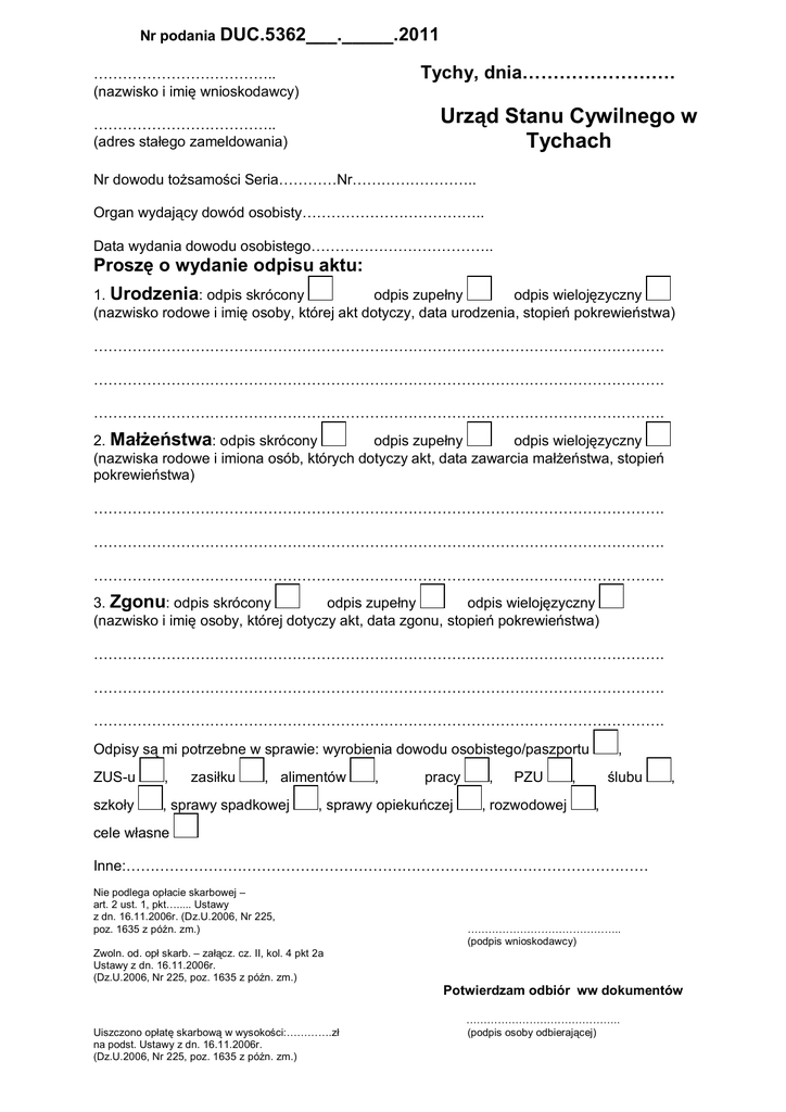 Nr podania DUC.5362___._____.2011 Tychy, dnia……………………. ……………………………….. (nazwisko i imię wnioskodawcy) Urząd Stanu Cywilnego w Tychach ……………………………….. (adres stałego zameldowania) Nr dowodu tożsamości Seria…………Nr…………………….. Organ wydający dowód osobisty……………………………….. Data wydania dowodu osobistego……………………………….. Proszę o wydanie odpisu aktu: 1. Urodzenia: odpis skrócony odpis zupełny odpis wielojęzyczny (nazwisko rodowe i imię osoby, której akt dotyczy, data urodzenia, stopień pokrewieństwa) ………………………………………………………………………………………………………. ………………………………………………………………………………………………………. ………………………………………………………………………………………………………. 2. Małżeństwa: odpis skrócony odpis zupełny odpis wielojęzyczny (nazwiska rodowe i imiona osób, których dotyczy akt, data zawarcia małżeństwa, stopień pokrewieństwa) ………………………………………………………………………………………………………. ………………………………………………………………………………………………………. ………………………………………………………………………………………………………. 3. Zgonu: odpis skrócony odpis zupełny odpis wielojęzyczny (nazwisko i imię osoby, której dotyczy akt, data zgonu, stopień pokrewieństwa) ………………………………………………………………………………………………………. ………………………………………………………………………………………………………. ………………………………………………………………………………………………………. Odpisy są mi potrzebne w sprawie: wyrobienia dowodu osobistego/paszportu ZUS-u , zasiłku , alimentów szkoły , sprawy spadkowej , pracy , sprawy opiekuńczej , PZU , rozwodowej , , ślubu , , cele własne Inne:……………………………………………………………………………………………… Nie podlega opłacie skarbowej – art. 2 ust. 1, pkt…..... Ustawy z dn. 16.11.2006r. (Dz.U.2006, Nr 225, poz. 1635 z późn. zm.) …………………………………….. (podpis wnioskodawcy) Zwoln. od. opł skarb. – załącz. cz. II, kol. 4 pkt 2a Ustawy z dn. 16.11.2006r. (Dz.U.2006, Nr 225, poz. 1635 z późn. zm.) Potwierdzam odbiór ww dokumentów Uiszczono opłatę skarbową w wysokości:………….zł na podst. Ustawy z dn. 16.11.2006r. (Dz.U.2006, Nr 225, poz. 1635 z późn. zm.) …………………………………….. (podpis osoby odbierającej)