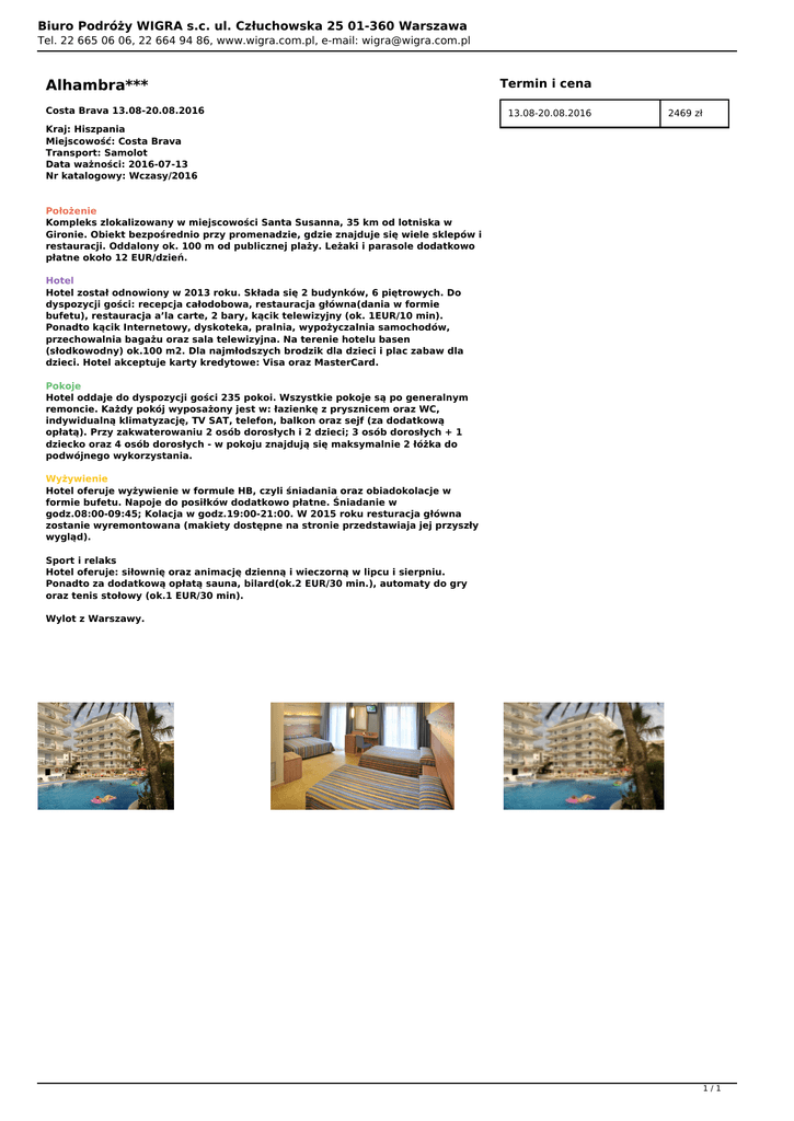 Biuro Podróży WIGRA s.c. ul. Człuchowska 25 01-360 Warszawa Tel. 22 665 06 06, 22 664 94 86, www.wigra.com.pl, e-mail: [email protected] Alhambra*** Costa Brava 13.08-20.08.2016 Termin i cena 13.08-20.08.2016 2469 zł Kraj: Hiszpania Miejscowość: Costa Brava Transport: Samolot Data ważności: 2016-07-13 Nr katalogowy: Wczasy/2016 Położenie Kompleks zlokalizowany w miejscowości Santa Susanna, 35 km od lotniska w Gironie. Obiekt bezpośrednio przy promenadzie, gdzie znajduje się wiele sklepów i restauracji. Oddalony ok. 100 m od publicznej plaży. Leżaki i parasole dodatkowo płatne około 12 EUR/dzień. Hotel Hotel został odnowiony w 2013 roku. Składa się 2 budynków, 6 piętrowych. Do dyspozycji gości: recepcja całodobowa, restauracja główna(dania w formie bufetu), restauracja a’la carte, 2 bary, kącik telewizyjny (ok. 1EUR/10 min). Ponadto kącik Internetowy, dyskoteka, pralnia, wypożyczalnia samochodów, przechowalnia bagażu oraz sala telewizyjna. Na terenie hotelu basen (słodkowodny) ok.100 m2. Dla najmłodszych brodzik dla dzieci i plac zabaw dla dzieci. Hotel akceptuje karty kredytowe: Visa oraz MasterCard. Pokoje Hotel oddaje do dyspozycji gości 235 pokoi. Wszystkie pokoje są po generalnym remoncie. Każdy pokój wyposażony jest w: łazienkę z prysznicem oraz WC, indywidualną klimatyzację, TV SAT, telefon, balkon oraz sejf (za dodatkową opłatą). Przy zakwaterowaniu 2 osób dorosłych i 2 dzieci; 3 osób dorosłych + 1 dziecko oraz 4 osób dorosłych - w pokoju znajdują się maksymalnie 2 łóżka do podwójnego wykorzystania. Wyżywienie Hotel oferuje wyżywienie w formule HB, czyli śniadania oraz obiadokolacje w formie bufetu. Napoje do posiłków dodatkowo płatne. Śniadanie w godz.08:00-09:45; Kolacja w godz.19:00-21:00. W 2015 roku resturacja główna zostanie wyremontowana (makiety dostępne na stronie przedstawiaja jej przyszły wygląd). Sport i relaks Hotel oferuje: siłownię oraz animację dzienną i wieczorną w lipcu i sierpniu. Ponadto za dodatkową opłatą sauna, bilard(ok.2 EUR/30 min.), automaty do gry oraz tenis stołowy (ok.1 EUR/30 min). Wylot z Warszawy. 1/1 Powered by TCPDF (www.tcpdf.org)