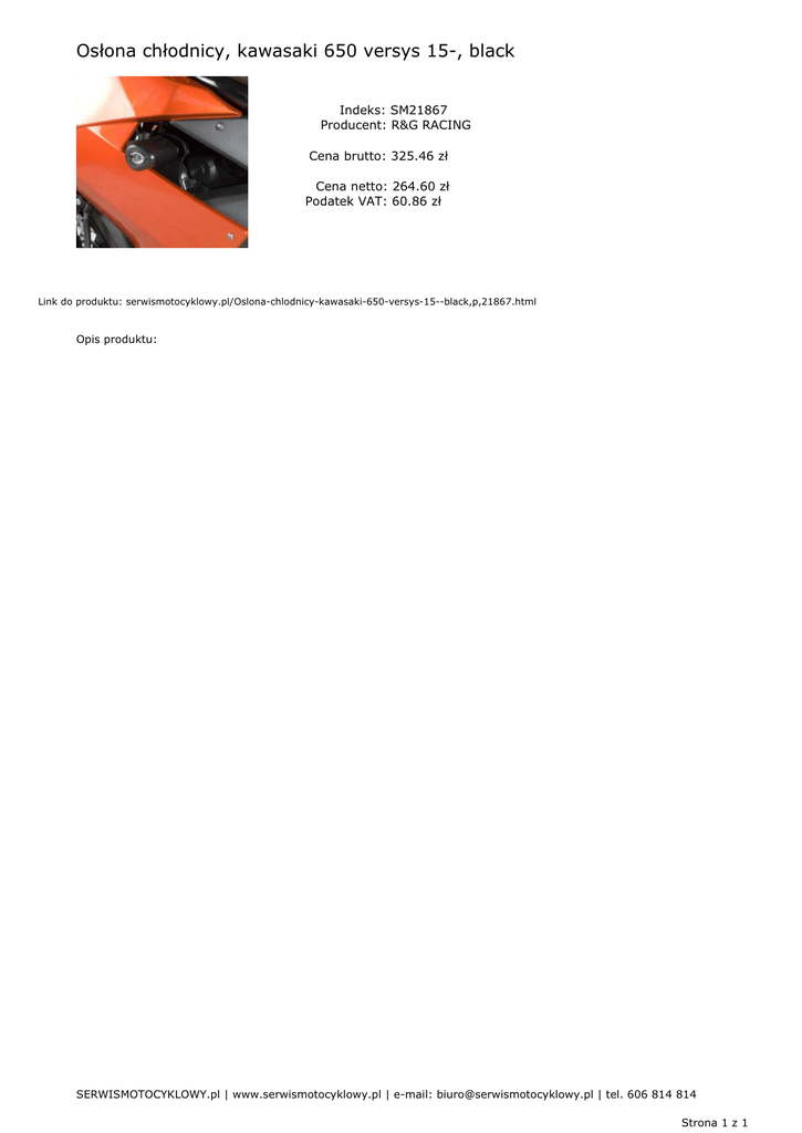 Osłona chłodnicy, kawasaki 650 versys 15-, black Indeks: SM21867 Producent: R&G RACING Cena brutto: 325.46 zł Cena netto: 264.60 zł Podatek VAT: 60.86 zł Link do produktu: serwismotocyklowy.pl/Oslona-chlodnicy-kawasaki-650-versys-15--black,p,21867.html Opis produktu: SERWISMOTOCYKLOWY.pl | www.serwismotocyklowy.pl | e-mail: [email protected] | tel. 606 814 814 Strona 1 z 1