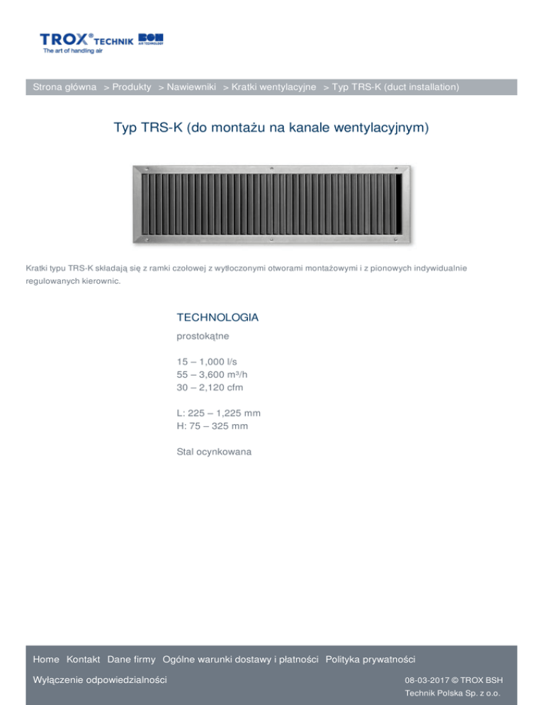 Strona główna > Produkty > Nawiewniki > Kratki wentylacyjne > Typ TRS-K (duct installation) Typ TRS-K (do montażu na kanale wentylacyjnym) Kratki typu TRS-K składają się z ramki czołowej z wytłoczonymi otworami montażowymi i z pionowych indywidualnie regulowanych kierownic. TECHNOLOGIA prostokątne 15 – 1,000 l/s 55 – 3,600 m³/h 30 – 2,120 cfm L: 225 – 1,225 mm H: 75 – 325 mm Stal ocynkowana Home Kontakt Dane firmy Ogólne warunki dostawy i płatności Polityka prywatności Wyłączenie odpowiedzialności 08-03-2017 © TROX BSH Technik Polska Sp. z o.o. Strona główna > Produkty > Nawiewniki > Kratki wentylacyjne > Typ TRS-K (duct installation) TROX BSH Technik Polska Sp. z o.o. Kontakt online Formularz kontaktowy Kontakt TROX BSH Stara Iwiczna Zgłoszenie usterki Zapytanie ofertowe - szafy Telefon: +48 22 73718 58 Fax: +48 22 737 18 59 Tel. Komórkowy: +48 662 129 415 Kontakt TROX BSH Technik Polska Sp. z o.o. ul. Kolejowa 13, Stara Iwiczna 05-500 Piaseczno telefon +48 22 737 18 58 fax +48 22 737 18 59 e-mail: [email protected] Home Kontakt Dane firmy Ogólne warunki dostawy i płatności Polityka prywatności Wyłączenie odpowiedzialności 08-03-2017 © TROX BSH Technik Polska Sp. z o.o.
