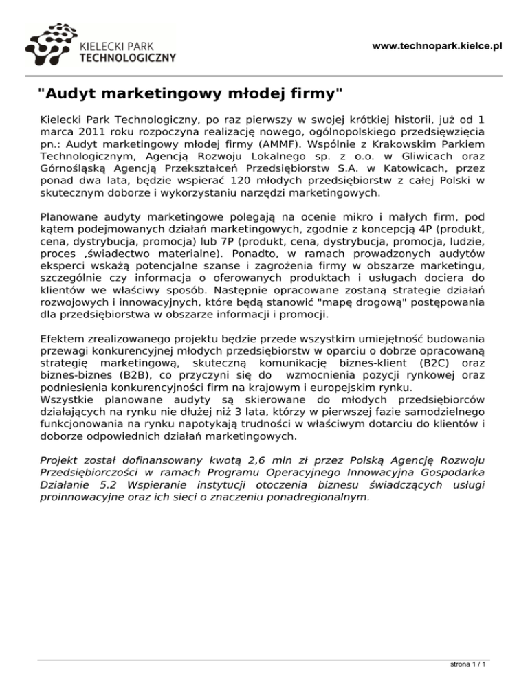 www.technopark.kielce.pl "Audyt marketingowy młodej firmy" Kielecki Park Technologiczny, po raz pierwszy w swojej krótkiej historii, już od 1 marca 2011 roku rozpoczyna realizację nowego, ogólnopolskiego przedsięwzięcia pn.: Audyt marketingowy młodej firmy (AMMF). Wspólnie z Krakowskim Parkiem Technologicznym, Agencją Rozwoju Lokalnego sp. z o.o. w Gliwicach oraz Górnośląską Agencją Przekształceń Przedsiębiorstw S.A. w Katowicach, przez ponad dwa lata, będzie wspierać 120 młodych przedsiębiorstw z całej Polski w skutecznym doborze i wykorzystaniu narzędzi marketingowych. Planowane audyty marketingowe polegają na ocenie mikro i małych firm, pod kątem podejmowanych działań marketingowych, zgodnie z koncepcją 4P (produkt, cena, dystrybucja, promocja) lub 7P (produkt, cena, dystrybucja, promocja, ludzie, proces ,świadectwo materialne). Ponadto, w ramach prowadzonych audytów eksperci wskażą potencjalne szanse i zagrożenia firmy w obszarze marketingu, szczególnie czy informacja o oferowanych produktach i usługach dociera do klientów we właściwy sposób. Następnie opracowane zostaną strategie działań rozwojowych i innowacyjnych, które będą stanowić "mapę drogową" postępowania dla przedsiębiorstwa w obszarze informacji i promocji. Efektem zrealizowanego projektu będzie przede wszystkim umiejętność budowania przewagi konkurencyjnej młodych przedsiębiorstw w oparciu o dobrze opracowaną strategię marketingową, skuteczną komunikację biznes-klient (B2C) oraz biznes-biznes (B2B), co przyczyni się do wzmocnienia pozycji rynkowej oraz podniesienia konkurencyjności firm na krajowym i europejskim rynku. Wszystkie planowane audyty są skierowane do młodych przedsiębiorców działających na rynku nie dłużej niż 3 lata, którzy w pierwszej fazie samodzielnego funkcjonowania na rynku napotykają trudności w właściwym dotarciu do klientów i doborze odpowiednich działań marketingowych. Projekt został dofinansowany kwotą 2,6 mln zł przez Polską Agencję Rozwoju Przedsiębiorczości w ramach Programu Operacyjnego Innowacyjna Gospodarka Działanie 5.2 Wspieranie instytucji otoczenia biznesu świadczących usługi proinnowacyjne oraz ich sieci o znaczeniu ponadregionalnym. strona 1 / 1 Powered by TCPDF (www.tcpdf.org)