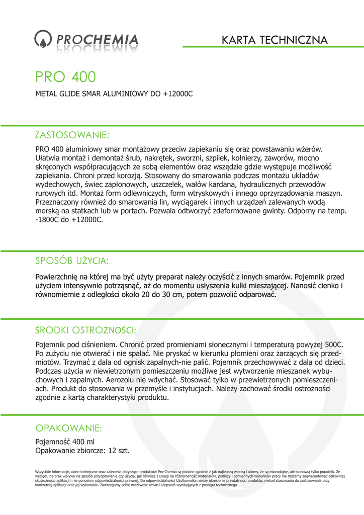 KARTA TECHNICZNA PRO 400 METAL GLIDE SMAR ALUMINIOWY DO +12000C ZASTOSOWANIE: PRO 400 aluminiowy smar montażowy przeciw zapiekaniu się oraz powstawaniu wżerów. Ułatwia montaż i demontaż śrub, nakrętek, sworzni, szpilek, kołnierzy, zaworów, mocno skręconych współpracujących ze sobą elementów oraz wszędzie gdzie występuje możliwość zapiekania. Chroni przed korozją. Stosowany do smarowania podczas montażu układów wydechowych, świec zapłonowych, uszczelek, wałów kardana, hydraulicznych przewodów rurowych itd. Montaż form odlewniczych, form wtryskowych i innego oprzyrządowania maszyn. Przeznaczony również do smarowania lin, wyciągarek i innych urządzeń zalewanych wodą morską na statkach lub w portach. Pozwala odtworzyć zdeformowane gwinty. Odporny na temp. -1800C do +12000C. SPOSÓB UŻYCIA: Powierzchnię na której ma być użyty preparat należy oczyścić z innych smarów. Pojemnik przed użyciem intensywnie potrząsnąć, aż do momentu usłyszenia kulki mieszającej. Nanosić cienko i równomiernie z odległości około 20 do 30 cm, potem pozwolić odparować. ŚRODKI OSTROŻNOŚCI: Pojemnik pod ciśnieniem. Chronić przed promieniami słonecznymi i temperaturą powyżej 500C. Po zużyciu nie otwierać i nie spalać. Nie pryskać w kierunku płomieni oraz żarzących się przedmiotów. Trzymać z dala od ognisk zapalnych-nie palić. Pojemnik przechowywać z dala od dzieci. Podczas użycia w niewietrzonym pomieszczeniu możliwe jest wytworzenie mieszanek wybuchowych i zapalnych. Aerozolu nie wdychać. Stosować tylko w przewietrzonych pomieszczeniach. Produkt do stosowania w przemyśle i instytucjach. Należy zachować środki ostrożności zgodnie z kartą charakterystyki produktu. OPAKOWANIE: Pojemność 400 ml Opakowanie zbiorcze: 12 szt. Wszystkie informacje, dane techniczne oraz zalecenia dotyczące produktów Pro-Chemia są podane zgodnie z jak najlepszą wiedzą i ufamy, że są miarodajne, ale stanowią tylko poradnik. Ze względu na brak wpływu na sposób przygotowania czy użycia, jak również z uwagi na różnorodność materiałów, podłoży i odmiennych warunków pracy nie możemy zagwarantować całkowitej skuteczności aplikacji i nie ponosimy odpowiedzialności prawnej. Do odpowiedzialności Użytkownika należy określenie przydatności produktu, metod stosowania do zastosowania przy konkretnej aplikacji oraz jej wykonanie. Zastrzegamy sobie możliwość zmian i ulepszeń wynikających z postępu technicznego.