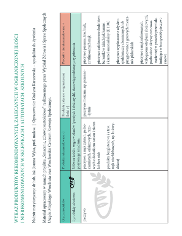 produkty bezglutenowe i z tzw. mąk niechlebowych, np. kukurydzianej pieczywo z mąk rafinowanych, wzbogacone otrębami zbożowymi, pozbawione okrywy owocowo-nasiennej w procesie przemiału, imitujące w ten sposób pieczywo razowe pieczywo wypieczone z użyciem spulchniaczy chemicznych lub przygotowane z gotowych mieszanek piekarskich pieczywo zafałszowane dodatkiem barwników takich jak karmel i karmel amoniakalny (E 150c) pieczywo pszenne, tzw. białe, z rafinowanych mąk pieczywo: z mąk żytnich, pełnoziarnistych, orkiszowych, razowych z dodatkiem nasion i ziaren lub bez nich pieczywo pieczywo mieszane, np. pszenno-żytnie Główne źródło węglowodanów (prostych i złożonych), stanowią podstawę przygotowania pożywnego śniadania. Produkty nierekomendowane :-( I produkty zbożowe: Produkty zalecane w ograniczonej ilości :-| Produkty rekomendowane :-) Grupa produktów Materiał opracowany w ramach projektu „Smacznie, zdrowo,wartościowo” realizowanego przez Wydział Zdrowia i Spraw Społecznych Urzędu Miejskiego Wrocławia oraz Wrocławskie Centrum Rozwoju Społecznego. Nadzór merytoryczny: dr hab. inż. Joanna Wyka, prof. nadzw. | Opracowanie: Grażyna Karczewska – specjalista ds. żywienia WYKAZ PRODUKTÓW REKOMENDOWANYCH, ZALECANYCH W OGRANICZONEJ ILOŚCI I NIEREKOMENDOWANYCH W SKLEPIKACH I AUTOMATACH SZKOLNYCH Produkty rekomendowane :-) Podstawą jest pieczywo oraz dodatki: - masło 82% tł., oliwa, - warzywa świeże, sezonowe: sałaty dostępne na rynku, papryka różnokolorowa, pomidor, zielony ogórek, rzodkiewka, kiszone ogórki, zielenina - wędliny i mięsa: wysokiej jakości, najlepiej pieczone w całości z mięs (drobiu, wieprzowiny i wołowiny) - wędlina sklepowa: szynka i polędwica – pieczone, wędzone, surowe dojrzewające, suszone kiełbasy (kabanosy, kiełbasa krakowska) - jaja i pasty z ugotowanych, świeżych jaj, z dodatkiem ziół, przypraw i pestek - ryby i pasty rybne, przygotowane na bazie ryb świeżych, pieczonych – całe lub rozdrobnione, połączone z serami, warzywami i przyprawami oraz ziołami - sery świeże i naturalne – tzw. białe (sery kwasowe lub kwasowo-podpuszczkowe), kremowe lub twaróg z dodatkiem sezonowych warzyw, ziół i przypraw Grupa produktów kanapki - masło śmietankowe - kukurydza konserwowa - kiełbasa żywiecka - mięso drobiowe i wieprzowe w blokach - mięso i wędliny konserwowane z użyciem jedynie niewielkich ilości azotanów i azotynów (E 249, E 250, E 251, 252) - pasty z dodatkiem jogurtu naturalnego, masła, z niewielkim procentowym udziałem majonezu oraz musztardy - ryby i pasty rybne, przygotowane na bazie ryb wędzonych oraz konserw rybnych – całe lub rozdrobnione - sery dojrzewające – pleśniowe z porostem pleśni (np. brie, camembert) lub przerostem pleśni (np. lazur, roquefort) - grzanki i zapiekane kanapki, pod warunkiem zachowania wysokiej wartości żywieniowej, wykorzystania produktów świeżych, naturalnych, przygotowanych przez ajenta lub na jego zamówienie, po spełnieniu i potwierdzeniu wymogów stawianych przez właściwe służby Produkty zalecane w ograniczonej ilości :-| - margaryny, szczególnie twarde - warzywa marynowane i pikle - produkty wysoko przetworzone, uzyskane z surowca o niskiej jakości, drobno zmielone - pasztety, pasztetowe, parówki, mortadela - wyroby seropodobne - kanapki typu fast food – hot dogi, knysze, zapiekanki, pizza, hamburgery, gyros, kebab Produkty nierekomendowane :-( Produkty rekomendowane :-) - sery tzw. żółte – sery podpuszczkowe – dojrzewające: typu szwajcarskiego (np. emmentaler), holenderskiego (np. gouda), angielskiego (np. cheddar) lub włoskiego (np. parmezan), oraz sery z masy parzonej – oscypek, - pasty na bazie sera, tzw. białego i żółtego, powstałe w wyniku rozdrobnienia serów i połączenia ich z dodatkami: świeże, sezonowe warzywa i owoce, zioła – świeże i suszone, naturalne przyprawy, jogurt naturalny, śmietana naturalna, mięsa gotowane i rozdrobnione do przygotowania pasty, szynka, ryby i konserwy rybne - musli i ekspandowane przetwory zbożowe, tzw. preparowane ziarno zbożowe ziaren: ryżu, w tym naturalnego pełnoziarnistego, orkiszu, amarantusa, kaszy jaglanej, pszenicy, owsa, kukurydzy, jęczmienia - musli z suszonymi owocami, nasionami, pestkami i orzechami, stanowiące wartościową przekąskę oraz dodatek do produktów mlecznych i przecierów owocowych Grupa produktów kanapki przetwory zbożowe Produkty zalecane w ograniczonej ilości :-| - płatki, w tym musli i ekspandowane przetwory zbożowe słodzone, barwione, aromatyzowane - smażone na tłuszczu prażynki Produkty nierekomendowane :-( ciastka i batony musli - domowe ciasta - ciasteczka - muffinki - tarteletki wypieki cukiernicze Przygotowane według tradycyjnych receptur, spełniające kryteria jak dla pozostałych wyrobów cukierniczych, zawierające w swoim składzie: Tłuszcze stosowane w recepturach to: - oliwa - olej rzepakowy - olej ryżowy - masło Wypiekane z mąk razowych, pełnoziarnistych, orkiszowych i bezglutenowych – np. kukurydzianych. Z dodatkiem świeżych, suszonych i mrożonych owoców oraz ziaren, nasion i orzechów. W wersji „na słono” z warzywami, pieczarkami, serami dojrzewającymi, masą jajeczną i jogurtową, z dodatkiem świeżych i suszonych ziół i przypraw. Produkty rekomendowane :-) Grupa produktów Z dodatkiem czekolady w postaci kawałków lub jednostronnej polewy. - bez dodatku cukru lub z dodatkiem niewielkich ilości, z możliwością zastąpienia cukru substancjami słodzącymi, jak miód naturalny czy ksylitol - słone i słodkie wypieki cukiernicze oraz w postaci bułek drożdżowych, przygotowanych według tradycyjnych receptur z wykorzystaniem naturalnych składników, takich jak owoce, bakalie, warzywa (cebula, czosnek, pomidory, pieczarki), przeciery, zioła, oraz masy na bazie sera twarogowego Produkty zalecane w ograniczonej ilości :-| - płatki zbóż lub inne przetwory zb