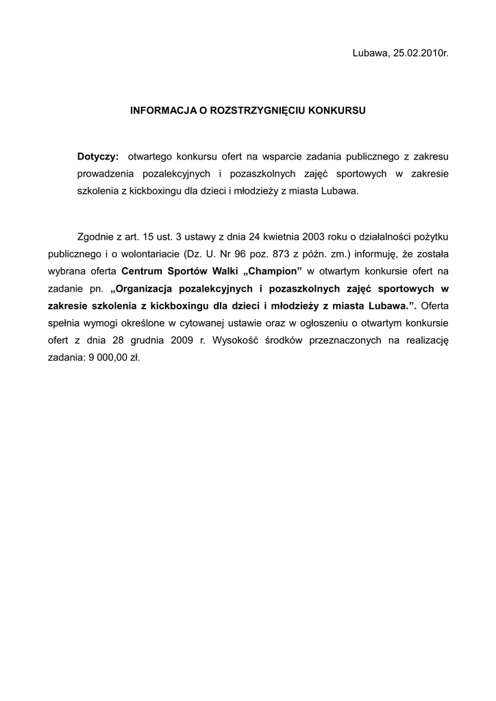 Lubawa, 25.02.2010r. INFORMACJA O ROZSTRZYGNIĘCIU KONKURSU Dotyczy: otwartego konkursu ofert na wsparcie zadania publicznego z zakresu prowadzenia pozalekcyjnych i pozaszkolnych zajęć sportowych w zakresie szkolenia z kickboxingu dla dzieci i młodzieży z miasta Lubawa. Zgodnie z art. 15 ust. 3 ustawy z dnia 24 kwietnia 2003 roku o działalności pożytku publicznego i o wolontariacie (Dz. U. Nr 96 poz. 873 z późn. zm.) informuję, że została wybrana oferta Centrum Sportów Walki „Champion” w otwartym konkursie ofert na zadanie pn. „Organizacja pozalekcyjnych i pozaszkolnych zajęć sportowych w zakresie szkolenia z kickboxingu dla dzieci i młodzieży z miasta Lubawa.”. Oferta spełnia wymogi określone w cytowanej ustawie oraz w ogłoszeniu o otwartym konkursie ofert z dnia 28 grudnia 2009 r. Wysokość środków przeznaczonych na realizację zadania: 9 000,00 zł.