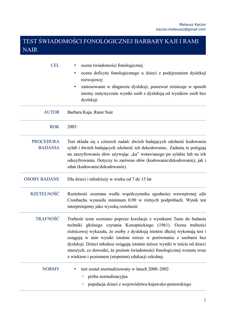 Mateusz Kaczor [email protected] TEST ŚWIADOMOŚCI FONOLOGICZNEJ BARBARY KAJI I RAMI NAIR CEL AUTOR ROK PROCEDURA BADANIA OSOBY BADANE • ocena świadomości fonologicznej • ocena deficytu fonologicznego u dzieci z podejrzeniem dysleksji rozwojowej • zastosowanie w diagnozie dysleksji, ponieważ różnicuje w sposób istotny statystycznie wyniki osób z dysleksją od wyników osób bez dysleksji. Barbara Kaja, Rami Nair 2003 Test składa się z czterech zadań: dwóch badających zdolność kodowania sylab i dwóch badających zdolność ich dekodowania.. Zadania te polegają na zaszyfrowaniu słów używając „ka” wstawianego po sylabie lub na ich odszyfrowaniu. Dotyczy to zarówno słów (kodowanie/dekodowanie), jak i zdań (kodowanie/dekodowanie). Dla dzieci i młodzieży w wieku od 7 do 15 lat RZETELNOŚĆ Rzetelność oceniana wedle współczynnika zgodności wewnętrznej alfa Cronbacha wynosiła minimum 0,90 w różnych podpróbach. Wynik ten interpretujemy jako wysoką rzetelność TRAFNOŚĆ Trafność testu oceniano poprzez korelacje z wynikami Testu do badania techniki głośnego czytania Konopnickiego (1961). Ocena trafności różnicowej wykazała, że osoby z dysleksją istotnie dłużej wykonują test i osiągają w nim wyniki istotnie niższe w porównaniu z osobami bez dysleksji. Dzieci młodsze osiągają istotnie niższe wyniki w teście od dzieci starszych, co dowodzi, że poziom świadomości fonologicznej wzrasta wraz z wiekiem i poziomem (stopniem) edukacji szkolnej. NORMY • test został znormalizowany w latach 2000–2002 ◦ próba normalizacyjna ◦ populacja dzieci z województwa kujawsko-pomorskiego 1 ◦ wiek od 7 do 15 lat ◦ losowanie wielostopniowe, warstwowo-grupowe ◦ liczebność próby 1069, zróżnicowane liczebności dla poszczególnych poziomów wieku ŹRÓDŁA Strona 2 • skala stenowa • normy dla dzieci w wieku od 7–15 roku życia, w rocznych przedziałach. Kaja, B., Nair, R., & Zając, M. (2003). Normalizacja Testu Świadomości Fonologicznej i jego zastosowanie w diagnozie dysleksji. W: B. Kaja (red.), Diagnoza dysleksji, 70-94. Bydgoszcz: Wydawnictwo Naukowe Akademii Bydgoskiej.