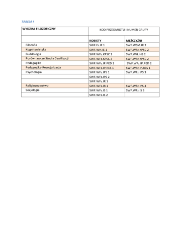 TABELA I WYDZIAŁ FILOZOFICZNY KOD