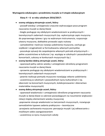 Wymagania edukacyjne z przedmiotu muzyka w II etapie edukacyjnym klasy 4 – 6 w roku szkolnym 2016/2017: ocenę celującą otrzymuje uczeń, który: - posiadł wiedzę i umiejętności znacznie wykraczające poza program nauczania muzyki w danej klasie - biegle posługuje się zdobytymi wiadomościami w praktycznych i teoretycznych zadaniach muzycznych (np. wykorzystuje zapis muzyczny do poprawnego śpiewu i gry na wybranym instrumencie, rozpoznaje utwory muzyczne, dokładnie prowadzi zapis nutowy - samodzielnie i twórczo rozwija uzdolnienia muzyczne, cechuje go szybkość i oryginalność w formułowaniu własnych pomysłów - poszukuje sytuacji do zaspokojenia własnych potrzeb artystycznych – pełne uczestnictwo w kulturze ( np. występy w szkolnych i pozaszkolnych koncertach, sukcesy w konkursach muzycznych itp.) ocenę bardzo dobrą otrzymuje uczeń, który: - opanował pełny zakres wiedzy i umiejętności określony programem nauczania muzyki w danej klasie - sprawnie posługuje się zdobytymi wiadomościami w praktycznych i teoretycznych zadaniach muzycznych - pewnie realizuje pomysły muzyczne rozwijając własne uzdolnienia - uczestniczą w szkolnym i pozaszkolnym życiu kulturalnym ( np. obecność na koncertach muzycznych, kolekcjonowanie i zbieractwo materiałów muzycznych) ocenę dobrą otrzymuje uczeń, który: - opanował wiadomości i umiejętności określone programem nauczania muzyki w danej klasie w zakresie pozwalającym na rozumienie większości relacji między elementami wiedzy muzycznej -poprawnie stosuje wiadomości w ćwiczeniach muzycznych, rozwiązuje samodzielnie typowe zadania praktyczno – teoretyczne -przejawia zachowania muzyczne: percepcja muzyki i jej odtwarzanie z możliwym sobie zaangażowaniem - uczestniczy w życiu muzycznym szkoły ocenę dostateczną otrzymuje uczeń, który: - opanował podstawowe treści programowe muzyki w zakresie umożliwiającym postępy w dalszym uczeniu się tego przedmiotu - rozwiązuje typowe zadania i ćwiczenia muzyczne o średnim stopniu trudności, czasem przy pomocy nauczyciela - przejawia niezdecydowanie i powściągliwość w działaniach muzycznych - preferuje rodzaj zachowań pro muzycznych: percepcja muzyki i jej odtwarzanie - uczestniczy w życiu szkoły ocenę dopuszczającą otrzymuje uczeń, który: - w ograniczonym zakresie opanował podstawowe wiadomości i umiejętności muzyczne określone programem nauczania w danej klasie - braki nie przekraczają możliwości uzyskania przez ucznia podstawowych sprawności i wiedzy muzycznej w ciągu dalszej nauki - rozwiązuje często przy pomocy nauczyciela zadania typowe o niewielkim stopniu trudności - przejawia brak pewności siebie, powściągliwość i niecierpliwość w działaniach muzycznych ( percepcja muzyki i jej odtwarzanie) - uczestniczy w życiu muzycznym szkoły ocenę niedostateczną otrzymuje uczeń, który: - nie opanował niezbędnego minimum programowego określonego programem nauczania muzyki w danej klasie - nie jest w stanie nawet przy pomocy nauczyciela rozwiązać zadania muzycznego o niewielkim (elementarnym) stopniu trudności - nie wykazuje chęci do zachowań pro muzycznych - nie uczestniczy w życiu muzycznym szkoły Nauczyciel muzyki Henryk Głębicki
