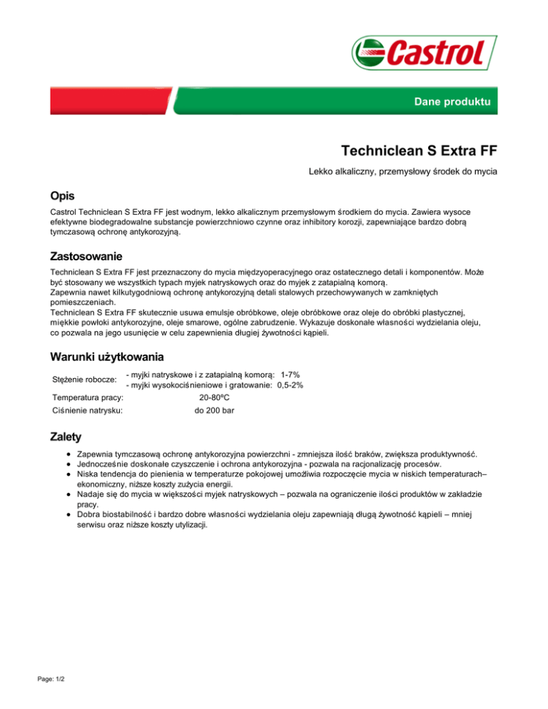 Dane produktu Techniclean S Extra FF Lekko alkaliczny, przemysłowy środek do mycia Opis Castrol Techniclean S Extra FF jest wodnym, lekko alkalicznym przemysłowym środkiem do mycia. Zawiera wysoce efektywne biodegradowalne substancje powierzchniowo czynne oraz inhibitory korozji, zapewniające bardzo dobrą tymczasową ochronę antykorozyjną. Zastosowanie Techniclean S Extra FF jest przeznaczony do mycia międzyoperacyjnego oraz ostatecznego detali i komponentów. Może być stosowany we wszystkich typach myjek natryskowych oraz do myjek z zatapialną komorą. Zapewnia nawet kilkutygodniową ochronę antykorozyjną detali stalowych przechowywanych w zamkniętych pomieszczeniach. Techniclean S Extra FF skutecznie usuwa emulsje obróbkowe, oleje obróbkowe oraz oleje do obróbki plastycznej, miękkie powłoki antykorozyjne, oleje smarowe, ogólne zabrudzenie. Wykazuje doskonałe własności wydzielania oleju, co pozwala na jego usunięcie w celu zapewnienia długiej żywotności kąpieli. Warunki użytkowania Stężenie robocze: - myjki natryskowe i z zatapialną komorą: 1-7% - myjki wysokociśnieniowe i gratowanie: 0,5-2% Temperatura pracy: 20-80ºC Ciśnienie natrysku: do 200 bar Zalety Zapewnia tymczasową ochronę antykorozyjna powierzchni - zmniejsza ilość braków, zwiększa produktywność. Jednocześnie doskonałe czyszczenie i ochrona antykorozyjna - pozwala na racjonalizację procesów. Niska tendencja do pienienia w temperaturze pokojowej umożliwia rozpoczęcie mycia w niskich temperaturach– ekonomiczny, niższe koszty zużycia energii. Nadaje się do mycia w większości myjek natryskowych – pozwala na ograniczenie ilości produktów w zakładzie pracy. Dobra biostabilność i bardzo dobre własności wydzielania oleju zapewniają długą żywotność kąpieli – mniej serwisu oraz niższe koszty utylizacji. Page: 1/2 Dane Techniczne Nazwa Metoda Jednostka Wartość Wygląd Wzrokowo - Klarowna, bezbarwna, jasnożółta ciecz Gęstość przy 20°C ASTM D 4052 kg/m³ 1050 Wartość pH (5% w wodzie demi) ASTM E 70-97 - 9,7 Powyższe dane są typowymi wartościami uzyskiwanymi przy normalnych tolerancjach produkcyjnych i nie stanowią specyfikacji technicznych. Zalecenia dotyczące stosowania Techniclean S Extra FF może być używany do mycia aluminium przy zachowaniu ostrożności. Należy wcześniej przeprowadzić próby w celu sprawdzenia czy nie powstają plamy oraz korozja ponieważ temperatura, stężenie i czas kontaktu z aluminium mają na to wpływ. Składowanie Aby zachować pełne właściwości produktu, kontener/pojemnik powinien być zawsze szczelnie zamknięty. Nie dopuszczać do przedostawania się wody, chronić przed przemrożeniem. Przechowywać w suchym i chłodnym pomieszczeniu w temperaturze: 5 – 45 °C, bez narażania na bezpośrednie działanie promieni słonecznych. Zalecane jest przechowywanie produktu, zawsze w szczelnie zamkniętych opakowaniach. W celu uzyskania bardziej szczegółowych informacji, prosimy o zapoznanie się z kartą bezpieczeństwa produktu. Techniclean S Extra FF 20 Jun 2016 Castrol, the Castrol logo and related marks are trademarks of Castrol Limited, used under licence. Prawne wylaczenie Karta produktu i informacje w niej zawarte sa aktualne w momencie jej tworzenie i wydruku. Jednakze , nie dajemy gwarancji ze prezentowane wyrazenia lub zasugerowane zwroty , sa dokladne, precyzyjne i kompletne. Dane zawarte sa oparte na testach wykonanych w warunkach laboratoryjnych i nalezy je traktowac jako wskazówke i ogólna informacje. Uzytkownikom radzimy upewnic sie ze korzystaja z najnowszej wersji karty danych. Uzytkownicy sa odpowiedzialni za bezpieczne uzycie produktu , zgodnie z zastosowaniem i odpowiednim doborem , stosujac sie do wszystkich odpowiednich regulacji i wymagan prawnych. Karta bezpieczenstwa produktu SDS jest dostepna dla wszystkich produktów i powinna byc wykorzystana dla odpowiedniego skladowania, bezpiecznego zastosowania, oraz usuwania , utylizacji produktu. BP , jej filie oraz podmioty wspólpracujace nie ponosza odpowiedzialnosci za jakiekolwiek szkody , zniszczenia i urazy bedace rezultatem nieodpowiedniego uzycia produktu , za jakiekolwiek awarie powstale w wyniku zastosowania niezgodnie z rekomendacja produktu oraz za zagrozenia wlasciwe dla natury i srodowiska . Wszystkie produkty , serwis , obsluga i informacje sa dostarczane zgodnie z standardowymi warunkami sprzedazy. Jesli wymagane sa dodatkowe informacje nalezy sie skontaktowac z lokalnym przedstawicielem sprzedazy. BP Europa SE Oddzial w Polsce, ul. Jasnogórska 1,, 31-358 Kraków, Biuro Handlowe: ul. Chlodna 51 00-867 Warszawa Tel: 0048 22 582 65 00 Fax: 0048 22 582 65 13 www.castrol.pl Page: 2/2