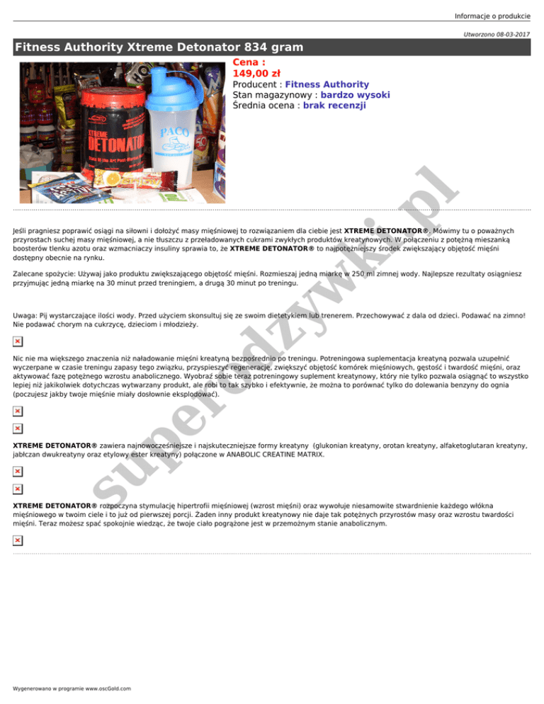 Informacje o produkcie Utworzono 08-03-2017 Fitness Authority Xtreme Detonator 834 gram Cena : 149,00 zł .p l Producent : Fitness Authority Stan magazynowy : bardzo wysoki Średnia ocena : brak recenzji ki Jeśli pragniesz poprawić osiągi na siłowni i dołożyć masy mięśniowej to rozwiązaniem dla ciebie jest XTREME DETONATOR®. Mówimy tu o poważnych przyrostach suchej masy mięśniowej, a nie tłuszczu z przeładowanych cukrami zwykłych produktów kreatynowych. W połączeniu z potężną mieszanką boosterów tlenku azotu oraz wzmacniaczy insuliny sprawia to, że XTREME DETONATOR® to najpotężniejszy środek zwiększający objętość mięśni dostępny obecnie na rynku. ro dz y w Zalecane spożycie: Używaj jako produktu zwiększającego objętość mięśni. Rozmieszaj jedną miarkę w 250 ml zimnej wody. Najlepsze rezultaty osiągniesz przyjmując jedną miarkę na 30 minut przed treningiem, a drugą 30 minut po treningu. Uwaga: Pij wystarczające ilości wody. Przed użyciem skonsultuj się ze swoim dietetykiem lub trenerem. Przechowywać z dala od dzieci. Podawać na zimno! Nie podawać chorym na cukrzycę, dzieciom i młodzieży. pe Nic nie ma większego znaczenia niż naładowanie mięśni kreatyną bezpośrednio po treningu. Potreningowa suplementacja kreatyną pozwala uzupełnić wyczerpane w czasie treningu zapasy tego związku, przyspieszyć regenerację, zwiększyć objętość komórek mięśniowych, gęstość i twardość mięśni, oraz aktywować fazę potężnego wzrostu anabolicznego. Wyobraź sobie teraz potreningowy suplement kreatynowy, który nie tylko pozwala osiągnąć to wszystko lepiej niż jakikolwiek dotychczas wytwarzany produkt, ale robi to tak szybko i efektywnie, że można to porównać tylko do dolewania benzyny do ognia (poczujesz jakby twoje mięśnie miały dosłownie eksplodować). su XTREME DETONATOR® zawiera najnowocześniejsze i najskuteczniejsze formy kreatyny (glukonian kreatyny, orotan kreatyny, alfaketoglutaran kreatyny, jabłczan dwukreatyny oraz etylowy ester kreatyny) połączone w ANABOLIC CREATINE MATRIX. XTREME DETONATOR® rozpoczyna stymulację hipertrofii mięśniowej (wzrost mięśni) oraz wywołuje niesamowite stwardnienie każdego włókna mięśniowego w twoim ciele i to już od pierwszej porcji. Żaden inny produkt kreatynowy nie daje tak potężnych przyrostów masy oraz wzrostu twardości mięśni. Teraz możesz spać spokojnie wiedząc, że twoje ciało pogrążone jest w przemożnym stanie anabolicznym. Wygenerowano w programie www.oscGold.com
