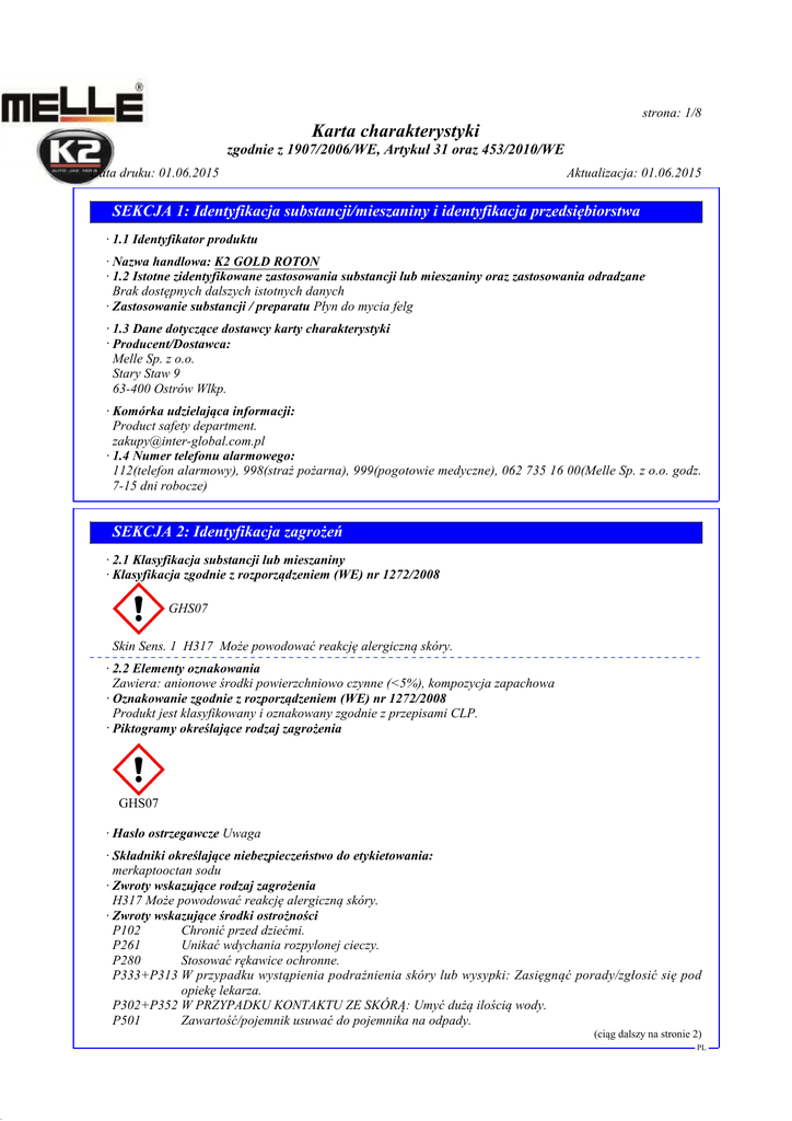 41.0 strona: 1/8 Karta charakterystyki zgodnie z 1907/2006/WE, Artykuł 31 oraz 453/2010/WE Data druku: 01.06.2015 Aktualizacja: 01.06.2015 SEKCJA 1: Identyfikacja substancji/mieszaniny i identyfikacja przedsiębiorstwa · 1.1 Identyfikator produktu · Nazwa handlowa: K2 GOLD ROTON · 1.2 Istotne zidentyfikowane zastosowania substancji lub mieszaniny oraz zastosowania odradzane Brak dostępnych dalszych istotnych danych · Zastosowanie substancji / preparatu Płyn do mycia felg · 1.3 Dane dotyczące dostawcy karty charakterystyki · Producent/Dostawca: Melle Sp. z o.o. Stary Staw 9 63-400 Ostrów Wlkp. · Komórka udzielająca informacji: Product safety department. [email protected] · 1.4 Numer telefonu alarmowego: 112(telefon alarmowy), 998(straż pożarna), 999(pogotowie medyczne), 062 735 16 00(Melle Sp. z o.o. godz. 7-15 dni robocze) SEKCJA 2: Identyfikacja zagrożeń · 2.1 Klasyfikacja substancji lub mieszaniny · Klasyfikacja zgodnie z rozporządzeniem (WE) nr 1272/2008 GHS07 Skin Sens. 1 H317 Może powodować reakcję alergiczną skóry. · 2.2 Elementy oznakowania Zawiera: anionowe środki powierzchniowo czynne (<5%), kompozycja zapachowa · Oznakowanie zgodnie z rozporządzeniem (WE) nr 1272/2008 Produkt jest klasyfikowany i oznakowany zgodnie z przepisami CLP. · Piktogramy określające rodzaj zagrożenia GHS07 · Hasło ostrzegawcze Uwaga · Składniki określające niebezpieczeństwo do etykietowania: merkaptooctan sodu · Zwroty wskazujące rodzaj zagrożenia H317 Może powodować reakcję alergiczną skóry. · Zwroty wskazujące środki ostrożności P102 Chronić przed dziećmi. P261 Unikać wdychania rozpylonej cieczy. P280 Stosować rękawice ochronne. P333+P313 W przypadku wystąpienia podrażnienia skóry lub wysypki: Zasięgnąć porady/zgłosić się pod opiekę lekarza. P302+P352 W PRZYPADKU KONTAKTU ZE SKÓRĄ: Umyć dużą ilością wody. P501 Zawartość/pojemnik usuwać do pojemnika na odpady. (ciąg dalszy na stronie 2) PL 41.0 strona: 2/8 Karta charakterystyki zgodnie z 1907/2006/WE, Artykuł 31 oraz 453/2010/WE Data druku: 01.06.2015 Aktualizacja: 01.06.2015 Nazwa handlowa: K2 GOLD ROTON (ciąg dalszy od strony 1) · 2.3 Inne zagrożenia · Wyniki oceny właściwości PBT i vPvB · PBT: Nie nadający się do zastosowania. · vPvB: Nie nadający się do zastosowania. SEKCJA 3: Skład/informacja o składnikach · 3.2 Charakterystyka chemiczna: Mieszaniny · Opis: Mieszanka: składająca się z niżej wymienionych składników wraz z bezpiecznymi domieszkami. · Składniki niebezpieczne: CAS: 367-51-1 merkaptooctan sodu 3-<10% EINECS: 206-696-4 Acute Tox. 3, H301; Met. Corr.1, H290; Acute Tox. 4, H312; Skin Sens. 1, H317 3-<10% CAS: 111-76-2 2-butoksyetanol EINECS: 203-905-0 Acute Tox. 4, H302; Acute Tox. 4, H312; Acute Tox. 4, H332; Reg.nr.: 01-2119475108-36 Skin Irrit. 2, H315; Eye Irrit. 2, H319 CAS: 126-92-1 sodium etasulfate <1% EINECS: 204-812-8 Eye Dam. 1, H318; Acute Tox. 4, H302; Skin Irrit. 2, H315 · Wskazówki dodatkowe: Pełna treść przytoczonych wskazówek dotyczących zagrożeń znajduje się w rozdziale 16. SEKCJA 4: Środki pierwszej pomocy · 4.1 Opis środków pierwszej pomocy · Wskazówki ogólne: Osoby porażone należy wynieść na świeże powietrze. · Po wdychaniu: Dostarczyć obficie świeże powietrze i dla bezpieczeństwa wezwać lekarza. W przypadku utraty przytomności ułożenie i transport w stabilnej pozycji bocznej. · Po styczności ze skórą: Natychmiast zmyć wodą i mydłem i dobrze spłukać. · Po styczności z okiem: Płukać oczy z otwartą powieką przez kilka minut pod bieżącą wodą. · Po przełknięciu: Przy trwałych dolegliwościach porozumieć się z lekarzem. · 4.2 Najważniejsze ostre i opóźnione objawy oraz skutki narażenia Brak dostępnych dalszych istotnych danych · 4.3 Wskazania dotyczące wszelkiej natychmiastowej pomocy lekarskiej i szczególnego postępowania z poszkodowanym Brak dostępnych dalszych istotnych danych SEKCJA 5: Postępowanie w przypadku pożaru · 5.1 Środki gaśnicze · Przydatne środki gaśnicze: CO2, proszek gaśniczy lub strumień wody. Większy pożar zwalczać strumieniem wody lub pianą odporną na działanie alkoholu. · 5.2 Szczególne zagrożenia związane z substancją lub mieszaniną Brak dostępnych dalszych istotnych danych · 5.3 Informacje dla straży pożarnej · Specjalne wyposażenie ochronne: Środki specjalne nie są konieczne. (ciąg dalszy na stronie 3) PL 41.0 strona: 3/8 Karta charakterystyki zgodnie z 1907/2006/WE, Artykuł 31 oraz 453/2010/WE Data druku: 01.06.2015 Aktualizacja: 01.06.2015 Nazwa handlowa: K2 GOLD ROTON (ciąg dalszy od strony 2) · Inne dane Zagrożone zbiorniki ochłodzić strumieniem wody. SEKCJA 6: Postępowanie w przypadku niezamierzonego uwolnienia do środowiska · 6.1 Indywidualne środki ostrożności, wyposażenie ochronne i procedury w sytuacjach awaryjnych Nie konieczne. · 6.2 Środki ostrożności w zakresie ochrony środowiska: Nie dopuścić do przeniknięcia do kanalizacji /wód powierzchniowych /wód gruntowych. · 6.3 Metody i materiały zapobiegające rozprzestrzenianiu się skażenia i służące do usuwania skażenia: Zebrać za pomocą materiału wiążącego ciecze (piasek, ziemia okrzemkowa, materiał wiążący kwasy, materiał wiążący uniwersalny, trociny). · 6.4 Odniesienia do innych sekcji Informacje na temat bezpiecznej obsługi patrz rozdział 7. Informacje na temat osobistego wyposażenia ochronnego patrz rozdział 8. Informacje na temat utylizacji patrz rozdział 13. SEKCJA 7: Postępowanie z substancjami i mieszaninami oraz ich magazynowanie · 7.1 Środki ostrożności dotyczące bezpiecznego postępowania Przy fachowym użyciu nie są potrzebne szczególne zabiegi. · Wskazówki dla ochrony przeciwpożarowej i przeciwwybuchowej: Nie są potrzebne szczególne zabiegi. · 7.2 Warunki bezpiecznego magazynowania, łącznie z informacjami dotyczącymi wszelkich wzajemnych niezgodności · Skła
