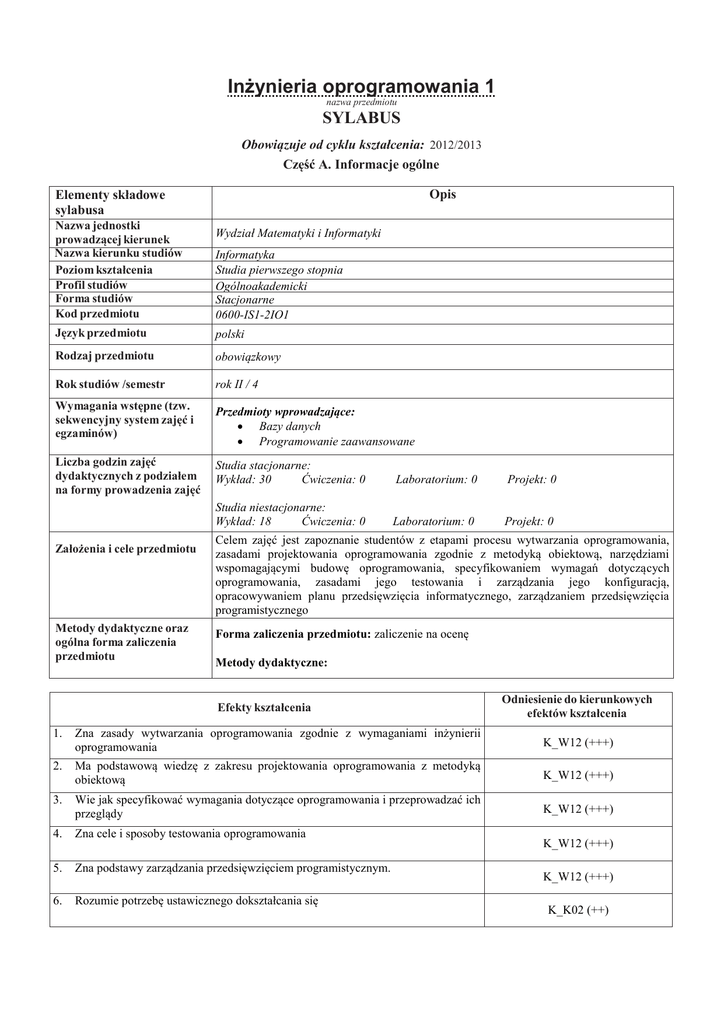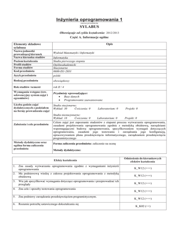 Inżynieria oprogramowania 1 nazwa przedmiotu SYLABUS Obowiązuje od cyklu kształcenia: 2012/2013 Część A. Informacje ogólne Elementy składowe sylabusa Opis Nazwa jednostki prowadzącej kierunek Nazwa kierunku studiów Poziom kształcenia Profil studiów Forma studiów Kod przedmiotu Wydział Matematyki i Informatyki Język przedmiotu polski Rodzaj przedmiotu obowiązkowy Rok studiów /semestr rok II / 4 Wymagania wstępne (tzw. sekwencyjny system zajęć i egzaminów) Przedmioty wprowadzające: Bazy danych Programowanie zaawansowane Liczba godzin zajęć dydaktycznych z podziałem na formy prowadzenia zajęć Studia stacjonarne: Wykład: 30 Ćwiczenia: 0 Laboratorium: 0 Projekt: 0 Studia niestacjonarne: Wykład: 18 Ćwiczenia: 0 Laboratorium: 0 Projekt: 0 Założenia i cele przedmiotu Metody dydaktyczne oraz ogólna forma zaliczenia przedmiotu Informatyka Studia pierwszego stopnia Ogólnoakademicki Stacjonarne 0600-IS1-2IO1 Celem zajęć jest zapoznanie studentów z etapami procesu wytwarzania oprogramowania, zasadami projektowania oprogramowania zgodnie z metodyką obiektową, narzędziami wspomagającymi budowę oprogramowania, specyfikowaniem wymagań dotyczących oprogramowania, zasadami jego testowania i zarządzania jego konfiguracją, opracowywaniem planu przedsięwzięcia informatycznego, zarządzaniem przedsięwzięcia programistycznego Forma zaliczenia przedmiotu: zaliczenie na ocenę Metody dydaktyczne: Efekty kształcenia Odniesienie do kierunkowych efektów kształcenia 1. Zna zasady wytwarzania oprogramowania zgodnie z wymaganiami inżynierii oprogramowania K_W12 (+++) 2. Ma podstawową wiedzę z zakresu projektowania oprogramowania z metodyką obiektową K_W12 (+++) 3. Wie jak specyfikować wymagania dotyczące oprogramowania i przeprowadzać ich przeglądy K_W12 (+++) 4. Zna cele i sposoby testowania oprogramowania 5. Zna podstawy zarządzania przedsięwzięciem programistycznym. 6. Rozumie potrzebę ustawicznego dokształcania się K_W12 (+++) K_W12 (+++) K_K02 (++) Punkty ECTS Bilans nakładu pracy studenta 2 Udział w zajęciach: - wykład 30 18 - laboratorium 0 0 - projekt 0 0 Przygotowanie do zajęć 8 12 Zapoznanie z literaturą 5 10 Przygotowanie do egzaminu 10 10 Przygotowanie do kolokwium 0 0 Czas trwania egzaminu 2 2 Sprawozdania, raporty z zajęć, prace domowe 0 0 Udział w konsultacjach 3 3 inne 0 0 Nakład pracy studenta związany z zajęciami: Wskaźniki ilościowe Data opracowania: Studia niestacjonarne Studia stacjonarne Aktywność Liczba godzin Punkty ECTS wymagającymi bezpośredniego udziału nauczyciela 35 1 o charakterze praktycznym 0 0 Koordynator przedmiotu: dr Anna Zalewska