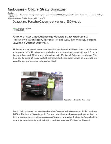 Nadbużański Oddział Straży Granicznej Źródło: http://www.nadbuzanski.strazgraniczna.pl/nos/aktualnosci/21078,Odzyskano-Porsche-Cayenne-o-wartosci-250-tys -zl.html Wygenerowano: Środa, 8 marca 2017, 05:01 Odzyskano Porsche Cayenne o wartości 250 tys. zł. Autor: Dariusz Sienicki 23.02.2017 Funkcjonariusze z Nadbużańskiego Oddziału Straży Granicznej z Placówki w Sławatyczach, odzyskali kolejne już w tym miesiącu Porsche Cayenne o wartości 250 tys. zł. 22 lutego br., na terenie drogowego przejścia granicznego w Sławatyczach - na kierunku wyjazdowym z Polski, zatrzymano pochodzący z przestępstwa, samochód marki Porsche Cayenne (rok prod. 2014) o szacunkowej wartości 250 tys. zł. Pojazdem podróżował 39 – letni ob. Białorusi. W czasie kontroli granicznej funkcjonariusze ustalili, iż samochód jest poszukiwany jako utracony na terytorium Rosji. Odzyskane Porsche Cayenne Jest to już kolejne w tym miesiącu Porsche Cayenne, odzyskane przez funkcjonariuszy NOSG z Placówki w Sławatyczach. Ten sam model auta odzyskano podczas kontroli na terenie drogowego przejścia granicznego w Sławatyczach w dniu 1 lutego br. Samochodem, utraconym również na terytorium Rosji, podróżował wówczas 55 – letni ob. Bialorusi. Odzyskane Porsche Cayenne Od początku roku funkcjonariusze z Nadbużańskiego Oddziału SG, zatrzymali pojazdy i podzespoły samochodowe pochodzące z przestępstwa o wartości prawie 3 mln zł.