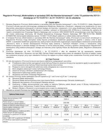 Regulamin Promocji „Multimedialna „Multimedialna w sprzedaży D2D dla Klientów biznesowych” biznesowych” z dnia 15 października 2013 r. obowiązuje od 15.10 15.10.2013 .10.2013 r. do 31.12.2013 31.12.2013 r. lub do odwołania 1. 2. 3. 1. 2. 3. § 1 Zasady ogólne Niniejszy Regulamin Promocji „Multimedialna w sprzedaży D2D dla Klientów biznesowych” z dnia 15.10.2013 r. (dalej „Regulamin Promocji”) określa warunki promocyjnego udostępnienia Modemów, Modemów z Routerem i aktywacji oraz świadczenia na rzecz Abonentów usług telekomunikacyjnych w zakresie dostępu do Internetu i związanych z nimi usług dodatkowych (dalej „Usługi”) przez spółkę pod firmą Cyfrowy Polsat Spółka Akcyjna z siedzibą i adresem w Warszawie (03–878) przy ul. Łubinowej 4a, wpisaną do rejestru przedsiębiorców Krajowego Rejestru Sądowego pod numerem KRS 0000010078, prowadzonego przez Sąd Rejonowy dla miasta stołecznego Warszawy, XIII Wydział Gospodarczy Krajowego Rejestru Sądowego, NIP 796-18-10-732, REGON 670925160, której kapitał zakładowy wynosi: 13 934 113,44 złotych wpłacony w całości (dalej „Cyfrowy Polsat”). Z niniejszej Promocji „Multimedialna w sprzedaży D2D dla Klientów biznesowych” (dalej „Promocja”) na warunkach określonych w Regulaminie Promocji mogą skorzystać osoby fizyczne prowadzące działalność gospodarczą zgodnie z ustawą z dnia 2 lipca 2004r. o swobodzie działalności gospodarczej, osoby prawne lub jednostki organizacyjne nieposiadające osobowości prawnej (dalej „Abonenci”), które w okresie obowiązywania Promocji będą zawierać z Cyfrowym Polsatem umowy o świadczenie usług telekomunikacyjnych w zakresie dostępu do Internetu w formie pisemnej (dalej „Umowa”), zgodnie z obowiązującym Regulaminem świadczenia usług telekomunikacyjnych dostępu do Internetu przez Cyfrowy Polsat dla Abonentów (dalej „Regulamin świadczenia Usług”). Promocja obowiązuje od dnia 15.10.2013 r. do 31.12.2013 r. albo do odwołania lub do wyczerpania zapasów Modemów/Modemów z Routerem lub kart SIM. Cyfrowy Polsat zastrzega sobie prawo do odwołania Promocji w każdym czasie bez podawania przyczyn, przy czym odwołanie Promocji nie wpływa na prawa nabyte przez uczestników Promocji przed dniem jej odwołania. § 2 Opis Promocji W celu skorzystania z Promocji konieczne jest łączne spełnienie następujących warunków: a) Przedłożenie dokumentów wymaganych przez Cyfrowy Polsat do zawarcia Umowy oraz wyrażenie zgody na sporządzenie i przechowywanie przez Cyfrowy Polsat kserokopii tychże dokumentów; b) Pozytywna ocena wiarygodności płatniczej osoby ubiegającej się o zawarcie Umowy; c) Brak zaległości płatniczych wobec Cyfrowego Polsatu; d) Zawarcie Umowy z Okresem podstawowym 24 miesięcy; e) Aktywowanie Cyklicznego pakietu danych; f) Akceptacja warunków niniejszego Regulaminu. W ramach Promocji osoba spełniająca warunki opisane w § 1 ust 2 oraz w § 2 ust. 1, otrzymuje: a) Obniżoną Opłatę aktywacyjną; b) Obniżoną Opłatę abonamentową przez czas trwania Okresu podstawowego/Okresów dodatkowych; c) Możliwość skorzystania z Promocyjnych Pakietów danych; d) Zwolnienie z Opłaty abonamentowej oraz opłaty za wybrany Cykliczny pakiet danych przez 4 Okresy rozliczeniowe (1 niepełny Okres rozliczeniowy i 3 pełne Okresy rozliczeniowe); e) Modem/Modem z Routerem w promocyjnej cenie w opcji na udostępnienie. Abonent w ramach Promocji ma możliwość zawarcia Umowy na następujących warunkach: Pakiet Promocyjny Multimedialny 1 GB Cykliczny Pakiet danych Oplata abonamentowa z VAT („Multimedialna”) Pakiet danych w ramach Opłaty abonamentowej („Multimedialna”) Opłata za Cykliczny pakiet danych z VAT Łączna opłata miesięczna z VAT Opłata aktywacyjna z VAT Cena za SMS wysłany z modemu (z VAT) Pakiet danych do wykorzystania miesięcznie w godzinach 07:00:0001:00:00 Cena 1 MB z VAT w godzinach 07:00:0001:00:00 po wykorzystaniu pakietów danych Pakiet Promocyjny Multimedialny 3 GB Pakiet Promocyjny Multimedialny 10 GB Pakiet Promocyjny Multimedialny 15 GB Pakiet Promocyjny Multimedialny 20 GB Pakiet Promocyjny Multimedialny 25 GB Pakiet Promocyjny Multimedialny 25 GB 6) 0,90 zł 200 MB 14 zł 14,90 zł 29 zł 29,90 zł 49 zł 49,90 zł 59 zł 59,90 zł 29 zł 0,20 zł 79 zł 79,90 zł 99 zł 99,90 zł 119 zł 119,90 zł 1 GB 3 GB 10 GB 15 GB 20 GB 25 GB 25 GB 0,02 zł Cyfrowy Polsat S.A. z siedzibą w Warszawie, ul. Łubinowa 4a, 03-878 Warszawa Sąd Rejonowy dla m.st. Warszawy, XIII Wydział Gospodarczy Krajowego Rejestru Sądowego KRS 0000010078 NIP 796-18-10-732 REGON 670925160, GIOŚ – E0001824WZBW Kapitał zakładowy 13.934.113,44 zł w pełni wpłacony Cena za 1 GB z VAT w godzinach 01:00:01-06:59:59 po wykorzystaniu pakietów danych 1 zł Kategorie ruchu bez limitu / dodatkowy limit wysłanych i odebranych danych do wykorzystania na określone kategorie ruchu. nie wliczane do limitu pakietu danych. 3) Bez limitu Halo, www.cyfrowypolsat.pl Serwisy społecznościowe Przeglądanie stron www - 3) Bez limitu - 3) Bez limitu 3) IPLA, HBO GO 3 GB 5 GB5) Bez limitu3) Wideo Darmowe Noce Brak2) BEZPŁATNIE Pakiet 50 GB do wykorzystania w godzinach 01:00:01-06:59:59. Nie dotyczy Pakietu 1 GB i 3 GB. Abonent ma możliwość aktywacji Pakietu Nocnego (50 GB do wykorzystania w godzinach 01:00:01-06:59:59) w cenie 10 zł/m-c. Zlecenie aktywacji złożyć można poprzez kontakt z COK lub za pomocą iCOK. Pakiet Nocny zostanie włączony z nowym Okresem rozliczeniowym. „Bez limitu” nie obejmuje niektórych treści i kategorii danych, wskazanych w §3 niniejszego Regulaminu promocji. Dodatkowy limit wysłanych i odebranych danych do wykorzystania na oglądanie treści wideo dostępnych w serwisie IPLA oraz HBO GO. Dodatkowy limit wysłanych i odebranych danych do wykorzystania na oglądanie treści wideo w wybranych serwisach. Pakiet 25 GB za 119 zł jest dostępny tylko dla Klienta, który poda