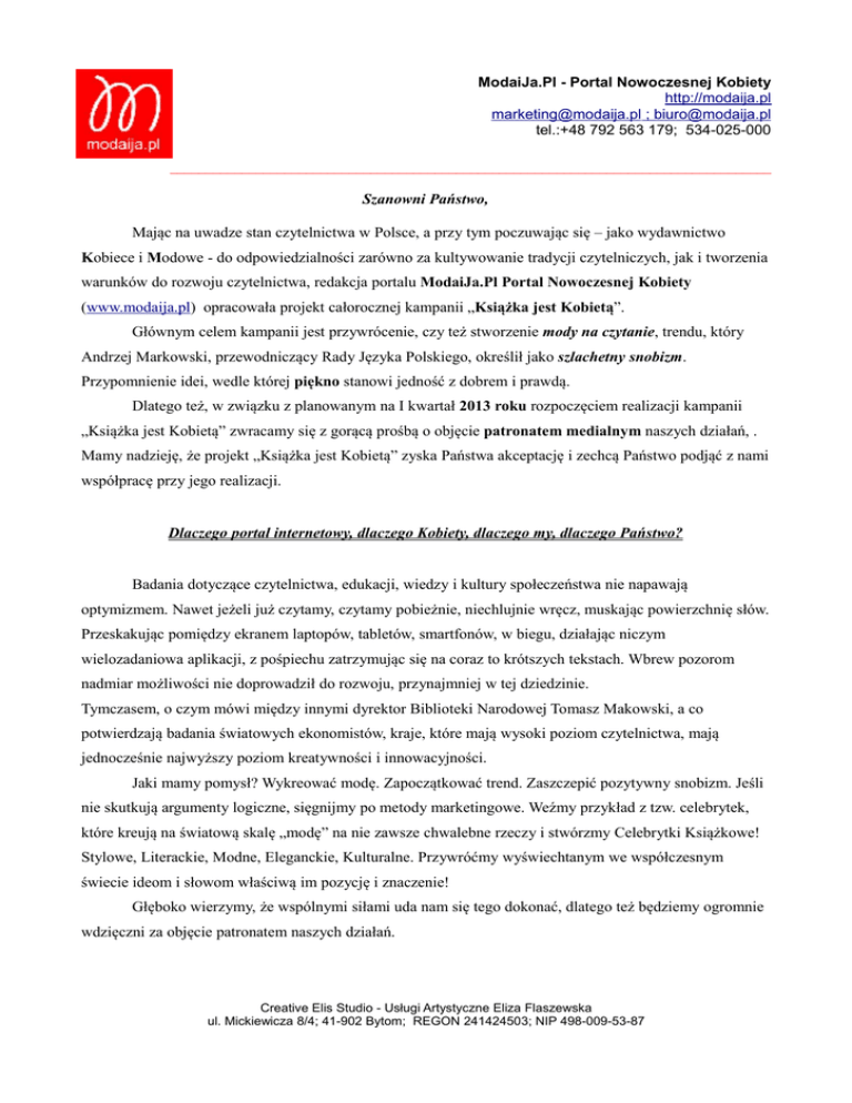 ModaiJa.Pl - Portal Nowoczesnej Kobiety http://modaija.pl [email protected] ; [email protected] tel.:+48 792 563 179; 534-025-000 ____________________________________________________________________________________ Szanowni Państwo, Mając na uwadze stan czytelnictwa w Polsce, a przy tym poczuwając się – jako wydawnictwo Kobiece i Modowe - do odpowiedzialności zarówno za kultywowanie tradycji czytelniczych, jak i tworzenia warunków do rozwoju czytelnictwa, redakcja portalu ModaiJa.Pl Portal Nowoczesnej Kobiety (www.modaija.pl) opracowała projekt całorocznej kampanii „Książka jest Kobietą”. Głównym celem kampanii jest przywrócenie, czy też stworzenie mody na czytanie, trendu, który Andrzej Markowski, przewodniczący Rady Języka Polskiego, określił jako szlachetny snobizm. Przypomnienie idei, wedle której piękno stanowi jedność z dobrem i prawdą. Dlatego też, w związku z planowanym na I kwartał 2013 roku rozpoczęciem realizacji kampanii „Książka jest Kobietą” zwracamy się z gorącą prośbą o objęcie patronatem medialnym naszych działań, . Mamy nadzieję, że projekt „Książka jest Kobietą” zyska Państwa akceptację i zechcą Państwo podjąć z nami współpracę przy jego realizacji. Dlaczego portal internetowy, dlaczego Kobiety, dlaczego my, dlaczego Państwo? Badania dotyczące czytelnictwa, edukacji, wiedzy i kultury społeczeństwa nie napawają optymizmem. Nawet jeżeli już czytamy, czytamy pobieżnie, niechlujnie wręcz, muskając powierzchnię słów. Przeskakując pomiędzy ekranem laptopów, tabletów, smartfonów, w biegu, działając niczym wielozadaniowa aplikacji, z pośpiechu zatrzymując się na coraz to krótszych tekstach. Wbrew pozorom nadmiar możliwości nie doprowadził do rozwoju, przynajmniej w tej dziedzinie. Tymczasem, o czym mówi między innymi dyrektor Biblioteki Narodowej Tomasz Makowski, a co potwierdzają badania światowych ekonomistów, kraje, które mają wysoki poziom czytelnictwa, mają jednocześnie najwyższy poziom kreatywności i innowacyjności. Jaki mamy pomysł? Wykreować modę. Zapoczątkować trend. Zaszczepić pozytywny snobizm. Jeśli nie skutkują argumenty logiczne, sięgnijmy po metody marketingowe. Weźmy przykład z tzw. celebrytek, które kreują na światową skalę „modę” na nie zawsze chwalebne rzeczy i stwórzmy Celebrytki Książkowe! Stylowe, Literackie, Modne, Eleganckie, Kulturalne. Przywróćmy wyświechtanym we współczesnym świecie ideom i słowom właściwą im pozycję i znaczenie! Głęboko wierzymy, że wspólnymi siłami uda nam się tego dokonać, dlatego też będziemy ogromnie wdzięczni za objęcie patronatem naszych działań. Creative Elis Studio - Usługi Artystyczne Eliza Flaszewska ul. Mickiewicza 8/4; 41-902 Bytom; REGON 241424503; NIP 498-009-53-87 Szczegółowe informacje dotyczące projektu oraz przywilejów oferowanych Patronom Medialnym znajdą Państwo zarówno na dedykowanej stronie www.ksiazka.modaija.pl, jak i w dołączonych załącznikach. Z wyrazami szacunku Eliza Flaszewska Właścicielka tel.: + 48 792 645 661 [email protected] Andrzej Kwaśniewski Redaktor Naczelny tel.: +48 534 025 000 [email protected] W ramach pakietu medialnego oferujemy: − możliwość posługiwania się tytułem Patron Medialny ogólnopolskiej kampanii „Książka jest Kobietą” we wszystkich publikacjach, − zamieszczenie Państwa logo w informacjach prasowych oraz na zaproszeniach wysyłanych drogą elektroniczną, − zamieszczenie nazwy Państwa wydawnictwa w informacjach i relacjach z działań kampanii, które na bieżąco ukazywać się będą w serwisie ModaiJa.Pl na stronie www.modaija.pl oraz w serwisach społecznościowych − zamieszczenie nazwy Państwa wydawnictwa w informacjach prasowych wysyłanych do mediów drukowanych i internetowych, − zamieszczenie Państwa logo na zaproszeniach oraz w materiałach prasowych i promocyjnych, − możliwość ustawienia roll-up’ów w przypadku organizacji konferencji, spotkań czy gali, − możliwość umieszczenia magazynów lub ulotek w gift packach w przypadku organizacji konferencji, spotkań czy gali, − pakiet zaproszeń dla redakcji w przypadku organizacji konferencji, spotkań czy gali. W zamian prosimy o: − zamieszczenie informacji zapowiadającej kampanię na łamach Państwa wydawnictwa, − zamieszczenie baneru lub linka (do podanej strony) zapowiadającego kampanię na łamach Państwa serwisu internetowego, − wysłanie newslettera z zaproszeniem do udziału w kampanii i/lub konkursach do bazy Państwa użytkowników, − publikację informacji prasowych z przebiegu działań w ramach kampanii, − zamieszczenie relacji podsumowującej kampanię − zamieszczenia relacji w przypadku organizacji konferencji, spotkań czy gali. Z przyjemnością oczekujemy na Państwa pytania i propozycje dotyczące zasad współpracy patronackiej. Creative Elis Studio - Usługi Artystyczne Eliza Flaszewska ul. Mickiewicza 8/4; 41-902 Bytom; REGON 241424503; NIP 498-009-53-87