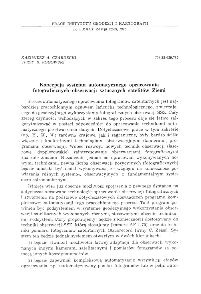 PRACE IN ST Y T U T U GEODEZJI I K A R TO G R AFII Т о т X XI I I , Z e s z y t 2(53), 1976 K A Z I M I E R Z A. C Z A R N E C K I JERZ Y B. R O G O W S K I 778.35:629.785 Koncepcja systemu automatycznego opracowania fotograficznych obserwacji sztucznych satelitów Ziemi Proces autom atycznego opracow ania fotogram ów satelitarn y ch jest n a j bardziej pracochłonnym ogniwem łańcucha technologicznego, zm ierzają cego do geodezyjnego w ykorzystania fotograficznych obserw acji SSZ. Cały szereg czynności wchodzących w zakres tego procesu daje się łatw o zalgorytm izow ać w postaci odpowiedniej do opracow ania technikam i au to m atycznego przetw arzania danych. Dotychczasowe prace w tym zakresie (np. [2], [3], [4]) zarów no krajow e, jak i zagraniczne, były bardzo ściśle wiązane z konkretnym i technologiam i obsferwacyjnymi (kam eram i, pro gram am i obserwacji). Wobec rozw oju now ych technik obserw acji (lase rowe, dopplerowskie) zainteresow anie obserw acjam i fotograficznym i znacznie zmalało. Niezależnie jednak od opracow ań w ykonyw anych no wym i technikam i, pew na liczba obserw acji pozycyjnych (fotograficznych) będzie m usiała być nadal w ykonyw ana, ze w zględu na konieczność po wiązania różnych system ów obserw acyjnych z fu ndam entalnym syste mem astronom icznym . Istn ieje więc ju ż obecnie możliwość spojrzenia z pewnego dystansu na dotychczas stosow ane technologie opracow ania obserw acji fotograficznych i stw orzenia na podstaw ie dotychczasow ych doświadczeń program u kom pleksow ej autom atyzacji tego pracochłonnego procesu. Taki program po w inien być podsystem em w system ie geodezyjnego w ykorzystania obser w acji satelitarn y ch w ykonanych różnym i, stosow anym i obecnie tech n ik a mi. Podsystem , k tó ry proponujem y, będzie z konieczności dostosow any do techniki obserw acji SSZ, k tó rą stosujem y (kam era AFU-75), oraz do tech niki pom iaru fotogram ów satelitarn y ch (Ascorecord firm y C. Zeiss). S y stem ten będzie jed n ak system em o tw arty m w dwóch kierunkach: 1) będzie stw arzał możliwości łatw ej ad aptacji dla obserw acji w yko nanych innym i kam eram i sa te litarn y m i i pom iarów fotogram ów za po mocą innych koordynatom etrów , 2) będzie zapew niał kom pleksow ą autom atyzację w szystkich etapów opracow ania, np. zautom atyzow any pom iar fotogram ów lub w pełni a u to 92 K a z im ie r z A. C zarnecki, J e rz y В. R o g o w s k i m atyczną identyfikację obiektów odwzorowanych na fotogram ie, poprzez zastosowanie katalogu gwiazd na kom puterow ych nośnikach inform acji. Zadaniem projektow anego system u będzie dostarczenie w artości topocentrycznych w spółrzędnych rów nikow ych sa te lity w m omencie synchro nicznym w ykonania fotogram u. System będzie oznaczany sym bolem „C O R SA T-System ”. 1. Założenia do System u „CO RSA T-System ” 1.2. Podział system u A utom atyczne opracow anie fotograficznych obserw acji satelitarnych można rozdzielić na cztery procesy: 1) pom iary w spółrzędnych prostokątnych obiektów odw zorow anych na fotogram ie satelitarnym , 2) identyfikacja gwiazd oporowych, 3) wyznaczenie w spółrzędnych topocentrycznych satelity w oznaczo nych m om entach (np. w m omencie synchronicznym ), 4) katalogow anie w yników obserw acji w ykonanych na różnych fo to gram ach (w różnych seansach), ew entualnie łącznie z obserw acjam i w yko nanym i innym i (niefotografieznym i) technikam i obserw acyjnym i. Sekw encja tych procesów jest taka, jak wyżej podano (patrz rów nież schem at 1). 1.3. Z asilanie system u in form acjam i W yodrębnim y trzy potoki inform acji o różnym pochodzeniu. 1. Inform acje dotyczące opracow yw anego fotogram u, a m ianowicie: a) dane o fotogram ie: num er, data w ykonania, m om ent synchronicz ny, liczba obiektów na fotogram ie, podlegających pom iarow i i opra cowaniu, b) w yniki pom iarów w spółrzędnych prostokątnych obiektów odwzo row anych na fotogram ie, c) dane do identyfikacji gwiazd oporowych: w spółrzędne katalogo we przynajm niej tró jk i gwiazd (num ery katalogow e p ary gwiazd w przypadku katalogu gwiazd na kom puterow ym nośniku in fo r macji). 2. W artości katalogow e w spółrzędnych gwiazd oporow ych i ruchów w łasnych gwiazd na opracow anym fotogram ie lub też zbiór (bank) danych system u w postaci katalogu gwiazd n a kom puterow ym nośniku in fo r m acji. K o n c e p c ja a u to m a ty c z n e g o o p ra c o w a n ia f o t o g r a m ó w S SZ 93 3. Zbiory w yników obserw acji SSZ technikam i ndefotograficznym i lub też w spółpraca system u z system am i opracow ania obserw acji laserow ych i dopplerowskich, w ykonyw anych przez tę sam ą stację satelitarną. 1.4. W yniki pracy system u „ C O R S A T -S ystem ” W w yniku opracow ania fotograficznych obserw acji satelitarn y ch za pomocą projektow anego system u m a powstać katalog topocentrycznych w spółrzędnych Sztucznych Satelitów Ziemi obserw ow anych przez daną stację. K atalog tak i pow inien zawierać: 1) w spółrzędne rów nikow e obserw ow anych położeń SSZ w m om en tach synchronicznych, 2) w spółrzędne godzinne tych położeń, 3) w artości pochodnych w spółrzędnych rów nikow ych względem czasu, 4) błędy średnie w spółrzędnych rów nikow ych ii godzinnych. System pow inien um ożliw iać w yznaczanie i kontrolę zm ienności p a ra m etrów optycznych kam ery satelitarn ej. 2. R ealizacja system u „C O R SA T-System ” na emc ODRA-1204 K om puter ODRA-1204 i urządzenia z nim w spółpracujące stw arzają pewne ograniczenia w realizacji system u „C O R SA T-System ”. Bez specjal nego przeznaczenia jakiegoś kom putera ODRA-1204 w yłącznie dla celów realizacji system u nie istnieje możliwość zgrom adzenia w pam ięci ze w nętrznej kom putera inform acji, k tóra m ogłaby stanow ić katalog gwiazd. N ajpraw dopodobniej nie będzie też m ożna — w sys