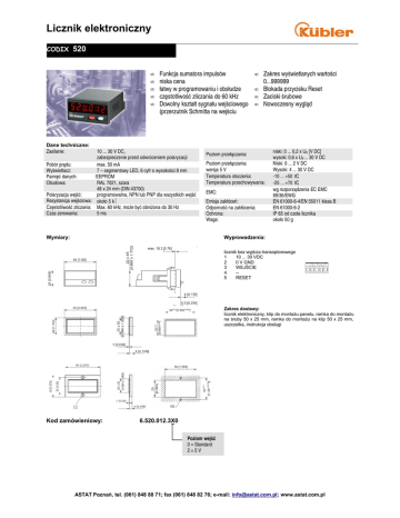 Licznik elektroniczny CODIX 520 • • • • • Funkcja sumatora impulsów niska cena łatwy w programowaniu i obsłudze częstotliwość zliczania do 60 kHz Dowolny kształt sygnału wejściowego (przerzutnik Schmitta na wejściu Dane techniczne: Zasilanie: 10 ... 30 V DC, zabezpieczenie przed odwróceniem polaryzacji Pobór prądu: max. 50 mA Wyświetlacz: 7 – segmentowy LED, 6 cyfr o wysokości 8 mm Pamięć danych: EEPROM Obudowa: RAL 7021, szara 48 x 24 mm (DIN 43700) Polaryzacja wejść: programowalna, NPN lub PNP dla wszystkich wejść Rezystancja wejściowa: około 5 kΩ Częstotliwość zliczania: Max. 60 kHz, może być obniżona do 30 Hz Czas zerowania: 5 ms Zakres wyświetlanych wartości 0...999999 • Blokada przycisku Reset • Zaciski śrubowe • Nowoczesny wygląd • Poziom przełączania: Poziom przełączania: wersja 5 V Temperatura otoczenia: Temperatura przechowywania: EMC: Emisja zakłóceń: Odporność na zakłócenia: Ochrona: Waga: Wymiary: niski: 0 ... 0,2 x UB [V DC] wysoki: 0,6 x UB ... 30 V DC Niski: 0 ... 2 V DC Wysoki: 4 ... 30 V DC -10 ... +50 °C -25 ... +70 °C wg rozporządzenia EC EMC 89/36/EWG EN 61000-6-4/EN 55011 klasa B EN 61000-6-2 IP 65 od czoła licznika około 50 g Wyprowadzenia: licznik bez wyjścia transoptorowego 1 10 ... 30 VDC 2 0 V GND 3 WEJŚCIE 4 -5 RESET Zakres dostawy: licznik elektroniczny, klip do montażu panelu, ramka do montażu na śruby 50 x 25 mm, ramka do montażu na klip 50 x 25 mm, uszczelka, instrukcja obsługi Kod zamówieniowy: 6.520.012.3X0 Poziom wejść 0 = Standard 2=5V ASTAT Poznań, tel. (061) 848 88 71; fax (061) 848 82 76; e-mail: [email protected]; www.astat.com.pl