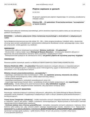 2017-03-08 05:00 www.artofbeauty.com.pl 1/3 Piękno zapisane w genach 02.09.2103 W genach zapisane jest piękno! Zapewniając im ochronę, przedłużamy młodość skóry! Ektoina MR − 15 patentów! Przeciwstarzeniowa "szczepionka” w twoim kremie Rewolucyjne odkrycie światowej kosmetologii, pilnie strzeżona tajemnica piękna skóry po raz pierwszy w polskich kosmetykach BIOGENIQ ― unikalne połączenie hitów światowej kosmetologii z ekstraktami z adaptywnych roślin Seria Biogeniq przeznaczona jest dla kobiet 35 – 60+, które pragną przedłużyć młodość skóry, skutecznie chroniąc geny przed uszkodzeniami i jednocześnie efektywnie likwidować oznaki upływającego czasu, takie jak zmarszczki, utrata gęstości czy wiotkość. INNOWACJE! · Rewolucyjne odkrycie światowej kosmetologii: Ektoina multirole - 15 patentów! · Skuteczność z natury dzięki nauce Biological Beauty Boosters - innowacyjne składniki aktywne o ogromnej sile przeciwdziałania starzeniu skóry uzyskane z adaptywnych roślin. · Wielopoziomowe podejście do odmładzania skóry: od genów piękna do wyraźnej poprawy wyglądu INNOWACJE! Pierwsze polskie kosmetyki oparte na REWOLUCYJNYM ODKRYCIU ŚWIATOWEJ KOSMETOLOGII: Ektoina Multirole (MR) – 15 patentów! Niezwykle skuteczny związek aktywny o niepowtarzalnych własnościach pielęgnacyjnych, wytwarzany przez mikroorganizmy żyjące w ekstremalnie trudnych warunkach, m.in. na pustyniach solnych. Ektoina niczym przeciwstarzeniowa „szczepionka”: - zapobiega uszkodzeniom błon komórkowych i DNA, aby opóźniać procesy starzenia się skóry; - chroni aparat immunologiczny skóry (układ odpornościowy skóry); - działa przeciwzapalnie; - zapobiega powstawaniu uszkodzeń powodowanych przez UV; - wspomaga regenerację tkanek skóry i prawidłową strukturę białek podporowych, aby zapobiegać wiotczeniu; - działa efektywnie przeciwzmarszczkowo, aby odmładzać wygląd; - zapewnia skuteczne, długoterminowe nawilżanie, aby poprawiać kondycję skóry. BIOLOGICAL BEAUTY BOOSTERS Poszukując najskuteczniejszych substancji aktywnych, odkryliśmy dla Ciebie Biological Beauty Boosters niezwykle cenne składniki z wyjątkowych adaptywnych roślin o silnym działaniu przeciwstarzeniowym i kondycjonującym. Trawa kunai (Imperata cylindrica) – źródło niezwykle cennych związków doskonale zatrzymujących wodę w naskórku, takich jak potas i DMSP o działaniu osmoregulującym. Wykorzystane w formułach kremów zapewniają skórze długotrwałe nawilżanie. - Królowa jednej nocy (Cereus grandiflorus) – kompleks niezwykle cennych substancji z kaktusa, który kwitnie tylko jedną noc, aby chronić płatki swojego wyjątkowego kwiatu. Zawiera m.in. flawonoidy i węglowodany o silnym działaniu ochronnym przeciwzapalnym, antyrodnikowym, nawilżającym, Korzystanie z artykułów publikowanych w portalu artofbeauty.com.pl dla celów komercyjnych bądź dokonywanie ich opracowań wymaga zgody wydawcy - spółki Estetica Polska. W tym celu prosimy o kontakt z Ewą Cesarz, [email protected] 2017-03-08 05:00 www.artofbeauty.com.pl 2/3 kondycjonującym i wygładzającym. - Ziele długowieczności (Gynostemma pentaphyllum) – bogate źródło gynosaponin – związków o niezwykłych własnościach stymulujących syntezę lipidów naskórka i odnawiających barierę skórną, przywracających jej prawidłowe funkcjonowanie. - Roślina piękna i młodości (Cistus incanus) – niezwykle bogate źródło polifenoli (zawiera ich trzy razy więcej niż zielona herbata) o działaniu przeciwzapalnym. Polifenole neutralizują wolne rodniki i zapobiegają reakcjom utleniania prowadzącym do uszkodzeń DNA komórkowego. Wielopoziomowe podejście do odmładzania skóry: OD GENÓW PIĘKNA DO WYRAŹNEJ POPRAWY WYGLĄDU Seria BIOGENIQ została stworzona tak, aby działać na kilku poziomach w skórze: chronić ukryte w komórkach „geny piękna” oraz z niezwykłą skutecznością pielęgnować wierzchnie warstwy skóry, dając efekt widocznej poprawy wyglądu. 35+ Krem chroniący młodość skóry w ciągu dnia SPF 15 Ektoina + trawa kunai + masło Shea ochrona genów + całodobowe nawilżenie przeciwzmarszczkowe Zaawansowany krem pomagający przedłużyć młodość skóry dzięki wszechstronnemu działaniu ochronnemu, naprawczemu i nawilżającemu. Łączy w sobie doskonałe własności pielęgnacyjne i ochronne Ektoiny MR z niesamowitymi zdolnościami ekstraktu z trawy kunai (Imperata cylindrica) do zatrzymywania wody w skórze. W efekcie otrzymano formułę dającą rewelacyjne, krótko- i długofalowe efekty nawilżające i kondycjonujące. Poj. 50ml, cena 49,00 zł 35+ Krem nawilżająco-wzmacniający dzień/noc Ektoina + trawa kunai + lipo-repair complex ochrona genów + 24 h nawilżenie przeciwzmarszczkowe + wzmocnienie naskórka Krem pomagający przedłużyć młodość skóry wyspecjalizowany w długotrwałym nawilżaniu przeciwstarzeniowym, ochronie genów i wzmocnieniu funkcji naskórka, dla kobiet w okolicach 35. r.ż. Doskonałe połączenie rewolucyjnych i zarazem niezwykłych składników jak Ektoina MR i trawa kunai z lipo-repair complex będącym mieszaniną cennych olei z awokado, oliwek i orzechów makadamia, zapewnia skórze doskonałą pielęgnację regenerująco-nawilżającą. Poj. 50ml, cena 49,00 zł 50+ Redukujący zmarszczki krem odżywczy dzień/noc Ektoina + Cereus grandiflorus + wektor kolagenowy ochrona genów + redukcja zmarszczek + poprawa jędrności Krem przeciwstarzeniowy wyspecjalizowany w redukcji zmarszczek, poprawie nawilżenia, jędrności i elastyczności skóry oraz w jej regeneracji. Idealnie dopasowany do potrzeb skóry dojrzałej z tendencją do przesuszania. Doskonałe połączenie Ektoiny MR z substancjami o działaniu przeciwzapalnym, antyrodnikowym, nawilżającym i kondycjonującym, które swoje źródło mają w roślinie zwanej królową jednej nocy, zapewnia rewelacyjne efekty regeneracji skóry, redukcji zmar