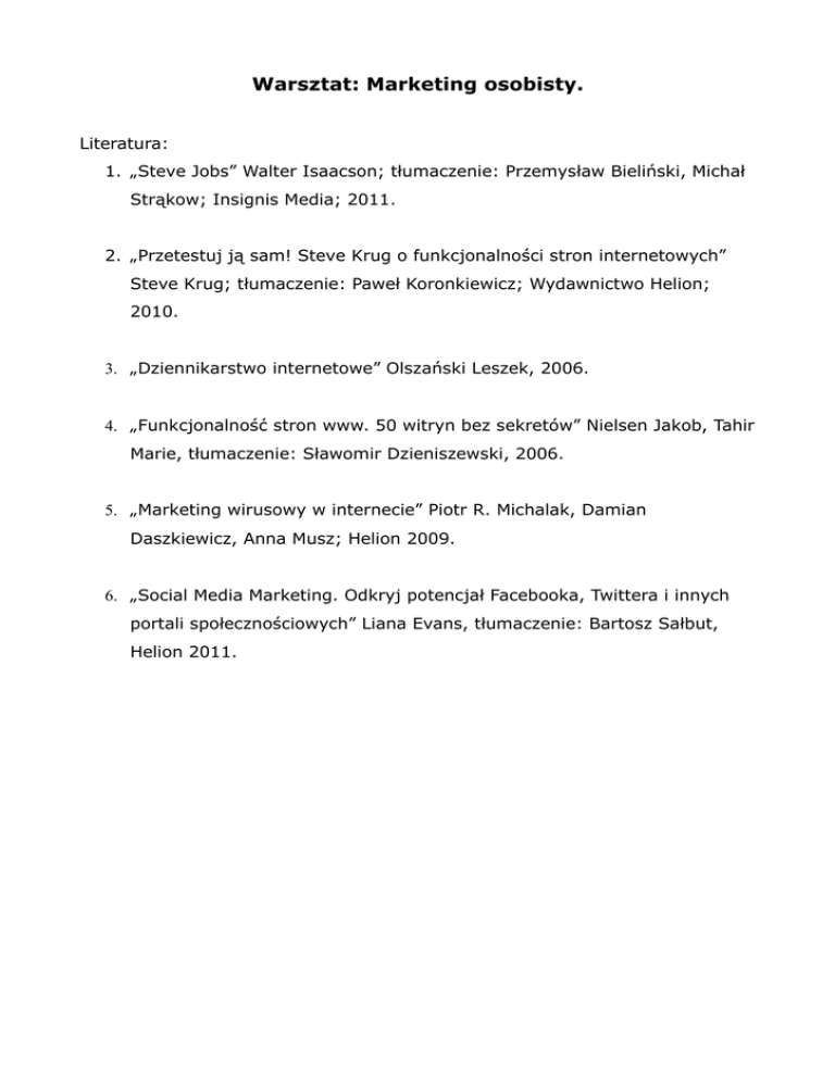 Warsztat: Marketing osobisty. Literatura: 1. „Steve Jobs” Walter Isaacson; tłumaczenie: Przemysław Bieliński, Michał Strąkow; Insignis Media; 2011. 2. „Przetestuj ją sam! Steve Krug o funkcjonalności stron internetowych” Steve Krug; tłumaczenie: Paweł Koronkiewicz; Wydawnictwo Helion; 2010. 3. „Dziennikarstwo internetowe” Olszański Leszek, 2006. 4. „Funkcjonalność stron www. 50 witryn bez sekretów” Nielsen Jakob, Tahir Marie, tłumaczenie: Sławomir Dzieniszewski, 2006. 5. „Marketing wirusowy w internecie” Piotr R. Michalak, Damian Daszkiewicz, Anna Musz; Helion 2009. 6. „Social Media Marketing. Odkryj potencjał Facebooka, Twittera i innych portali społecznościowych” Liana Evans, tłumaczenie: Bartosz Sałbut, Helion 2011.