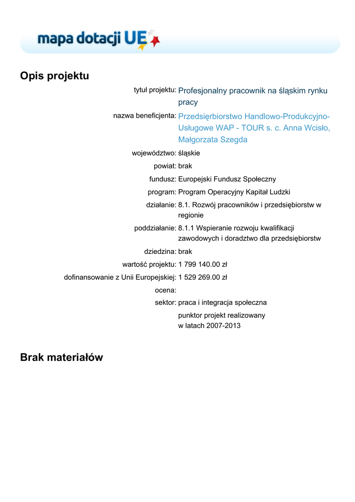 Opis projektu tytuł projektu: Profesjonalny pracownik na śląskim rynku pracy nazwa beneficjenta: Przedsięrbiorstwo Handlowo-Produkcyjno- Usługowe WAP - TOUR s. c. Anna Wcisło, Małgorzata Szegda województwo: śląskie powiat: brak fundusz: Europejski Fundusz Społeczny program: Program Operacyjny Kapitał Ludzki działanie: 8.1. Rozwój pracowników i przedsiębiorstw w regionie poddziałanie: 8.1.1 Wspieranie rozwoju kwalifikacji zawodowych i doradztwo dla przedsiębiorstw dziedzina: brak wartość projektu: 1 799 140.00 zł dofinansowanie z Unii Europejskiej: 1 529 269.00 zł ocena: sektor: praca i integracja społeczna punktor projekt realizowany w latach 2007-2013 Brak materiałów