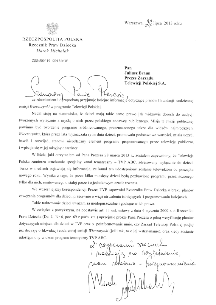 Warszaxsa. lipca 2013 roku RZECZPOSPOLITA POLSKA Rzecznik Praw t)ziecka Marek Michalak ZS 500 9 20i \1\5 Pan Juliusz Braun Prezes Zarządu Telewizji Polskiej S.A. ze zdumieniem i dzaprobatą przyjmuję kolejne informacje doty czące planow liku idaej i codziennej emisji Jriec:oi”ynk/ w programie Telew izji Polskiej. Nadal stoje na stanowisku, iż dzieci mąją takie samo prawo jak w idzow ic dorosli do aud\ cii tworzonych wy łacinie z ms ślą @ nich przez polskiego nadawcę publiczneco Misją teku uj i publicznej powinno bc tu oizenie pr cramu zróżnicow anego. przeznaczonego takie dla w idzow najmłodszch. U(eczorlnkLI. która przez ara w\ maczała rytm dnia dzieci. promowała podstauo\\ e \\ artoci. miała ucz\ ć. baw ic I romu ijac. tanow I nieodlączn\ element programu proponow anego przez telewizję publiczną i wpisuje sic w jej misy jus chaiakter W liscie, laki otrz\ i a[em od Pana Prezea 28 marca 2013 r.. zostałem zapew niony. Ż I elew uja Polska zamierza uruchomic specjalny kanał łematyczn\ leraz w mediach pojawiają noweg się TVP ABC. adresow an\ wy łącznie do dzieci. informacje, że kanał ten udostępniony zostanie telew idiom od początku roku. ynika z tego ze przez kilka miesięcy dzieci będą pozbawione pioeramu pizeznaczonego tylko dla nich. emitow aneit stałej poue i o jednakow\ m cLasie tr\\ ania. e wcześniejszej korespondencji Prezes FVP zapewniał Rzecznika Praw Dziecka zawęzania programow dla dzieci. przcciwnie o wizji utrwalenia istniejących Jakie traktowanie dzieci uważam za niedopuszczalne i godzące \\ związku z pow \ zsz\ in. \\ i @ braku planów irow amowaniu kolejnych ich prawa. na podstawie art. I I ust. ustaw\ z dnia 6 st\ cznia 2000 r. Praw Dziecka (Dz. k Nr 6. poz. 6Q z późn. zm.) uprzejmie proszę Pana Prezesa @ @ Rzeczniku pilną wei”y fikacje planów dot\cząc\Lh miejsca dla dzieci w I\ P oraz o poformowanie mnie. czy Zarząd Jelewizji Polskiej podjął już decyzję o likwidacji c dziennej emisji łJiec:on”nki (jesłi tak, to o jej wstrzymanie), raz kiedy zostanie udostępnion widzom prorram tematy czny TVP ABC. (ł\AQ - tO4-L w Eu