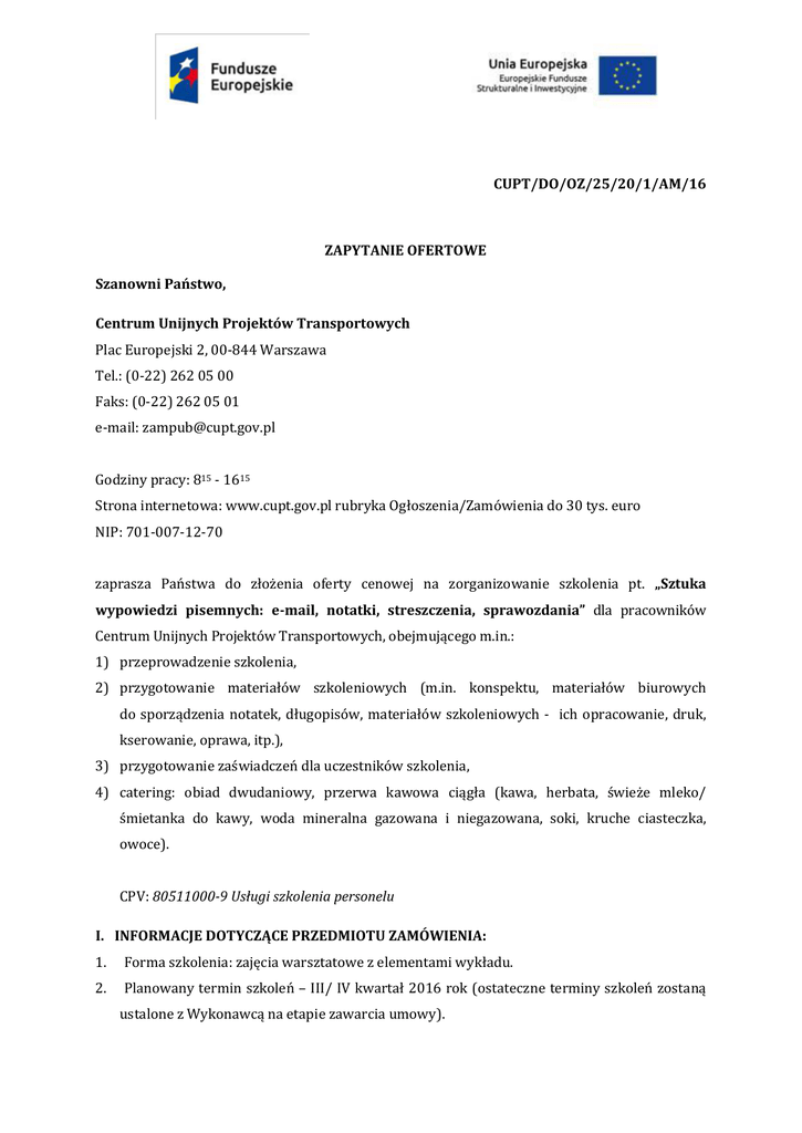 CUPT/DO/OZ/25/20/1/AM/16 ZAPYTANIE OFERTOWE Szanowni Państwo, Centrum Unijnych Projektów Transportowych Plac Europejski 2, 00-844 Warszawa Tel.: (0-22) 262 05 00 Faks: (0-22) 262 05 01 e-mail: [email protected] Godziny pracy: 815 - 1615 Strona internetowa: www.cupt.gov.pl rubryka Ogłoszenia/Zamówienia do 30 tys. euro NIP: 701-007-12-70 zaprasza Państwa do złożenia oferty cenowej na zorganizowanie szkolenia pt. „Sztuka wypowiedzi pisemnych: e-mail, notatki, streszczenia, sprawozdania” dla pracowników Centrum Unijnych Projektów Transportowych, obejmującego m.in.: 1) przeprowadzenie szkolenia, 2) przygotowanie materiałów szkoleniowych (m.in. konspektu, materiałów biurowych do sporządzenia notatek, długopisów, materiałów szkoleniowych - ich opracowanie, druk, kserowanie, oprawa, itp.), 3) przygotowanie zaświadczeń dla uczestników szkolenia, 4) catering: obiad dwudaniowy, przerwa kawowa ciągła (kawa, herbata, świeże mleko/ śmietanka do kawy, woda mineralna gazowana i niegazowana, soki, kruche ciasteczka, owoce). CPV: 80511000-9 Usługi szkolenia personelu I. INFORMACJE DOTYCZĄCE PRZEDMIOTU ZAMÓWIENIA: 1. Forma szkolenia: zajęcia warsztatowe z elementami wykładu. 2. Planowany termin szkoleń – III/ IV kwartał 2016 rok (ostateczne terminy szkoleń zostaną ustalone z Wykonawcą na etapie zawarcia umowy). 3. Miejsce Szkoleń: Warszawa – salę zapewnia Wykonawca. 4. Liczba pracowników do przeszkolenia: 50 osób +/- 3 osoby (w podziale na 3 grupy) Liczba dni szkoleniowych: 1 dzień (8 godzin szkoleniowych) dla każdej z trzech grup. Zamawiający za 1 godzinę szkolenia uważa 45 minut. 5. Każda z grup w oddzielnym terminie uzgodnionym z Wykonawcą. II. MERYTORYKA SZKOLENIA 1. Cel szkolenia: Udział w szkoleniu pozwoli pracownikom usystematyzować wiedzę z zakresu skuteczności i jakości wypowiedzi pisemnych, zasad prowadzenia służbowej korespondencji elektronicznej oraz zasad i technik opracowywania treści. Szkolenie w w/w zakresie jest niezbędne ze względu na realizowane zadania i obowiązki pełnione przez pracowników CUPT na zajmowanych stanowiskach, a także przyczyni się do efektywniejszej pracy. 2. Program szkolenia powinien zawierać przede wszystkim następujące zagadnienia: a) Wypowiedzi pisemne w praktyce administracji publicznej. Redagowanie pism urzędowych – z uwzględnieniem, skuteczności i jakości wypowiedzi pisemnych, zasad stylistycznych. b) Korespondencja elektroniczna –z uwzględnieniem zasad stawania i prowadzenia służbowej korespondencji elektronicznej, c) Sprawozdania - z uwzględnieniem celu, struktury i stylu wypowiedzi oraz odbiorcy dokumentów, d) Notatka służbowa – z uwzględnieniem celu, zasad, techniki opracowania treści, podziału pracy przy streszczeniach przygotowywanych zespołowo, e) Streszczenia: cele, zasady i techniki opracowywania treści, najczęściej stosowane struktury przygotowywania dokumentów, podział pracy przy streszczeniach przygotowywanych zespołowo; 3. Szkolenie powinno opierać się na wykładzie popartym w jak największej części przykładami. 4. Obszar działania i szczegółowy zakres szkolenia zostanie omówiony z Wykonawcą po zawarciu umowy na przeprowadzenie przedmiotowego szkolenia. III. WYMAGANIA DOTYCZĄCE WYKŁADOWCÓW (poniższe warunki należy spełnić łącznie) 1. Wykonawca musi zaproponować Wykładowcę, który posiada wykształcenie wyższe. 2. Zaoferowany przez Wykonawcę Wykładowca musi być ekspertem w zakresie tematyki sztuka wypowiedzi pisemnych: e-mail, notatki, streszczenia, sprawozdania oraz musi posiadać doświadczenie w przeprowadzeniu co najmniej 20 szkoleń dla jednostek budżetowych lub jednostek administracji publicznej o podobnej do przedmiotu zamówienia tematyce. W celu potwierdzenia doświadczenia zaproponowanego Wykładowcy, Wykonawca zobowiązany jest do przedłożenia wykazu, zgodnie z Załącznikiem nr 1 do zapytania ofertowego. IV. INFORMACJE DOTYCZĄCE WARUNKÓW SKŁADANIA OFERT: 1. Oferta powinna zawierać: 1) Formularz cenowy, zgodnie ze wzorem stanowiącym Załącznik nr 2 do zapytania ofertowego. 2) Wykaz doświadczenia zaproponowanego Wykładowcy, zgodnie z Załącznikiem nr 1 do zapytania ofertowego. 3) Życiorys trenera. 4) Szczegółowy program szkolenia, zawierający informację o ilości czasu przeznaczonego na poszczególne zagadnienia. V. KRYTERIA OCENY OFERT 1. Zamawiający dokona wyboru Oferty biorąc pod uwagę doświadczenie Wykładowcy, program szkolenia i cenę oferty. 2. Zamawiający wybierze Ofertę, która w największym stopniu spełni jego oczekiwania. VI. INFORMACJE DODATKOWE: 1. Przedmiotowe szkolenie w całości będzie finansowane ze środków publicznych (stosowne oświadczenie o zwolnieniu płatności z podatku VAT zostanie załączone przez Zamawiającego przy podpisywaniu umowy z wybraną firmą szkoleniową). Zamawiający prosi o uwzględnienie tego faktu przy składaniu oferty. 2. Wykonawca ma prawo złożyć tylko jedną ofertę. Złożenie przez tego samego Wykonawcę więcej niż jednej oferty lub oferty zawierającej alternatywę realizacji Przedmiotu zamówienia spowoduje odrzucenie wszystkich ofert złożonych przez danego Wykonawcę. 3. Dla zapewnienia porównywalności wszystkich ofert, Zamawiający zastrzega sobie prawo do skontaktowania się z właściwymi Wykonawcami, w celu uzupełnienia lub doprecyzowania ofert. 4. Zamawiający zastrzega sobie prawo do zmian i doprecyzowania przedstawionego przez Wykonawcę programu Szkolenia i przewiduje spotkanie, w celu dostosowania programu szkoleniowego do potrzeb CUPT i poznania specyfiki działalności CUPT. 5. Przy wyborze Oferty Zamawiający będzie kierował się całkowitą łączną ceną brutto Oferty. Cena podana w Ofercie powinna obejmować wszystkie koszty i składniki związane z wykonaniem zamówienia, m.in. przeszkolenie zgłoszonych osób, zapewnienie sali wykładowej, catering, przygotowanie materiałów szkoleniowych i zaświadczeń d