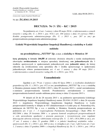 Łódzki Wojewódzki Inspektor Inspekcji Handlowej z siedzibą w Łodzi ul. Gdańska 38, 90 – 730 Łódź Łódź, dnia 08.06.2015 r. ..................................................... (oznaczenie organu Inspekcji Handlowej) Nr akt: ŻG.8361.19.2015 DECYZJA Nr 3 / ŻG – KC / 2015 Na podstawie art. 6 ust. 1 ustawy z dnia 09 maja 2014r. o informowaniu o cenach towarów i usług (Dz. U. z 2014 r. poz. 915) i art. 104 ustawy z dnia 14 czerwca 1960 r. Kodeks postępowania administracyjnego (Dz. U. z 2013 r., poz. 267 ze zm.) po przeprowadzeniu postępowania administracyjnego Łódzki Wojewódzki Inspektor Inspekcji Handlowej z siedzibą w Łodzi nakłada na przedsiębiorcę „NETTO” Sp. z o.o. z siedzibą w Motańcu 30 karę pieniężną w kwocie 200,00 zł (słownie: dwieście złotych) z tytułu niedopełnienia obowiązku uwidocznienia w miejscu sprzedaży detalicznej, cen jednostkowych dla 3 środków spożywczych w opakowaniach jednostkowych oraz jednostki miary do której odnosiła się uwidoczniona cena sprzedaży dla 1 środka spożywczego w opakowaniu jednostkowym wbrew postanowieniom art. 4 ust. 1 ustawy z dnia 09 maja 2014 r. o informowaniu o cenach towarów i usług (Dz. U. z 2014 r. poz. 915). Uzasadnienie Zgodnie z art. 79 ust. 1 ustawy z dnia 02 lipca 2004 r. o swobodzie działalności gospodarczej (Dz. U. z 2013 r. poz. 672 ze zm.) przedsiębiorca „NETTO” Sp. z o.o. z siedzibą w Motańcu pismem numer ŻG.8360.1.2015 z dnia 09 stycznia 2015 r. został zawiadomiony o zamiarze przeprowadzenia kontroli. Przedmiotowe zawiadomienie o zamiarze przeprowadzenia kontroli zostało odebrane przez stronę w dniu 12 stycznia 2015 r. W dniach od 26 do 28 stycznia 2015 r. na podstawie upoważnienia Łódzkiego Wojewódzkiego Inspektora Inspekcji Handlowej numer ŻG.8361.19.2015 z dnia 26 stycznia 2015 r. inspektorzy Wojewódzkiego Inspektoratu Inspekcji Handlowej w Łodzi przeprowadzili kontrolę w sklepie nr 453 zlokalizowanym w Łodzi przy ul. Pomorskiej 65a, należącym do NETTO Sp. z o.o. z siedzibą w Motańcu. Kontrolę przeprowadzono na podstawie art. 3 ust. 1 - 3 rozporządzenia Parlamentu Europejskiego i Rady (WE) Nr 882/2004 z dnia 29 kwietnia 2004 r. w sprawie kontroli urzędowych przeprowadzanych w celu sprawdzenia zgodności z prawem paszowym i żywnościowym oraz regułami dotyczącymi zdrowia zwierząt i dobrostanu zwierząt (Dz. U. L 165 z 30.4.2004 ze zm.), art. 17 ust. 3 ustawy z dnia 21 grudnia 2000 r. o jakości handlowej artykułów rolno – spożywczych (Dz. U. z 2014 r. poz. 669 ze zm.), w związku z art. 3 ust. 1 pkt 6 oraz art. 3 ust. 1, 2 ustawy z dnia 15 grudnia 2000 r. o Inspekcji Handlowej (tj. Dz. U. z 2014 r., poz. 148 ze 1 zm.) w obecności osób upoważnionych do reprezentowania kontrolowanego przedsiębiorcy … (w dniu 26 stycznia 2015r.) i …(w dniach 27 i 28 stycznia 2015r.). W trakcie kontroli sprawdzono m.in. przestrzeganie przez przedsiębiorcę przepisów ustawy z dnia 09 maja 2014 r. o informowaniu o cenach towarów i usług (Dz. U. z 2014 r. poz. 915) zwanej dalej „ustawą o informowaniu o cenach towarów i usług”. Kontrolą objęto 150 towarów (przetworów mlecznych, przetworów mięsnych, przetworów owocowo – warzywnych, wyrobów cukierniczych). W wyniku dokonania powyższych czynności stwierdzono, że dla 3 środków spożywczych w opakowaniach jednostkowych (mieszanki warzyw o masie netto 470g i masie po odsączeniu 282g, koncentratu pomidorowego Pudliszki, chałwy sezamowej) nie uwidoczniono cen jednostkowych, a dodatkowo dla chałwy sezamowej nie uwidoczniono jednostki miary, do której odnosiła się uwidoczniona cena sprzedaży co naruszało postanowienia art. 4 ust. 1 ustawy o informowaniu o cenach towarów i usług. Uwidocznieniem jest ujawnienie informacji wymaganych ustawą w taki sposób, aby były one czytelne, widoczne, łatwo i bezpośrednio dostępne dla nabywców i aby przeciętny konsument mógł się samodzielnie zaznajomić z danymi na temat ceny jednostkowej. Sposób uwidocznienia cen jednostkowych i jednostek miar jest określony w rozporządzeniu Ministra Finansów z dnia 10 czerwca 2002 r. w sprawie szczegółowych zasad uwidaczniania cen towarów i usług oraz sposobu oznaczania ceną towarów przeznaczonych do sprzedaży (Dz. U. z 2015 r. poz. 568), zwanym dalej „rozporządzeniem w sprawie szczegółowych zasad uwidaczniania cen”. Przedmiotowe rozporządzenie zgodnie z art. 25 ustawy o informowaniu o cenach towarów i usług zachowuje moc do dnia wejścia w życie przepisów wykonawczych wydanych na podstawie art. 4 ust. 2, nie dłużej jednak niż do dnia 31 grudnia 2015 r. W związku z nieuwidocznieniem, w miejscu sprzedaży detalicznej, cen jednostkowych dla 3 środków spożywczych w opakowaniach jednostkowych oraz jednostki miary dla 1 środka spożywczego w opakowaniu jednostkowym w dniu 09 kwietnia 2015 r. zostało wszczęte z urzędu postępowanie administracyjne w sprawie nałożenia na kontrolowanego przedsiębiorcę kary pieniężnej wynikającej z art. 6 ust. 1 ustawy o informowaniu o cenach towarów i usług. Strona została poinformowana o wszczęciu postępowania z urzędu oraz o przysługującym prawie do zapoznania się z aktami sprawy, wypowiedzenia się co do zebranych dowodów i materiałów, lecz z tego prawa nie skorzystała. Jednocześnie działając w oparciu o przepis art. 6 ust. 3 ustawy o informowaniu o cenach towarów i usług poproszono stronę o przesłanie informacji na temat wielkości obrotów i przychodu za rok 2014. Przedmiotowe pismo numer ŻG.8361.19.2015 zostało odebrane przez stronę w dniu 13 kwietnia 2015 r. Ponieważ kontrolowany przedsiębiorca nie przesłał informacji na temat wielkości obrotów i przychodu w dniu 07 maja 2015 r. pismem numer ŻG.8361.19.2015 poinformowano stronę o przedłużeniu terminu zakończenia toczącego się postępowania administracyjnego i ponownie poproszono o przesłanie informacji na temat wielkości obrotów i przych