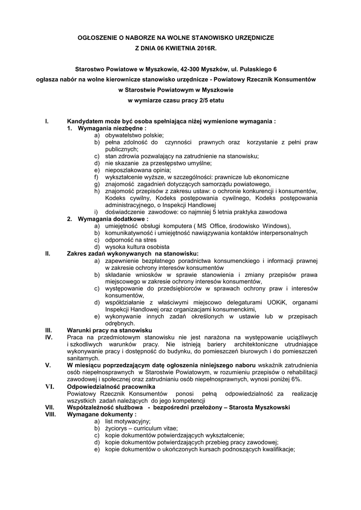 OGŁOSZENIE O NABORZE NA WOLNE STANOWISKO URZĘDNICZE Z DNIA 06 KWIETNIA 2016R. Starostwo Powiatowe w Myszkowie, 42-300 Myszków, ul. Pułaskiego 6 ogłasza nabór na wolne kierownicze stanowisko urzędnicze - Powiatowy Rzecznik Konsumentów w Starostwie Powiatowym w Myszkowie w wymiarze czasu pracy 2/5 etatu I. II. III. IV. V. VI. VII. VIII. Kandydatem może być osoba spełniająca niżej wymienione wymagania : 1. Wymagania niezbędne : a) obywatelstwo polskie; b) pełna zdolność do czynności prawnych oraz korzystanie z pełni praw publicznych; c) stan zdrowia pozwalający na zatrudnienie na stanowisku; d) nie skazanie za przestępstwo umyślne; e) nieposzlakowana opinia; f) wykształcenie wyższe, w szczególności: prawnicze lub ekonomiczne g) znajomość zagadnień dotyczących samorządu powiatowego, h) znajomość przepisów z zakresu ustaw: o ochronie konkurencji i konsumentów, Kodeks cywilny, Kodeks postępowania cywilnego, Kodeks postępowania administracyjnego, o Inspekcji Handlowej i) doświadczenie zawodowe: co najmniej 5 letnia praktyka zawodowa 2. Wymagania dodatkowe : a) umiejętność obsługi komputera ( MS Office, środowisko Windows), b) komunikatywność i umiejętność nawiązywania kontaktów interpersonalnych c) odporność na stres d) wysoka kultura osobista Zakres zadań wykonywanych na stanowisku: a) zapewnienie bezpłatnego poradnictwa konsumenckiego i informacji prawnej w zakresie ochrony interesów konsumentów b) składanie wniosków w sprawie stanowienia i zmiany przepisów prawa miejscowego w zakresie ochrony interesów konsumentów, c) występowanie do przedsiębiorców w sprawach ochrony praw i interesów konsumentów, d) współdziałanie z właściwymi miejscowo delegaturami UOKiK, organami Inspekcji Handlowej oraz organizacjami konsumenckimi, e) wykonywanie innych zadań określonych w ustawie lub w przepisach odrębnych. Warunki pracy na stanowisku Praca na przedmiotowym stanowisku nie jest narażona na występowanie uciążliwych i szkodliwych warunków pracy. Nie istnieją bariery architektoniczne utrudniające wykonywanie pracy i dostępność do budynku, do pomieszczeń biurowych i do pomieszczeń sanitarnych. W miesiącu poprzedzającym datę ogłoszenia niniejszego naboru wskaźnik zatrudnienia osób niepełnosprawnych w Starostwie Powiatowym, w rozumieniu przepisów o rehabilitacji zawodowej i społecznej oraz zatrudnianiu osób niepełnosprawnych, wynosi poniżej 6%. Odpowiedzialność pracownika Powiatowy Rzecznik Konsumentów ponosi pełną odpowiedzialność za realizację wszystkich zadań należących do jego kompetencji Współzależność służbowa - bezpośredni przełożony – Starosta Myszkowski Wymagane dokumenty : a) list motywacyjny; b) życiorys – curriculum vitae; c) kopie dokumentów potwierdzających wykształcenie; d) kopie dokumentów potwierdzających przebieg pracy zawodowej; e) kopie dokumentów o ukończonych kursach podnoszących kwalifikacje; oświadczenie kandydata o korzystaniu z pełni praw publicznych oraz pełnej zdolności do czynności prawnych i o niekaralności za przestępstwo popełnione umyślnie; g) oświadczenie kandydata o wyrażeniu zgody na przetwarzanie danych osobowych do celów rekrutacji opatrzone klauzulą : „Wyrażam zgodę na przetwarzanie moich danych osobowych zawartych w ofercie pracy dla potrzeb niezbędnych do realizacji procesu rekrutacji zgodnie z ustawą z dnia 29 sierpnia 1997r. o ochronie danych osobowych (tekst jednolity Dz. U. z 2015r., poz. 2135) oraz ustawą z dnia 22 marca 1990r. o pracownikach samorządowych (tekst jednolity Dz. U. z 2014r., poz. 1202 z późn. zm.)”. f) IX. Termin i miejsce składania dokumentów Dokumenty należy składać w zaklejonej kopercie, opatrzonej hasłem „Nabór na Powiatowego Rzecznika Konsumentów” w terminie do dnia 19 kwietnia 2016 r. w siedzibie Starostwa Powiatowego w Myszkowie, 42 – 300 Myszków ul. Pułaskiego 6,- sala obsługi interesanta - do godz. 15.00, lub pocztą na adres urzędu z dopiskiem „Nabór na Powiatowego Rzecznika Konsumentów”, decyduje data wpływu listu poleconego. X. Aplikacje, które wpłyną po terminie nie będą rozpatrywane. XI. Do oferty mogą być dołączone inne dokumenty, w tym opinie lub referencje z poprzednich miejsc pracy. XII. Kandydaci spełniający wymagania formalne określone w ogłoszeniu zostaną powiadomieni o terminie i miejscu przeprowadzenia testu i rozmowy kwalifikacyjnej indywidualnie – drogą telefoniczną bądź e-mailową. Myszków, dnia 06.04.2016 r. Starosta Myszkowski Dariusz Lasecki