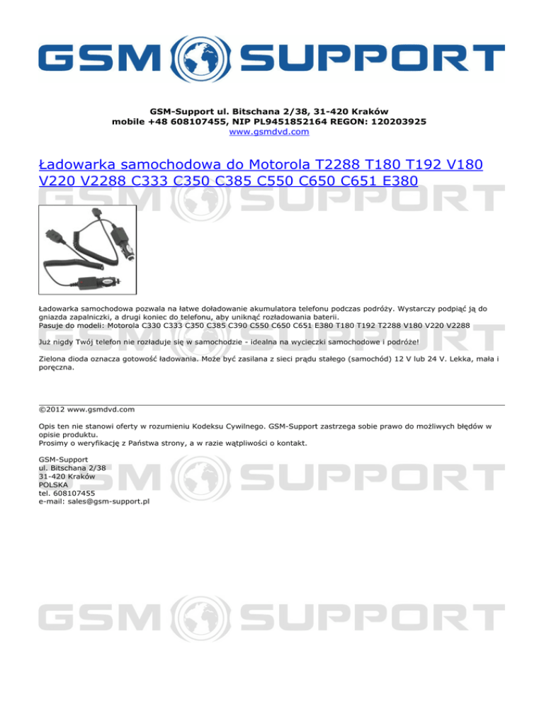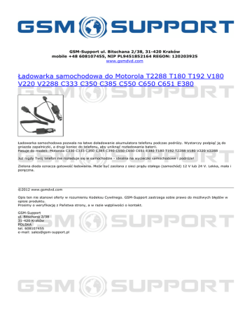 GSM-Support ul. Bitschana 2/38, 31-420 Kraków mobile +48 608107455, NIP PL9451852164 REGON: 120203925 www.gsmdvd.com Ładowarka samochodowa do Motorola T2288 T180 T192 V180 V220 V2288 C333 C350 C385 C550 C650 C651 E380 Ładowarka samochodowa pozwala na łatwe doładowanie akumulatora telefonu podczas podróży. Wystarczy podpiąć ją do gniazda zapalniczki, a drugi koniec do telefonu, aby uniknąć rozładowania baterii. Pasuje do modeli: Motorola C330 C333 C350 C385 C390 C550 C650 C651 E380 T180 T192 T2288 V180 V220 V2288 Już nigdy Twój telefon nie rozładuje się w samochodzie - idealna na wycieczki samochodowe i podróże! Zielona dioda oznacza gotowość ładowania. Może być zasilana z sieci prądu stałego (samochód) 12 V lub 24 V. Lekka, mała i poręczna. ©2012 www.gsmdvd.com Opis ten nie stanowi oferty w rozumieniu Kodeksu Cywilnego. GSM-Support zastrzega sobie prawo do możliwych błędów w opisie produktu. Prosimy o weryfikację z Państwa strony, a w razie wątpliwości o kontakt. GSM-Support ul. Bitschana 2/38 31-420 Kraków POLSKA tel. 608107455 e-mail: [email protected] Powered by TCPDF (www.tcpdf.org)