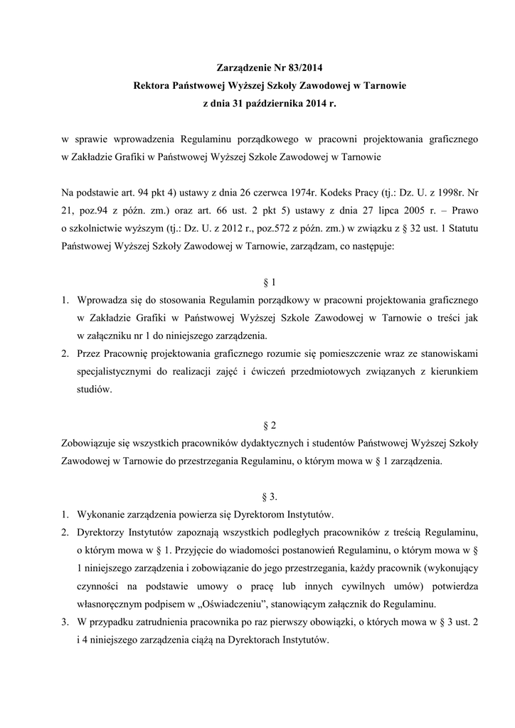Zarządzenie Nr 83/2014 Rektora Państwowej Wyższej Szkoły Zawodowej w Tarnowie z dnia 31 października 2014 r. w sprawie wprowadzenia Regulaminu porządkowego w pracowni projektowania graficznego w Zakładzie Grafiki w Państwowej Wyższej Szkole Zawodowej w Tarnowie Na podstawie art. 94 pkt 4) ustawy z dnia 26 czerwca 1974r. Kodeks Pracy (tj.: Dz. U. z 1998r. Nr 21, poz.94 z późn. zm.) oraz art. 66 ust. 2 pkt 5) ustawy z dnia 27 lipca 2005 r. – Prawo o szkolnictwie wyższym (tj.: Dz. U. z 2012 r., poz.572 z późn. zm.) w związku z § 32 ust. 1 Statutu Państwowej Wyższej Szkoły Zawodowej w Tarnowie, zarządzam, co następuje: §1 1. Wprowadza się do stosowania Regulamin porządkowy w pracowni projektowania graficznego w Zakładzie Grafiki w Państwowej Wyższej Szkole Zawodowej w Tarnowie o treści jak w załączniku nr 1 do niniejszego zarządzenia. 2. Przez Pracownię projektowania graficznego rozumie się pomieszczenie wraz ze stanowiskami specjalistycznymi do realizacji zajęć i ćwiczeń przedmiotowych związanych z kierunkiem studiów. §2 Zobowiązuje się wszystkich pracowników dydaktycznych i studentów Państwowej Wyższej Szkoły Zawodowej w Tarnowie do przestrzegania Regulaminu, o którym mowa w § 1 zarządzenia. § 3. 1. Wykonanie zarządzenia powierza się Dyrektorom Instytutów. 2. Dyrektorzy Instytutów zapoznają wszystkich podległych pracowników z treścią Regulaminu, o którym mowa w § 1. Przyjęcie do wiadomości postanowień Regulaminu, o którym mowa w § 1 niniejszego zarządzenia i zobowiązanie do jego przestrzegania, każdy pracownik (wykonujący czynności na podstawie umowy o pracę lub innych cywilnych umów) potwierdza własnoręcznym podpisem w „Oświadczeniu”, stanowiącym załącznik do Regulaminu. 3. W przypadku zatrudnienia pracownika po raz pierwszy obowiązki, o których mowa w § 3 ust. 2 i 4 niniejszego zarządzenia ciążą na Dyrektorach Instytutów. 4. Oświadczenie, o którym mowa w § 3 ust. 2, Dyrektor Instytutu jest zobowiązany złożyć w Rektoracie w terminie 7 dni od uzyskania podpisu pracownika. § 4. Zarządzenie wchodzi w życie z dniem podpisania. REKTOR prof. dr hab. Stanisław Komornicki PAŃSTWOWA WYŻSZA SZKOŁA ZAWODOWA W TARNOWIE Załącznik do Zarządzenia Nr 83/2014 Rektora PWSZ w Tarnowie z dnia 31 października 2014 r. REGULAMIN PORZĄDKOWY w PRACOWNI PROJEKTOWANIA GRAFICZNEGO §1 1. Regulamin porządkowy w pracowni projektowania graficznego dotyczy pracowników i studentów odbywających planowe i dodatkowe zajęcia dydaktyczne oraz innych osób korzystających z pracowni za zgodą władz Uczelni. W pracowni mogą przebywać wyłącznie osoby pod opieką prowadzącego. Zapisy niniejszego regulaminu stosuje się odpowiednio do innych osób korzystających z pracowni. 2. Prowadzący zajęcia przeprowadza dla studentów odbywających po raz pierwszy ćwiczenia w pracowni szkolenie w zakresie przepisów i zasad bhp oraz informuje o obowiązku stosowania się do zapisów niniejszego regulaminu studenci potwierdzają własnoręcznym podpisem udział w szkoleniu. 3. W przypadku, gdy stan techniczny pomieszczenia pracowni lub stan będącego na jej wyposażeniu sprzętu komputerowego i innych pomocy dydaktycznych może stwarzać zagrożenie dla bezpieczeństwa studentów, prowadzący jest obowiązany nie dopuścić do rozpoczęcia zajęć, wstrzymać zajęcia lub określić zadania i sposoby postępowania zapewniające bezpieczne prowadzenie tych zajęć. 4. Prowadzący jest dysponentem pracowni od chwili pobrania do czasu zwrotu klucza do portierni - jest obowiązany pozostawić pracownię w stanie niepogorszonym. 5. Studenci są obowiązani zgłosić prowadzącemu każdą zauważoną niesprawność lub uszkodzenie sprzętu w pracowni. §2 1. Studenci wchodzą do pracowni pod opieką prowadzącego i zajmują wyznaczone miejsca przy stanowiskach ćwiczeniowych. 2. W pracowni nie może przebywać więcej studentów niż to wynika z liczby stanowisk ćwiczeniowych. 3. Korzystanie ze sprzętu komputerowego i multimedialnego odbywa się na polecenie i pod nadzorem prowadzącego zajęcia. 4. Na wstępie zajęć każdorazowo studenci są obowiązani zapoznać się z zakresem przedmiotowym i sposobami bezpiecznego wykonywania planowanych ćwiczeń. 5. Studenci podczas zajęć powinni zachowywać się zgodnie ze standardami obowiązującymi na uczelniach. W przypadku, gdy student swoim zachowaniem: • dezorganizuje tok zajęć (przeszkadza bądź uniemożliwia ich prowadzenie), • budzi podejrzenie, że jest pod wpływem alkoholu lub środków odurzających, • stwarza zagrożenie dla bezpieczeństwa innych osób przebywających w pracowni, prowadzący może nakazać studentowi opuszczenie pracowni. 6. W przypadku zawinionej dewastacji pomieszczenia pracowni lub sprzętu znajdującego się w pracowni student ponosi koszty usunięcia wyrządzonej szkody. §3 1. 2. 3. Studentom odbywającym zajęcia w pracowni zabrania się: • samowolnego konfigurowania i zmieniania parametrów technicznych lub użytkowych sprzętu, • naprawiania sprzętu komputerowego, • spożywania posiłków i picia płynów. Studenci mają prawo: • oczekiwać pomocy od prowadzącego w rozwiązywaniu problemów związanych z tematem zajęć, • korzystać z danych i programów udostępnionych w systemie komputerowym, • korzystać z danych zainstalowanych na dysku zewnętrznym – za zgodą prowadzącego, • zapisywać pliki w wyznaczonych miejscach na dysku twardym. Studenci są zobowiązani: • każde zdarzenie wypadkowe na terenie pracowni zgłaszać prowadzącemu, • stosować się do przepisów bhp i p-poż. obowiązujących na terenie Uczelni. §4 1. Kanclerz PWSZ w Tarnowie na wniosek Dyrektora Instytutu sporządzony na wniosek studenta złożony na piśmie na początku roku akademickiego użycza pracownię projektowania graficznego do samodzielnego wykonywania pracy przez studenta poza planowymi godzinami dydaktycznymi – b