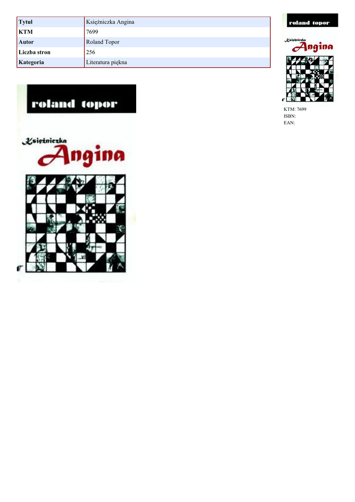 Tytuł Księżniczka Angina KTM 7699 Autor Roland Topor Liczba stron 256 Kategoria Literatura piękna KTM: 7699 ISBN: EAN: