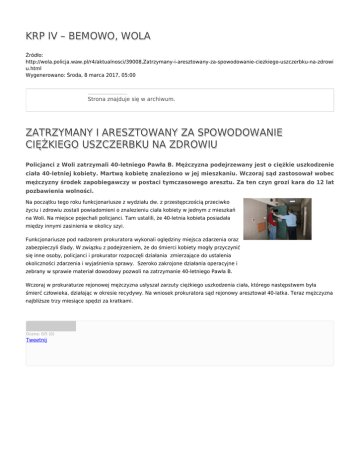 KRP IV – BEMOWO, WOLA Źródło: http://wola.policja.waw.pl/r4/aktualnosci/39008,Zatrzymany-i-aresztowany-za-spowodowanie-ciezkiego-uszczerbku-na-zdrowi u.html Wygenerowano: Środa, 8 marca 2017, 05:00 Strona znajduje się w archiwum. ZATRZYMANY I ARESZTOWANY ZA SPOWODOWANIE CIĘŻKIEGO USZCZERBKU NA ZDROWIU Policjanci z Woli zatrzymali 40-letniego Pawła B. Mężczyzna podejrzewany jest o ciężkie uszkodzenie ciała 40-letniej kobiety. Martwą kobietę znaleziono w jej mieszkaniu. Wczoraj sąd zastosował wobec mężczyzny środek zapobiegawczy w postaci tymczasowego aresztu. Za ten czyn grozi kara do 12 lat pozbawienia wolności. Na początku tego roku funkcjonariusze z wydziału dw. z przestępczością przeciwko życiu i zdrowiu zostali powiadomieni o znalezieniu ciała kobiety w jednym z mieszkań na Woli. Na miejsce pojechali policjanci. Tam ustalili, że 40-letnia kobieta posiadała między innymi zasinienia w okolicy szyi. Funkcjonariusze pod nadzorem prokuratora wykonali oględziny miejsca zdarzenia oraz zabezpieczyli ślady. W związku z podejrzeniem, że do śmierci kobiety mogły przyczynić się inne osoby, policjanci i prokurator rozpoczęli działania zmierzające do ustalenia okoliczności zdarzenia i wyjaśnienia sprawy. Szeroko zakrojone działania operacyjne i zebrany w sprawie materiał dowodowy pozwoli na zatrzymanie 40-letniego Pawła B. Wczoraj w prokuraturze rejonowej mężczyzna usłyszał zarzuty ciężkiego uszkodzenia ciała, którego następstwem była śmierć człowieka, działając w okresie recydywy. Na wniosek prokuratora sąd rejonowy aresztował 40-latka. Teraz mężczyzna najbliższe trzy miesiące spędzi za kratkami. Ocena: 0/5 (0) Tweetnij