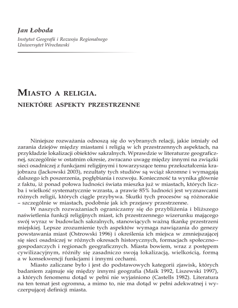 Jan Łoboda Instytut Geografii i Rozwoju Regionalnego Uniwersytet Wrocławski Miasto a religia. niektóre aspekty przestrzenne Niniejsze rozważania odnoszą się do wybranych relacji, jakie istniały od zarania dziejów między miastami i religią w ich przestrzennych aspektach, na przykładzie lokalizacji obiektów sakralnych. Wprawdzie w literaturze geograficznej, szczególnie w ostatnim okresie, zwracano uwagę między innymi na związki sieci osadniczej z funkcjami religijnymi i towarzyszące temu przekształcenia krajobrazu (Jackowski 2003), rezultaty tych studiów są wciąż skromne i wymagają dalszego ich poszerzenia, pogłębiania i rozwoju. Konieczność ta wynika głównie z faktu, iż ponad połowa ludności świata mieszka już w miastach, których liczba i wielkość systematycznie wzrasta, a prawie 85% ludności jest wyznawcami różnych religii, których ciągle przybywa. Skutki tych procesów są różnorakie – szczególnie w miastach, podobnie jak ich przejawy przestrzenne. W naszych rozważaniach ograniczamy się do przybliżenia i bliższego naświetlenia funkcji religijnych miast, ich przestrzennego wizerunku mającego swój wyraz w budowlach sakralnych, stanowiących ważną tkankę przestrzeni miejskiej. Lepsze zrozumienie tych aspektów wymaga nawiązania do genezy powstawania miast (Ostrowski 1996) i określenia ich miejsca w zmniejszającej się sieci osadniczej w różnych okresach historycznych, formacjach społeczno-gospodarczych i regionach geograficznych. Miasta bowiem, wraz z postępem cywilizacyjnym, różniły się zasadniczo swoją lokalizacją, wielkością, formą a w konsekwencji funkcjami i innymi cechami. Miasto zaliczane było i jest do podstawowych kategorii zjawisk, których badaniem zajmuje się między innymi geografia (Maik 1992, Liszewski 1997), a których fenomenu dotąd w pełni nie wyjaśniono (Castells 1982). Literatura na ten temat jest ogromna, a mimo to, nie ma dotąd w pełni adekwatnej i wyczerpującej definicji miasta. 298 Geografia i sacrum Zwykle za miasto uznaje się znaczne skupisko ludności, różniące się od innych swymi głównie nierolniczymi funkcjami, znaczną skalą przestrzenną – wielkością oraz intensywnością zabudowy (Jałowiecki 1972). Nie możemy jednak przy tym zapominać, że powstanie miast jako określonej instytucji społecznej, a jednocześnie przestrzennej formy współżycia różnych społeczności o złożonej strukturze wewnętrznej i wielorakich relacjach zewnętrznych, posiada różnorodne przyczyny i uwarunkowania. Mają one swoje źródła głównie w rozwoju historycznym (Egli 1951) i społeczno-gospodarczym oraz kulturowym, a także w postępie cywilizacyjnym (Burke 1971). Z różnymi cywilizacjami łączyły się ich zróżnicowane koncepcje, realizacje i skutki (George 1956). Pojęcie religii jest również rozmaicie definiowane i w sposób jeszcze bardziej zróżnicowany interpretowane (Schaefler 1989). Upraszczając te zróżnicowania, na potrzeby tych rozważań przyjmiemy, że religia to zjawisko, które określano najczęściej jako relacja człowieka do tego, co święte, wzniosłe, inne niż zwyczajnie świeckie. Wyrażać się to może w różnie pojmowanej świętości i sferze boskiej, która bywa manifestowana w wymiarze doktrynalnym (wiara), w czynnościach religijnych (kult), w sferze religijności indywidualnej (mistyka) oraz w interesującej nas sferze społeczno-organizacyjnej jako kościół czy wspólnota religijna, która zajmuje określone miejsce w przestrzeni (Wardenburg 1991). Identyfikacja wspomnianych na wstępie relacji wymaga sięgnięcia do ich genezy i uwarunkowań rozwoju w poszczególnych epokach historycznych (Mumford 1961) Pierwsze miasta powstały już w starożytności. Ich występowanie przypisywane było pierwotnie obszarom rozciągającym się od doliny Tygrysu i Eufratu, wzdłuż wschodniego wybrzeża Morza Śródziemnego aż do doliny Nilu. Najpóźniej w 2. poł. VI tysiąclecia p.n.e. znaczne zróżnicowanie charakteru skupisk ludzkich było na wymienionych terenach a także i w Azji Mniejszej dostatecznie wyraźne, by można z nimi wiązać występowanie miast (m.in. Egli 1951; Mumford 1961). W pierwszym okresie rozwoju miast rolnictwo i myślistwo (Czaja 2003) stanowiły główne źródła utrzymania ich mieszkańców . Dopiero z upływem czasu struktura zawodowa ludności mieszkającej w miastach np. greckich zróżnicowała się i powstały duże ośrodki handlu i rzemiosła, np. Ateny. Charakterystycznym elementem kształtowania miast stała się agora otoczona okazałymi budowlami, wśród których z reguły znajdowały się także świątynie. Na przełomie VI i V w. p.n.e. na obszarze przeznaczonym pod zabudowę wytyczono sieć krzyżujących się pod kątem prostym ulic. Powstałe w efekcie bloki zabudowy dzielono na równej wielkości place, które zajmowano pod odpowiednie budynki publiczne, w tym kościoły, rotundy, babtysteria i inne. W odróżnieniu od wzorów greckich, miasta rzymskie posiadały z reguły prostokątną formę, a oś ich układu urbanistycznego wyznaczały dwie krzyżujące się, skierowane do bram, ulice. Uwzględniając postęp w podnoszeniu wydajności ziemi – głównie w wyniku jej nawadniania – możliwe stało się utrzymanie większej liczby ludności Miasto a religia. niektóre aspekty przestrzenne 299 zajmującej się rzemiosłem, handlem i transportem, jak również spełniającej funkcje administracyjne i związane także z kultem religijnym (Boesler 1960). Poza bezspornym dużym znaczeniem funkcji produkcyjnych i handlowych, które dynamizowały rozwój miast, wraz z dokonującym się postępem, wzrosło znaczenie funkcji usługowych tak materialnych, jak i duchowych. Od zarania dziejów miasto wiązało swą genezę z siedzibą władzy, kontrolując i administrując obszarami jej zasięgu – por. miasta greckie i rzymskie w starożytności po współczesne stolice – w tym centra wyznaniowe. P