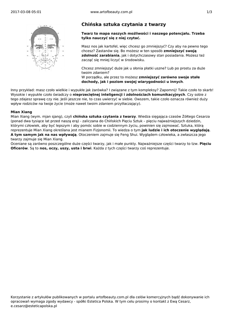 2017-03-08 05:01 www.artofbeauty.com.pl 1/3 Chińska sztuka czytania z twarzy Twarz to mapa naszych możliwości i naszego potencjału. Trzeba tylko nauczyć się z niej czytać. Masz nos jak kartofel, więc chcesz go zmniejszyć? Czy aby na pewno tego chcesz? Zastanów się. Bo możesz w ten sposób zmniejszyć swoją zdolność zarabiania, jak i dotychczasowy stan posiadania. Możesz też zacząć się mniej liczyć w środowisku. Chcesz zmniejszyć duże jak u słonia płatki uszne? Lub po prostu za duże twoim zdaniem? W porządku, ale przez to możesz zmniejszyć zarówno swoje stałe dochody, jak i poziom swojej wiarygodności u innych. Inny przykład: masz czoło wielkie i wypukłe jak żarówka? I związane z tym kompleksy? Zapomnij! Takie czoło to skarb! Wysokie i wypukłe czoło świadczy o nieprzeciętnej inteligencji i zdolnościach komunikacyjnych. Czy sobie z tego zdajesz sprawę czy nie. Jeśli jeszcze nie, to czas uwierzyć w siebie. Owszem, takie czoło oznacza również duży wpływ rodziców na twoje życie (może nawet twoim zdaniem przytłaczający). Mian Xiang Mian Xiang (wym. mjan sjang), czyli chińska sztuka czytania z twarzy. Wiedza sięgająca czasów Żółtego Cesarza (ponad dwa tysiące lat przed naszą erą) - zaliczana do Chińskich Pięciu Sztuk – pięciu najważniejszych dziedzin, którymi człowiek, aby być lepszym i aby pomóc sobie w codziennym życiu, powinien się zajmować. Sztuka, którą reprezentuje Mian Xiang określana jest mianem Fizjonomii. To wiedza o tym jak ludzie i ich otoczenie wyglądają. A tym samym jak na nas wpływają. Otoczeniem zajmuje się Feng Shui. Wyglądem człowieka, a zwłaszcza jego twarzy zajmuje się Mian Xiang. Oceniane są zarówno poszczególne duże części twarzy, jak i małe punkty. Najważniejsze części twarzy to tzw. Pięciu Oficerów. Są to nos, oczy, uszy, usta i brwi. Każda z tych części twarzy coś reprezentuje. Korzystanie z artykułów publikowanych w portalu artofbeauty.com.pl dla celów komercyjnych bądź dokonywanie ich opracowań wymaga zgody wydawcy - spółki Estetica Polska. W tym celu prosimy o kontakt z Ewą Cesarz, [email protected] 2017-03-08 05:01 www.artofbeauty.com.pl 2/3 1. Nos – tożsamość (zintegrowanie, świadomość kim się jest), zdrowie (środek nosa), majątek (zdolność zarabiania – czubek nosa). U kobiety nos reprezentuje także jej męża. Choć oczywiście tylko nosa za jej potencjał małżeński obarczać nie należy, ale… jest to jeden z czynników, który, stosując czytanie z twarzy, należy uwzględnić. Nos – im większy tym lepszy. A już kulfon czy kartofel – cudownie! Przynajmniej na nas zarobi i w zdrowiu zachowa. A jeśli nie mamy dużego nosa z dużym, mięsistym czubkiem – to znajdźmy sobie partnera, który taki ma! A jeśli nie duży nos – to niech będzie długi. Albo przynajmniej niech ma dziurki zasłonięte, ponieważ szerokie i opuszczone nozdrza – zasłaniające dziurki - to nasz sejf. Gwarancja, że nasz majątek jest chroniony. A majątek powinien być chroniony. W sejfie, który jest zamknięty. Osoby, które mają zadarty nos, a tym samym odsłonięte dziurki, bywają rozrzutne, albo mają kłopot z oszczędzaniem. Na ogół lubią poprawiać sobie nastrój zakupami. 2. Oczy – to okna duszy, żywotność, energia życiowa, poziom optymizmu. Mówią też o naszej atrakcyjności. Szczególnie, gdy w kącikach zewnętrznych oczu, przy skroniach, mamy liczne „kurze łapki”. I bardzo dobrze. Chcemy je mieć – nie należy ich usuwać, one przyciągają innych do nas, sprawiają, że się podobamy i jesteśmy słuchani. Oczy mogą być mniejsze – lepiej nadają się do koncentracji, strategicznego myślenia i panowania nad emocjami. Idealne w biznesie. W przeciwieństwie do oczu dużych, zwłaszcza naturalnie wilgotnych, oczy małe nie zdradzają emocji i zazwyczaj należą do osób, które potrafią swoje emocje skutecznie kontrolować. 3. Uszy – reprezentują inteligencję, wiedzę, zdolność uczenia się i przyswajania wiedzy - zarówno tej szkolnej, jak i wynikającej ze zdobywanych doświadczeń. Uszy to dzieciństwo, a konkretnie lata do 14 roku życia (dlatego w tym czasie chodzimy do szkoły). Uwaga! Nie należy pozwalać na przekłuwanie uszu dzieciom przed ukończeniem czternastego roku życia. Wszelkie otwory lub skaleczenia i blizny, które znajdą się na małżowinach usznych w czasie, Korzystanie artykułów publikowanych portalu artofbeauty.com.pl dlajego celów komercyjnych bądź dokonywanie ich gdy dziecko znie ukończyło jeszcze 14 latwmogą odbić się negatywnie na wynikach w nauce. opracowań wymaga zgody wydawcy - spółki Estetica Polska. W tym celu prosimy o kontakt z Ewą Cesarz, [email protected] 2017-03-08 05:01 www.artofbeauty.com.pl 3/3 Uszy to także życiowa mądrość i doświadczenie (mędrcy, mentorzy, starsze, będące dla nas autorytetem osoby mają zazwyczaj duże uszy). 4. Usta – zdolności językowe i komunikacyjne. Gdy górna warga jest wyraźnie podzielona na dwie części, a na dodatek usta są dość duże oznacza to umiejętność sprawnego wypowiadania się i zdolności negocjacyjne. Taka osoba świetnie się sprawdzi w dziale sprzedaży. Duże usta sugerują też zakupoholika, a w szerszym kontekście (także seksualnym) osobę, która lubi sobie dogadzać. Usta to pożądanie, ale także koneksje i zdolność wyrażania się. 5. Brwi – charakter, ogólne zrównoważenie, życiowa odwaga. Mówią o naszym zrównoważeniu, wiarygodności, prawości charakteru. Określają siłę woli i poziom determinacji w działaniu i realizacji wyznaczonych celów. Kształt brwi twojego partnera powie czy będziesz z nim szczęśliwa w małżeństwie! Brwi określają również nasze relacje z rodzeństwem. Jeśli brwi są przecięte lub przekłute kolczykiem, albo jest na nich pieprzyk, albo wyprysk lub rana – relacje z rodzeństwem mogą być trudne, albo brat lub siostra bę