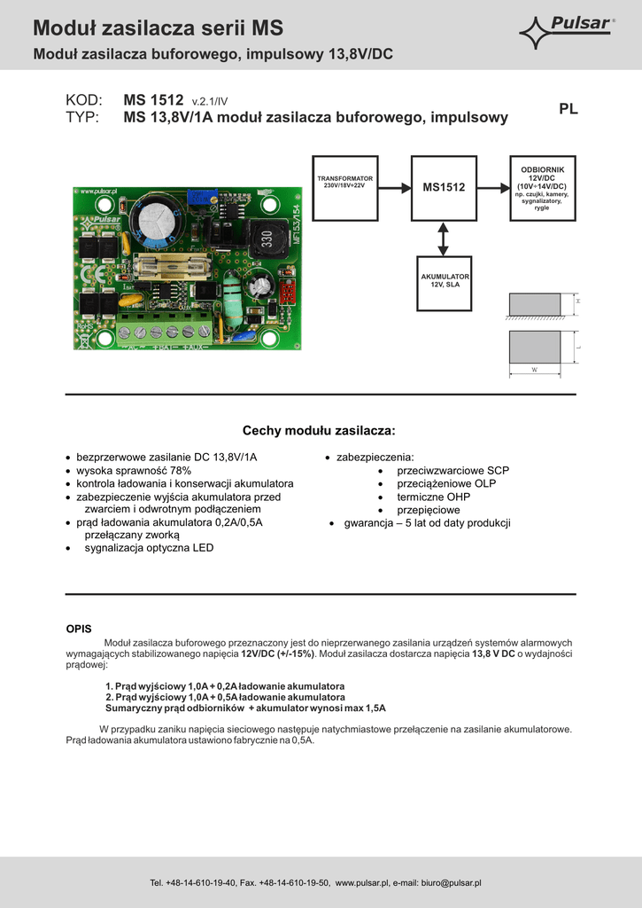 Pulsar Moduł zasilacza serii MS Moduł zasilacza buforowego, impulsowy 13,8V/DC KOD: TYP: MS 1512 v.2.1/IV MS 13,8V/1A moduł zasilacza buforowego, impulsowy TRANSFORMATOR 230V/18V÷22V MS1512 PL ODBIORNIK 12V/DC (10V÷14V/DC) np. czujki, kamery, sygnalizatory, rygle AKUMULATOR 12V, SLA Cechy modułu zasilacza: bezprzerwowe zasilanie DC 13,8V/1A wysoka sprawność 78% kontrola ładowania i konserwacji akumulatora zabezpieczenie wyjścia akumulatora przed zwarciem i odwrotnym podłączeniem · prąd ładowania akumulatora 0,2A/0,5A przełączany zworką · sygnalizacja optyczna LED · · · · · zabezpieczenia: · przeciwzwarciowe SCP · przeciążeniowe OLP · termiczne OHP · przepięciowe · gwarancja – 5 lat od daty produkcji OPIS Moduł zasilacza buforowego przeznaczony jest do nieprzerwanego zasilania urządzeń systemów alarmowych wymagających stabilizowanego napięcia 12V/DC (+/-15%). Moduł zasilacza dostarcza napięcia 13,8 V DC o wydajności prądowej: 1. Prąd wyjściowy 1,0A + 0,2A ładowanie akumulatora 2. Prąd wyjściowy 1,0A + 0,5A ładowanie akumulatora Sumaryczny prąd odbiorników + akumulator wynosi max 1,5A W przypadku zaniku napięcia sieciowego następuje natychmiastowe przełączenie na zasilanie akumulatorowe. Prąd ładowania akumulatora ustawiono fabrycznie na 0,5A. Tel. +48-14-610-19-40, Fax. +48-14-610-19-50, www.pulsar.pl, e-mail: [email protected] ® Moduł zasilacza serii MS Pulsar Moduł zasilacza buforowego, impulsowy 13,8V/DC DANE TECHNICZNE Zasilanie: Pobór prądu: Moc zasilacza: Sprawność: Napięcie wyjściowe: Prąd wyjściowy: Zakres regulacji napięcia wyjściowego: Napięcie tętnienia: Prąd ładowania akumulatora: Zabezpieczenie przed zwarciem SCP: Zabezpieczenie przed przeciążeniem OLP: Zabezpieczenie w obwodzie akumulatora SCP i odwrotna polaryzacja podłączenia: Optyczna sygnalizacja pracy: Warunki pracy: Wymiary: Waga netto/brutto: Mocowanie Złącza 18V÷22V AC 30VA min.(np. AWT150) 1,8A max. 21W 78% 11,0V ÷ 13,8V DC – praca buforowa 10,0V ÷ 13,8V DC – praca bateryjna 1,0A + 0,2A ładowanie akumulatora 1,0A + 0,5A ładowanie akumulatora 12÷14,5V DC 30mV p-p max. 0,2A / 0,5A - przełączany zworką IBAT 200% ÷ 250% mocy modułu zasilacza - ograniczenie prądu i/lub uszkodzenie bezpiecznika topikowego w obwodzie akumulatora (wymaga wymiany wkładki topikowej) 110% ÷ 150% (@25ºC) mocy modułu zasilacza ograniczenie prądu poprzez bezpiecznik powracalny PTC, ponowne uruchomienie ręczne (awaria wymaga odłączenie obwodu wyjściowego DC) 2A- ograniczenie prądu, bezpiecznik topikowy FBAT (awaria wymaga wymiany wkładki topikowej) Tak - diody LED II klasa środowiskowa, -10 oC÷40 oC 74,5 x 53 x 25 (WxLxH) [mm] (+/- 2) 0,07kg / 0,12kg Kołki montażowe x 4 (PCB fi=4,2 mm) Wyjścia : Ф0,41÷1,63 (AWG 26-14) Wyjścia akumulatora BAT: 6,3F-2,5, 30cm Tel. +48-14-610-19-40, Fax. +48-14-610-19-50, www.pulsar.pl, e-mail: [email protected] ®