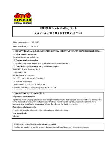 KOSBUD Bracia Kosińscy Sp. J. KARTA CHARAKTERYSTYKI Data sporządzenia: 12.08.2013 Data aktualizacji: 12.08.2013 1. IDENTYFIKACJA SUBSTANCJI/MIESZANINY I IDENTYFIKACJA PRZEDSIĘBIORSTWA 1.1 Identyfikator produktu: Barwione kruszywo techniczne 1.2 Zastosowanie mieszaniny Wypełniacz dla budownictwa oraz przemysłu, surowiec dekoracyjny. 1.3 Dane dotyczące dostawcy karty charakterystyki : KOSBUD Bracia Kosińscy Sp. J. Dziękowizna 16 05-300 Mińsk Mazowiecki Tel.: 025 756 38 88 fax 025 756 38 45 1.4 Telefon alarmowy: Laboratorium KOSBUD: 25 756 38 88 Centrum Informacji Toksykologicznej 42 631 47 24 2. IDENTYFIKACJA ZAGROŻEŃ Zagrożenia dla człowieka Zgodnie z obowiązującą dyrektywą oraz przepisami krajowymi dotyczącymi zasad klasyfikacji produkt nie został zaklasyfikowany jako niebezpieczny. Podczas przestrzegania ogólnych zasad bezpieczeństwa i higieny pracy produkt nie stwarza zagrożenia dla zdrowia lub życia człowieka. Zagrożenia dla środowiska Produkt nie jest klasyfikowany jako niebezpieczny dla środowiska. Inne zagrożenia Nie ma 3. SKŁAD/INFORMACJA O SKŁADNIKACH Produkt nie zawiera w swoim składzie komponentów klasyfikowanych jako niebezpieczne. 4. PIERWSZA POMOC W kontakcie ze skórą Zanieczyszczone partie skóry zmyć dokładnie wodą z mydłem. W przypadku wystąpienia podrażnienia skonsultować się z lekarzem. W kontakcie z oczami Wypłukać obficie dużą ilością wody (10 – 15 min.). Chronić niepodrażnione oko, wyjąć szkła kontaktowe. W przypadku wystąpienia podrażnienia skonsultować się z lekarzem. W przypadku spożycia Nie wywoływać wymiotów. Wypłukać usta wodą, podać do picia wodę. Nigdy nie podawać niczego do ust osobie nieprzytomnej. Natychmiast wezwać lekarza, pokazać opakowanie lub etykietę. Po narażeniu drogą oddechową W przypadku złego samopoczucia wyprowadzić poszkodowanego na świeże powietrze, zapewnić ciepło i spokój. 5. POSTĘPOWANIE W PRZYPADKU POŻARU Odpowiednie środki gaśnicze Produkt niepalny. Dostosować środki gaśnicze do materiałów magazynowanych w sąsiedztwie. Nieodpowiednie środki gaśnicze Brak. Niebezpieczne produkty spalania W czasie pożaru mogą tworzyć się szkodliwe gazy i dymy. Szczególne wyposażenie podczas walki z ogniem Środki ochrony ogólnej typowe w przypadku pożaru. Nie należy przebywać w zagrożonej ogniem strefie bez odpowiedniego ubrania odpornego na chemikalia i aparatu do oddychania z niezależnym obiegiem powietrza. Dodatkowe informacje Zagrożone ogniem pojemniki polewać z bezpiecznej odległości rozpylonym strumieniem wody. Nie należy dopuścić do przedostania się wody gaśniczej do kanalizacji, wód powierzchniowych i gruntowych. 6. POSTĘPOWANIE W PRZYPADKU NIEZAMIERZONEGO UWOLNIENIA DO ŚRODOWISKA Indywidualne środki ostrożności Należy przestrzegać ogólnych zasad bezpieczeństwa i higieny. Unikać kontaktu z oczami. Stosować środki ochrony indywidualnej zgodnie z 8 Karty. Niezbędne środki w zakresie ochrony środowiska W przypadku uwolnienia większych ilości preparatu należy poczynić kroki w celu niedopuszczenia do rozprzestrzenienia się w środowisku naturalnym. Powiadomić odpowiednie służby ratownicze. Metody oczyszczania/wchłaniania Zebrać mechanicznie. Zebrany materiał przekazać do ponownego użycia lub potraktować jak odpady i dalej postępować wg pkt 13. Oczyścić zanieczyszczone miejsce. 7. POSTĘPOWANIE Z MIESZANINĄ I JEJ MAGAZYNOWANIE Postępowanie z preparatem Pracować zgodnie z zasadami bezpieczeństwa i higieny. Przed przerwą i po zakończeniu pracy umyć ręce. Unikać zanieczyszczenia oczu. Stosować zgodnie z przeznaczeniem. Magazynowanie Przechowywać w oryginalnych, szczelnych opakowaniach w dobrze wentylowanych pomieszczeniach. Nie przechowywać razem z artykułami żywnościowymi i paszami dla zwierząt. Specyficzne zastosowania Wypełniacz dla budownictwa oraz przemysłu, surowiec dekoracyjny. 8. KONTROLNA NARAŻENIA I ŚRODKI OCHRONY INDYWIDUALNEJ Wartości graniczne narażenia Produkt nie posiada w swoim składzie komponentów podlegających kontroli narażania. Kontrola narażenia w miejscu pracy Przestrzegać ogólnych zasad bezpieczeństwa i higieny. Podczas pracy nie jeść, nie pić i nie palić tytoniu. Przed przerwą i po zakończeniu pracy dokładnie umyć ręce. Ochrona rąk i ciała: w przypadku częstego i długotrwałego kontaktu stosować rękawice ochronne. Nosić odzież ochronną. Materiał, z którego wykonane są rękawice musi być nieprzepuszczalny i odporny na działanie produktu. Wyboru materiału należy dokonać przy uwzględnieniu czasów przebicia, szybkości przenikania i degradacji. Ponadto wybór odpowiednich rękawic nie zależy tylko od materiału, lecz także od innych cech jakościowych i zmienia się w zależności od producenta. Od producenta rękawic należy uzyskać informacje na temat dokładnego czasu przebicia i go przestrzegać. Zaleca się regularne zmienianie rękawic i natychmiastową ich wymianę, jeśli wystąpią jakiekolwiek oznaki ich zużycia, uszkodzenia lub zmiany w wyglądzie (kolorze, elastyczności, kształcie). Ochrona oczu: nie jest wymagana. Ochrona dróg oddechowych: nie jest wymagana, ale stosować ochronę dróg oddechowych w przypadku powstawania pyłów. Stosowane środki ochrony indywidualnej muszą spełniać wymagania zawarte w rozporządzeniu Ministra Gospodarki z dnia 28.12.2005 r. (Dz. U. Nr 259, poz. 2173) oraz dyrektywy 89/686/WE (wraz z późn. zm.). Pracodawca obowiązany jest zapewnić środki ochrony odpowiednie do wykonywanych czynności oraz spełniające wszystkie wymagania jakościowe, w tym również ich konserwację i oczyszczanie. Kontrola narażenia środowiska Zapobiec bezpośredniemu przedostaniu się produktu do kanalizacji/wód powierzchniowych. Nie wolno zanieczyszczać wód powierzchniowych i rowów odwadniających chemikaliami czy używanymi opakowaniami. Wywozić jak odpady chemiczne, zgodnie z przepisami krajo