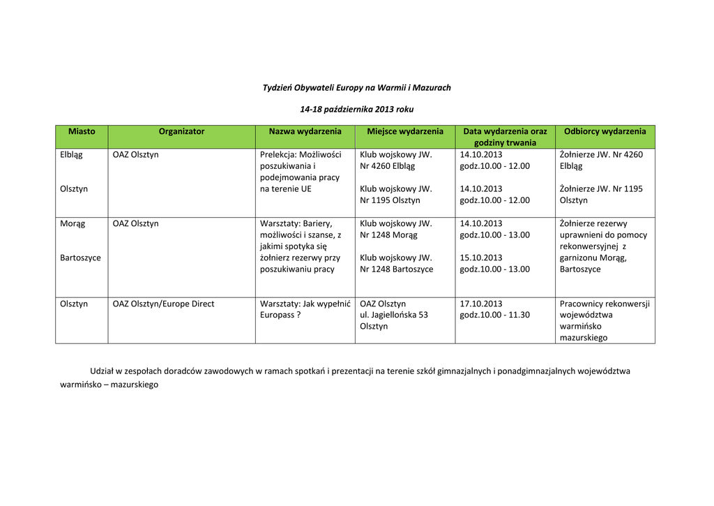 Tydzień Obywateli Europy na Warmii i Mazurach 14-18 października 2013 roku Miasto Elbląg Organizator OAZ Olsztyn Olsztyn Morąg OAZ Olsztyn Bartoszyce Olsztyn OAZ Olsztyn/Europe Direct Nazwa wydarzenia Miejsce wydarzenia Prelekcja: Możliwości poszukiwania i podejmowania pracy na terenie UE Klub wojskowy JW. Nr 4260 Elbląg Data wydarzenia oraz godziny trwania 14.10.2013 godz.10.00 - 12.00 Odbiorcy wydarzenia Klub wojskowy JW. Nr 1195 Olsztyn 14.10.2013 godz.10.00 - 12.00 Żołnierze JW. Nr 1195 Olsztyn Warsztaty: Bariery, możliwości i szanse, z jakimi spotyka się żołnierz rezerwy przy poszukiwaniu pracy Klub wojskowy JW. Nr 1248 Morąg 14.10.2013 godz.10.00 - 13.00 Klub wojskowy JW. Nr 1248 Bartoszyce 15.10.2013 godz.10.00 - 13.00 Żołnierze rezerwy uprawnieni do pomocy rekonwersyjnej z garnizonu Morąg, Bartoszyce Warsztaty: Jak wypełnić Europass ? OAZ Olsztyn ul. Jagiellońska 53 Olsztyn 17.10.2013 godz.10.00 - 11.30 Żołnierze JW. Nr 4260 Elbląg Pracownicy rekonwersji województwa warmińsko mazurskiego Udział w zespołach doradców zawodowych w ramach spotkań i prezentacji na terenie szkół gimnazjalnych i ponadgimnazjalnych województwa warmińsko – mazurskiego