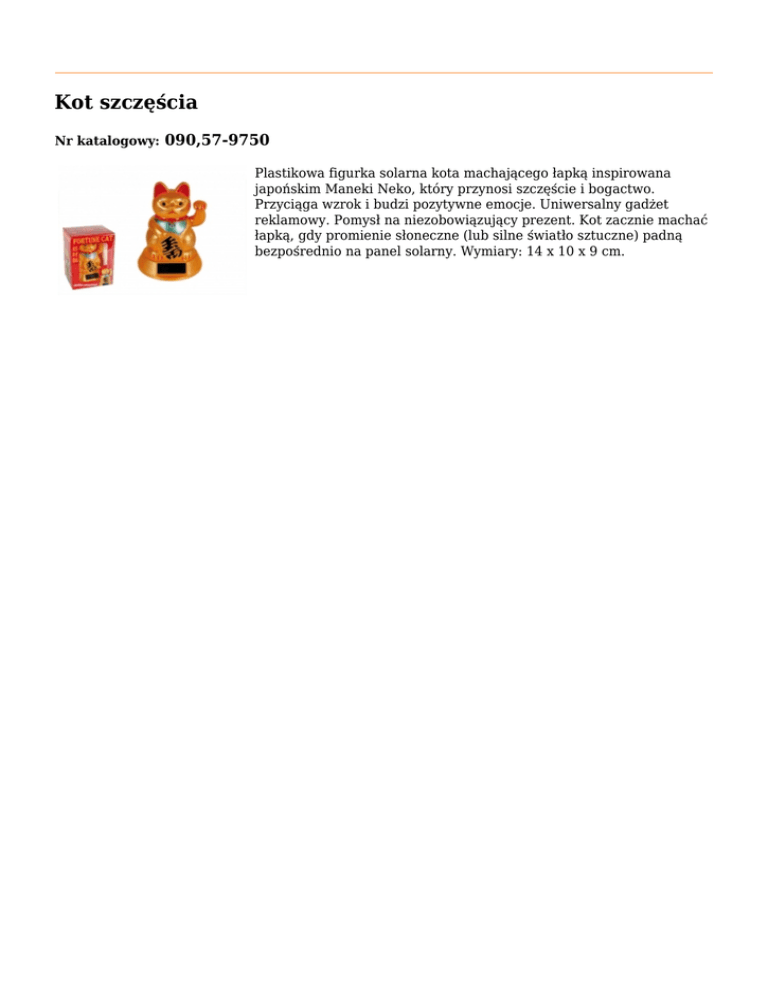 Kot szczęścia Nr katalogowy: 090,57-9750 Plastikowa figurka solarna kota machającego łapką inspirowana japońskim Maneki Neko, który przynosi szczęście i bogactwo. Przyciąga wzrok i budzi pozytywne emocje. Uniwersalny gadżet reklamowy. Pomysł na niezobowiązujący prezent. Kot zacznie machać łapką, gdy promienie słoneczne (lub silne światło sztuczne) padną bezpośrednio na panel solarny. Wymiary: 14 x 10 x 9 cm.