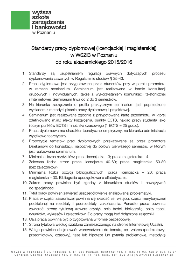 Standardy pracy dyplomowej (licencjackiej i magisterskiej) w WSZiB w Poznaniu od roku akademickiego 2015/2016 1. Standardy są uzupełnieniem regulacji prawnych dotyczących procesu dyplomowania zawartych w Regulaminie studiów § 35-43. 2. Praca dyplomowa jest przygotowana przez studentów przy wsparciu promotora w ramach seminarium. Seminarium jest realizowane w formie konsultacji grupowych i indywidualnych, także z wykorzystaniem komunikacji telefonicznej i Internetowej. Seminarium trwa od 2 do 3 semestrów. 3. Na kierunku zarządzanie o profilu praktycznym seminarium jest poprzedzone wykładem z metodyki pisania pracy dyplomowej i projektowej. 4. Seminarium jest realizowane zgodnie z przygotowaną kartą przedmiotu, w której zdefiniowano m.in.: efekty kształcenia, punkty ECTS, nakład pracy studenta jako iloczyn punktów ECTS i mnożnika czasowego (1 ECTS = 25 godz.). 5. Praca dyplomowa ma charakter teoretyczno-empiryczny, na kierunku administracja wyjątkowo teoretyczny. 6. Propozycje tematów prac dyplomowych przekazywane są przez promotora Dziekanowi do konsultacji, najpóźniej do połowy pierwszego semestru, w którym jest realizowane seminarium. 7. Minimalna liczba rozdziałów: praca licencjacka - 3; praca magisterska – 4. 8. Zalecana liczba stron: praca licencjacka 40-60; praca magisterska 50-80 (bez załączników). 9. Minimalna liczba pozycji bibliograficznych: praca licencjacka – 20; praca magisterska – 30. Bibliografia uporządkowana alfabetycznie. 10. Zakres pracy powinien być zgodny z kierunkiem studiów i nawiązywać do specjalności. 11. Tytuł pracy powinien zawierać uszczegółowienie analizowanej problematyki. 12. Praca w części zasadniczej powinna się składać ze: wstępu, części merytorycznej podzielonej na rozdziały i podrozdziały, zakończenia. Ponadto praca powinna zawierać: stronę tytułową (rewers czysty), spis treści, bibliografię, spisy tabel, rysunków, wykresów i załączników. Do pracy mogą być dołączone załączniki. 13. Cała praca powinna być przygotowana w formie bezosobowej. 14. Strona tytułowa według szablonu zamieszczonego na stronie Internetowej Uczelni. 15. Wstęp powinien obejmować: wprowadzenie do tematu, cel, zakres (podmiotowy, przedmiotowy, czasowy), tezę lub hipotezę lub pytania problemowe, metodykę 16. 17. 18. 19. 20. 21. 22. 23. a. b. c. d. e. f. g. 24. 25. a. b. c. pracy, informację o wykorzystanych źródłach, strukturę pracy (zawartość rozdziałów). Zakończenie powinno obejmować: odniesienie do celu, odniesienie do tezy lub hipotezy lub pytań problemowych, wnioski i ewentualnie wskazania do dalszych badań. Do dokumentacji dyplomowej należy dołączyć oświadczenie o samodzielności przygotowania pracy. Stosujemy przypisy na dole strony w numeracji ciągłej. Rysunki (wykresy, tabele) tytuł z numerem powyżej, źródło poniżej. Numeracja ciągła, odrębna dla poszczególnych form graficznych. W pracy powinien wystąpić związek pomiędzy znakiem graficznym (rysunkiem, wykresem, schematem, tabelą), a tekstem w postaci przywołania w tekście. Tytuły bez kropki. W przypisach z Internetu dodajemy datę dostępu w nawiasie, np. [dostęp 21.01.2016]. Podstawowe zasady edytorskie: Czcionka: Times New Roman 12 pkt. lub Arial 11 pkt., Interlinia 1,5, Od nowej strony: rozdziały, wstęp, zakończenie, bibliografia, spisy, Numeracja od pierwszej strony, ale na stronie tytułowej i rewersie niewidoczna, Druk dwustronny, Zakończenie rozdziału i paragrafów tekstem, a nie formą graficzną, Praca powinna być trwale połączona (zgrzana lub zszyta) i oprawiona w cienką, przeźroczystą okładkę. Praca po złożeniu w Dziekanacie zostanie sprawdzona Systemem Antyplagiatowym. Egzamin dyplomowy obejmuje pytania z zakresu: kierunku studiów, specjalności, pracy dyplomowej.