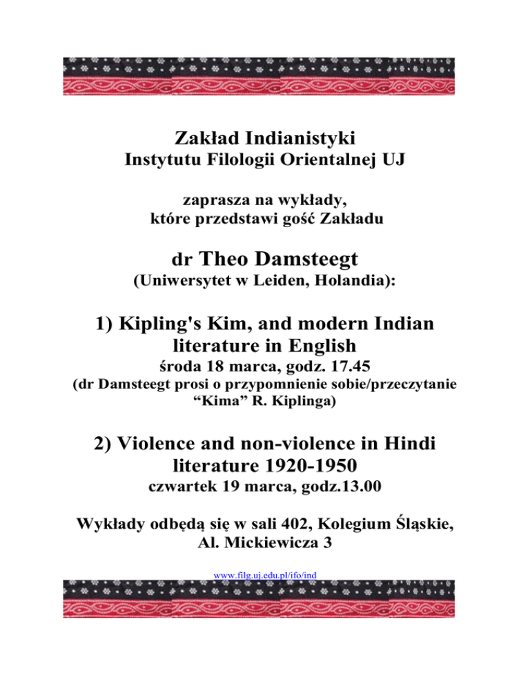 Zakład Indianistyki Instytutu Filologii Orientalnej UJ zaprasza na wykłady, które przedstawi gość Zakładu dr Theo Damsteegt (Uniwersytet w Leiden, Holandia): 1) Kipling's Kim, and modern Indian literature in English środa 18 marca, godz. 17.45 (dr Damsteegt prosi o przypomnienie sobie/przeczytanie “Kima” R. Kiplinga) 2) Violence and non-violence in Hindi literature 1920-1950 czwartek 19 marca, godz.13.00 Wykłady odbędą się w sali 402, Kolegium Śląskie, Al. Mickiewicza 3 www.filg.uj.edu.pl/ifo/ind
