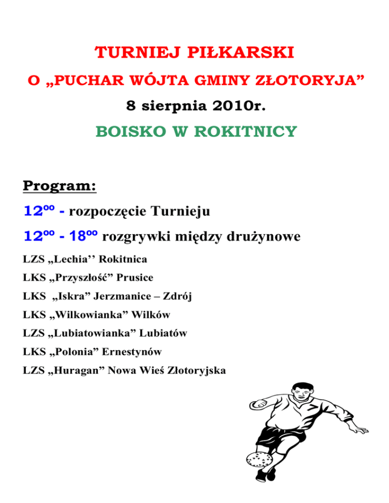 TURNIEJ PIŁKARSKI O „PUCHAR WÓJTA GMINY ZŁOTORYJA” 8 sierpnia 2010r. BOISKO W ROKITNICY Program: 12ºº - rozpoczęcie Turnieju 12ºº - 18ºº rozgrywki między druŜynowe LZS „Lechia’’ Rokitnica LKS „Przyszłość” Prusice LKS „Iskra” Jerzmanice – Zdrój LKS „Wilkowianka” Wilków LZS „Lubiatowianka” Lubiatów LKS „Polonia” Ernestynów LZS „Huragan” Nowa Wieś Złotoryjska