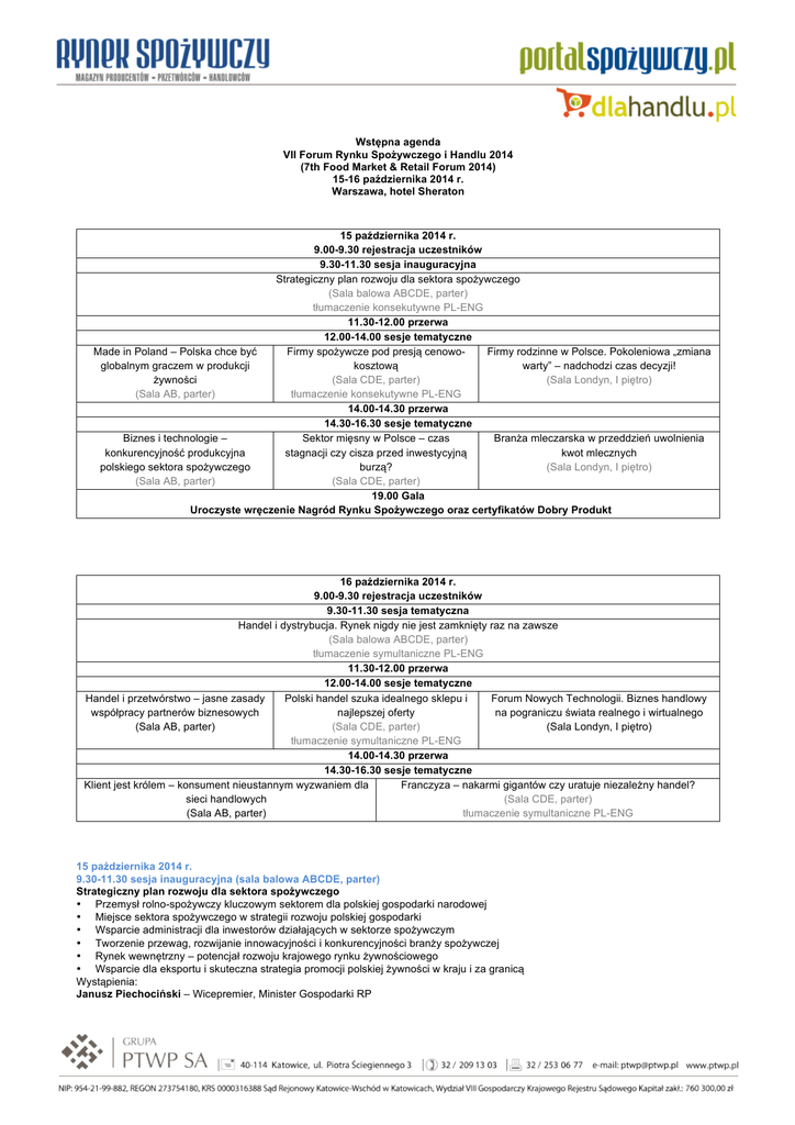 Wstępna agenda VII Forum Rynku Spożywczego i Handlu 2014 (7th Food Market & Retail Forum 2014) 15-16 października 2014 r. Warszawa, hotel Sheraton 15 października 2014 r. 9.00-9.30 rejestracja uczestników 9.30-11.30 sesja inauguracyjna Strategiczny plan rozwoju dla sektora spożywczego (Sala balowa ABCDE, parter) tłumaczenie konsekutywne PL-ENG 11.30-12.00 przerwa 12.00-14.00 sesje tematyczne Made in Poland – Polska chce być Firmy spożywcze pod presją cenowoFirmy rodzinne w Polsce. Pokoleniowa „zmiana globalnym graczem w produkcji kosztową warty” – nadchodzi czas decyzji! żywności (Sala CDE, parter) (Sala Londyn, I piętro) (Sala AB, parter) tłumaczenie konsekutywne PL-ENG 14.00-14.30 przerwa 14.30-16.30 sesje tematyczne Biznes i technologie – Sektor mięsny w Polsce – czas Branża mleczarska w przeddzień uwolnienia konkurencyjność produkcyjna stagnacji czy cisza przed inwestycyjną kwot mlecznych polskiego sektora spożywczego burzą? (Sala Londyn, I piętro) (Sala AB, parter) (Sala CDE, parter) 19.00 Gala Uroczyste wręczenie Nagród Rynku Spożywczego oraz certyfikatów Dobry Produkt 16 października 2014 r. 9.00-9.30 rejestracja uczestników 9.30-11.30 sesja tematyczna Handel i dystrybucja. Rynek nigdy nie jest zamknięty raz na zawsze (Sala balowa ABCDE, parter) tłumaczenie symultaniczne PL-ENG 11.30-12.00 przerwa 12.00-14.00 sesje tematyczne Handel i przetwórstwo – jasne zasady Polski handel szuka idealnego sklepu i Forum Nowych Technologii. Biznes handlowy współpracy partnerów biznesowych najlepszej oferty na pograniczu świata realnego i wirtualnego (Sala AB, parter) (Sala CDE, parter) (Sala Londyn, I piętro) tłumaczenie symultaniczne PL-ENG 14.00-14.30 przerwa 14.30-16.30 sesje tematyczne Klient jest królem – konsument nieustannym wyzwaniem dla Franczyza – nakarmi gigantów czy uratuje niezależny handel? sieci handlowych (Sala CDE, parter) (Sala AB, parter) tłumaczenie symultaniczne PL-ENG 15 października 2014 r. 9.30-11.30 sesja inauguracyjna (sala balowa ABCDE, parter) Strategiczny plan rozwoju dla sektora spożywczego • Przemysł rolno-spożywczy kluczowym sektorem dla polskiej gospodarki narodowej • Miejsce sektora spożywczego w strategii rozwoju polskiej gospodarki • Wsparcie administracji dla inwestorów działających w sektorze spożywczym • Tworzenie przewag, rozwijanie innowacyjności i konkurencyjności branży spożywczej • Rynek wewnętrzny – potencjał rozwoju krajowego rynku żywnościowego • Wsparcie dla eksportu i skuteczna strategia promocji polskiej żywności w kraju i za granicą Wystąpienia: Janusz Piechociński – Wicepremier, Minister Gospodarki RP Marek Sawicki – Minister Rolnictwa i Rozwoju Wsi RP Udział w dyskusji zapowiedzieli (wykaz osób w kolejności alfabetycznej): Ilona Antoniszyn-Klik – Podsekretarz Stanu, Ministerstwo Gospodarki RP; Enrico Bottero – Dyrektor Generalny, FERRERO POLSKA COMMERCIAL sp. z o.o.; Jan Dąbrowski – Prezes Zarządu, Okręgowa Spółdzielnia Mleczarska w Łowiczu; Andrzej Gantner – Dyrektor Generalny, Polska Federacja Producentów Żywności; Renata Juszkiewicz – Prezes, Polska Organizacja Handlu i Dystrybucji; Tomasz Olenderek – Członek Zarządu, Krajowa Spółka Cukrowa SA; Marek Sawicki – Minister Rolnictwa i Rozwoju Wsi RP; Bartosz Urbaniak – Dyrektor Zarządzający ds. Agrobiznesu, Bank BGŻ Moderator: Łukasz Stępniak – Redaktor Naczelny, Magazyn Rynek Spożywczy, portalspozywczy.pl 15 października 2014 r. 12.00-14.00 sesja tematyczna (sala AB, parter) Made in Poland – Polska chce być globalnym graczem w produkcji żywności • Polskie delikatesy – skuteczna promocja rodzimej żywności, firm i marek na świecie • Polska – regionalny czy już globalny lider w produkcji wysokiej jakości i ekologicznej żywności? • Rola agencji i administracji rządowej w otwieraniu nowych rynków zbytu na świecie • Potencjał produkcyjno-eksportowy polskiego sektora rolno-spożywczego. Produkt masowy czy jakościowy? • Afryka, Azja, Ameryka Pd. – polscy producenci żywności szukają szans na nowych rynkach • Europa i Unia Europejska – zwiększać inwestycje czy dywersyfikować kierunki eksportowe? • Umowa Unia Europejska – Stany Zjednoczone – nowe możliwości, nowe zagrożenia Udział w dyskusji zapowiedzieli (wykaz osób w kolejności alfabetycznej): Czesław Grzesiak – Wiceprezes Zarządu, Tesco Polska Sp. z o.o.; Michał Koleśnikow – Kierownik, Wydział Analiz Sektorowych, Ekspert ds. Analiz Rynków Rolnych, Bank BGŻ; Andrzej Kowalski – Dyrektor, Instytut Ekonomiki Rolnictwa i Gospodarki Żywnościowej; Bartosz Marcinkowski – Partner, Praktyka Prawa Spółek, Fuzji i Przejęć, DZP; Bartłomiej Sędłak – Dyrektor Sprzedaży, Bahlsen Polska Sp. z o.o.; Monika Siecińska-Jaworowska – Prezes Zarządu, Suempol Sp. z o.o.; Lucjan Zwolak – Zastępca Prezesa, Agencja Rynku Rolnego Prezentacja: • Polski eksport żywności – sukces i co dalej? Michał Koleśnikow – Kierownik, Wydział Analiz Sektorowych, Ekspert ds. Analiz Rynków Rolnych, Bank BGŻ Moderator: Łukasz Stępniak – Redaktor Naczelny, Magazyn Rynek Spożywczy, portalspozywczy.pl 15 października 2014 r. 12.00-14.00 sesja tematyczna (sala CDE, parter) Firmy spożywcze pod presją cenowo-kosztową • Konsolidacja sektora spożywczego szansą na przetrwanie i sukces rynkowy dla firm • Przetrwać i rozwijać się na trudnym oraz konkurencyjnym rynku • Rynek surowców – perspektywy i prognozy na kolejne miesiące • Sytuacja gospodarcza z perspektywy polskiego przedsiębiorcy • Presja cenowa ze strony sieci detalicznych i hurtowni • Wojna cenowo-promocyjna na rynku handlowym a sytuacja dostawców • Kontrola i bezpieczeństwo żywności jako podstawowy element sukcesu firm spożywczych Udział w dyskusji zapowiedzieli (wykaz osób w kolejności alfabetycznej): Edward Bajko – Prezes Zarządu, Spółdzielcza Mleczarnia Spomlek