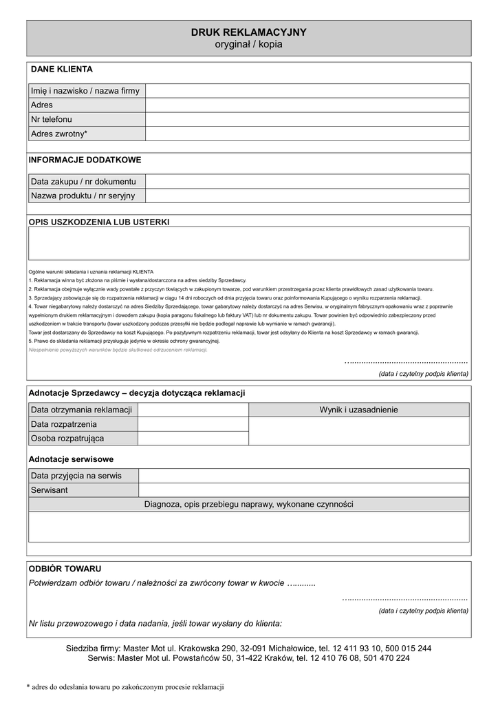 DRUK REKLAMACYJNY oryginał / kopia DANE KLIENTA Imię i nazwisko / nazwa firmy Adres Nr telefonu Adres zwrotny* INFORMACJE DODATKOWE Data zakupu / nr dokumentu Nazwa produktu / nr seryjny OPIS USZKODZENIA LUB USTERKI Ogólne warunki składania i uznania reklamacji KLIENTA 1. Reklamacja winna być złożona na piśmie i wysłana/dostarczona na adres siedziby Sprzedawcy. 2. Reklamacja obejmuje wyłącznie wady powstałe z przyczyn tkwiących w zakupionym towarze, pod warunkiem przestrzegania przez klienta prawidłowych zasad użytkowania towaru. 3. Sprzedający zobowiązuje się do rozpatrzenia reklamacji w ciągu 14 dni roboczych od dnia przyjęcia towaru oraz poinformowania Kupującego o wyniku rozparzenia reklamacji. 4. Towar niegabarytowy należy dostarczyć na adres Siedziby Sprzedającego, towar gabarytowy należy dostarczyć na adres Serwisu, w oryginalnym fabrycznym opakowaniu wraz z poprawnie wypełnionym drukiem reklamacyjnym i dowodem zakupu (kopia paragonu fiskalnego lub faktury VAT) lub nr dokumentu zakupu. Towar powinien być odpowiednio zabezpieczony przed uszkodzeniem w trakcie transportu (towar uszkodzony podczas przesyłki nie będzie podlegał naprawie lub wymianie w ramach gwarancji). Towar jest dostarczany do Sprzedawcy na koszt Kupującego. Po pozytywnym rozpatrzeniu reklamacji, towar jest odsyłany do Klienta na koszt Sprzedawcy w ramach gwarancji. 5. Prawo do składania reklamacji przysługuje jedynie w okresie ochrony gwarancyjnej. Niespełnienie powyższych warunków będzie skutkować odrzuceniem reklamacji. ….................................................. (data i czytelny podpis klienta) Adnotacje Sprzedawcy – decyzja dotycząca reklamacji Data otrzymania reklamacji Wynik i uzasadnienie Data rozpatrzenia Osoba rozpatrująca Adnotacje serwisowe Data przyjęcia na serwis Serwisant Diagnoza, opis przebiegu naprawy, wykonane czynności ODBIÓR TOWARU Potwierdzam odbiór towaru / należności za zwrócony towar w kwocie …......... …................................................... (data i czytelny podpis klienta) Nr listu przewozowego i data nadania, jeśli towar wysłany do klienta: Siedziba firmy: Master Mot ul. Krakowska 290, 32-091 Michałowice, tel. 12 411 93 10, 500 015 244 Serwis: Master Mot ul. Powstańców 50, 31-422 Kraków, tel. 12 410 76 08, 501 470 224 * adres do odesłania towaru po zakończonym procesie reklamacji