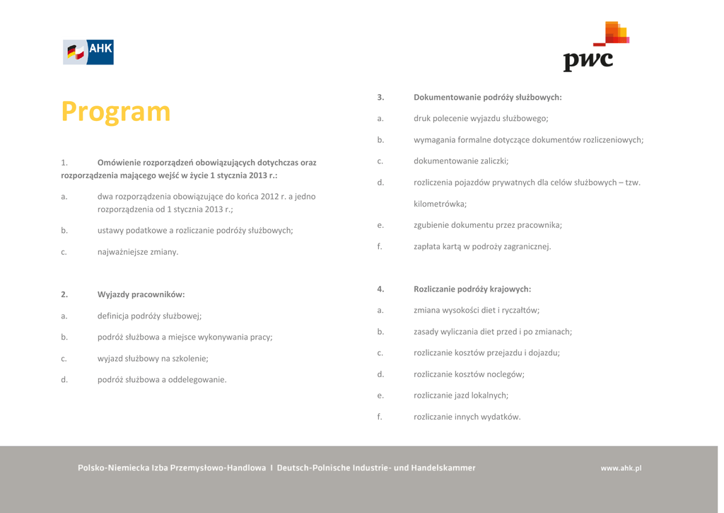 Program 1. Omówienie rozporządzeń obowiązujących dotychczas oraz rozporządzenia mającego wejść w życie 1 stycznia 2013 r.: a. dwa rozporządzenia obowiązujące do końca 2012 r. a jedno rozporządzenia od 1 stycznia 2013 r.; b. ustawy podatkowe a rozliczanie podróży służbowych; c. najważniejsze zmiany. 2. Wyjazdy pracowników: a. definicja podróży służbowej; b. podróż służbowa a miejsce wykonywania pracy; c. wyjazd służbowy na szkolenie; d. podróż służbowa a oddelegowanie. 3. Dokumentowanie podróży służbowych: a. druk polecenie wyjazdu służbowego; b. wymagania formalne dotyczące dokumentów rozliczeniowych; c. dokumentowanie zaliczki; d. rozliczenia pojazdów prywatnych dla celów służbowych – tzw. kilometrówka; e. zgubienie dokumentu przez pracownika; f. zapłata kartą w podroży zagranicznej. 4. Rozliczanie podróży krajowych: a. zmiana wysokości diet i ryczałtów; b. zasady wyliczania diet przed i po zmianach; c. rozliczanie kosztów przejazdu i dojazdu; d. rozliczanie kosztów noclegów; e. rozliczanie jazd lokalnych; f. rozliczanie innych wydatków. 5. Rozliczanie podróży zagranicznych: 7. Podróż służbowa a rozliczanie czasu pracy: a. zmiana wysokości diet i ryczałtów; a. b. rozliczanie kosztów przejazdu i dojazdu; podstawowe zasady rozliczania czasu pracy w trakcie podróży służbowej; c. rozliczanie kosztów noclegów; b. różnice w rozliczaniu czasu pracy w przypadku podróży służbowej w celach szkoleniowych; d. rozliczanie innych wydatków; c. czas odpoczynku w podróży służbowej; e. rozliczanie kosztów leczenia za granicą. d. rozliczanie nadgodzin. 6. Rozliczanie podróży służbowych z punktu widzenia pracownika: 8. Rozliczanie różnic kursowych w podróżach służbowych: a. przychód pracownika z tytułu należności związanych z podróżą służbową; a. rozliczanie zaliczek – nowe zasady; b. zwolnienie należności z tytułu podróży służbowej od podatku dochodowego; b. rozliczanie podróży służbowych. c. należności podlegające opodatkowaniu podatkiem dochodowym; d. należności z tytułu podróży służbowych a składki ZUS. 9. Problemy praktyczne: a. wyliczenie czasu trwania podróży służbowej w przypadku połączonej podróży krajowej i zagranicznej; b. jedna podróż do kilku krajów – zasady rozliczania po zmianach; c. najem samochodu służbowego w kraju i za granicą; d. zakwaterowanie w podróży służbowej; e. podróże osób niebędących pracownikami spółki – umowy cywilnoprawne i rozmowy rekrutacyjne; f. posiłek w trakcie szkolenia oraz posiłek z kontrahentem – najnowsze orzecznictwo; g. ubezpieczenia w trakcie podróży służbowych; h. transakcje WNT i import usług w podróżach służbowych. 10. Pytania uczestników i podsumowanie. Przerwa kawowa: 10:45 – 11.00 Lunch: 12.30 – 13.30 PwC jest wiodącą globalną organizacją świadczącą profesjonalne usługi doradcze. W Polsce PwC zatrudnia zespół ponad 1900 specjalistów w siedmiu miastach: w Warszawie, Katowicach, Krakowie, Poznaniu, Wrocławiu, Gdańsku i Łodzi. Dział prawno-podatkowy spółki to zespół ponad 400 specjalistów (w tym ponad 100 doradców podatkowych). Usługi podatkowe w Polsce świadczone są zgodnie z najwyższymi standardami stosowanymi przez naszą firmę na całym świecie. Zapewniamy naszym Klientom pomoc i porady w następujących dziedzinach: podatek dochodowy od osób prawnych oraz od osób fizycznych; podatek od towarów i usług (VAT); podatek akcyzowy; należności celne oraz tryb postępowania i opłaty w handlu międzynarodowym; ceny transferowe; postępowanie i spory w sprawach podatkowych; międzynarodowe prawo podatkowe; ubezpieczenia społeczne; usługi dotyczące formalności związanych z podatkiem dochodowym od osób fizycznych; doradztwo w zakresie podatku dochodowego od osób fizycznych. Wśród naszych klientów jest liczna grupa inwestorów z niemieckiego obszaru językowego. By sprostać ich wymaganiom stworzyliśmy ekspercki zespół działający pod nazwą German Business Group. German Business Group to doświadczeni polscy i niemieccy audytorzy, doradcy i prawnicy władający biegle językiem niemieckim, mają wybitną wiedzę z zakresu przepisów polskich oraz niemieckich, a także szeroką znajomość kultury biznesowej krajów niemieckojęzycznych. W Polsce mamy ponad 100 osób niemieckojęzycznych we wszystkich działach i 7 biurach PwC, natomiast kluczowy zespół to ponad 20 osób. Znając nie tylko język niemiecki, ale także różnice kulturowe oraz niemieckie zasady rachunkowości i rozwiązania prawno-podatkowe obsługujemy klientów z Niemiec, Austrii i Szwajcarii. Ściśle współpracujemy z naszymi kolegami i koleżankami z tych krajów oraz pozostałymi zespołami German Business Group na całym świecie. Prowadzące Donata Koreń dołączyła do PwC w 2007 r. Pracuje na stanowisku Starszego Konsultanta w zespole usług podatkowo-księgowych w Krakowie. Donata posiada bogate doświadczenie w doradzaniu międzynarodowym i krajowym przedsiębiorstwom przy podejmowaniu oraz prowadzeniu działalności w Polsce. Specjalizuje się w zakresie obowiązków sprawozdawczych dotyczących rozliczeń podatkowych, ze szczególnym uwzględnieniem podatku od towarów i usług oraz podatku dochodowego od osób prawnych. Donata posiada licencję doradcy podatkowego. Jest autorem artykułów z zakresu prawa podatkowego, publikowanych w ogólnokrajowych periodykach (Rzeczpospolita, Gazeta Prawna). Renata Mostowiec jest menedżerem w zespole TMAS w warszawskim biurze PwC gdzie pracuje od 2010 roku. Renata posiada ponad 12 letnie doświadczenie w zakresie kompleksowej obsługi międzynarodowych i lokalnych przedsiębiorstw w obszarze administracji kadrowopłacowej. Specjalizuje się w zakresie doradztwa w obszarze naliczania wynagrodzeń, świadczeń z ubezpieczenia społecznego w razie choroby i macierzyństwa, świadczeń pozapłacowych oraz ich kwalifikacji 