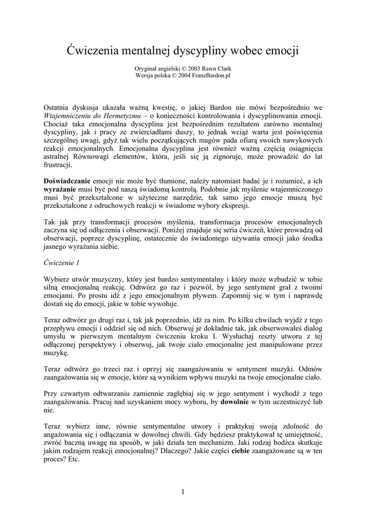 Ćwiczenia mentalnej dyscypliny wobec emocji Oryginał angielski © 2003 Rawn Clark Wersja polska © 2004 FranzBardon.pl Ostatnia dyskusja ukazała ważną kwestię, o jakiej Bardon nie mówi bezpośrednio we Wtajemniczeniu do Hermetyzmu – o konieczności kontrolowania i dyscyplinowania emocji. Chociaż taka emocjonalna dyscyplina jest bezpośrednim rezultatem zarówno mentalnej dyscypliny, jak i pracy ze zwierciadłami duszy, to jednak wciąż warta jest poświęcenia szczególnej uwagi, gdyż tak wielu początkujących magów pada ofiarą swoich nawykowych reakcji emocjonalnych. Emocjonalna dyscyplina jest również ważną częścią osiągnięcia astralnej Równowagi elementów, która, jeśli się ją zignoruje, może prowadzić do lat frustracji. Doświadczanie emocji nie może być tłumione, należy natomiast badać je i rozumieć, a ich wyrażanie musi być pod naszą świadomą kontrolą. Podobnie jak myślenie wtajemniczonego musi być przekształcone w użyteczne narzędzie, tak samo jego emocje muszą być przekształcone z odruchowych reakcji w świadome wybory ekspresji. Tak jak przy transformacji procesów myślenia, transformacja procesów emocjonalnych zaczyna się od odłączenia i obserwacji. Poniżej znajduje się seria ćwiczeń, które prowadzą od obserwacji, poprzez dyscyplinę, ostatecznie do świadomego używania emocji jako środka jasnego wyrażania siebie. Ćwiczenie 1 Wybierz utwór muzyczny, który jest bardzo sentymentalny i który może wzbudzić w tobie silną emocjonalną reakcję. Odtwórz go raz i pozwól, by jego sentyment grał z twoimi emocjami. Po prostu idź z jego emocjonalnym pływem. Zapomnij się w tym i naprawdę dostań się do emocji, jakie w tobie wywołuje. Teraz odtwórz go drugi raz i, tak jak poprzednio, idź za nim. Po kilku chwilach wyjdź z tego przepływu emocji i oddziel się od nich. Obserwuj je dokładnie tak, jak obserwowałeś dialog umysłu w pierwszym mentalnym ćwiczeniu kroku I. Wysłuchaj reszty utworu z tej odłączonej perspektywy i obserwuj, jak twoje ciało emocjonalne jest manipulowane przez muzykę. Teraz odtwórz go trzeci raz i oprzyj się zaangażowaniu w sentyment muzyki. Odmów zaangażowania się w emocje, które są wynikiem wpływu muzyki na twoje emocjonalne ciało. Przy czwartym odtwarzaniu zamiennie zagłębiaj się w jego sentyment i wychodź z tego zaangażowania. Pracuj nad uzyskaniem mocy wyboru, by dowolnie w tym uczestniczyć lub nie. Teraz wybierz inne, równie sentymentalne utwory i praktykuj swoją zdolność do angażowania się i odłączania w dowolnej chwili. Gdy będziesz praktykował tę umiejętność, zwróć baczną uwagę na sposób, w jaki działa ten mechanizm. Jaki rodzaj bodźca skutkuje jakim rodzajem reakcji emocjonalnej? Dlaczego? Jakie części ciebie zaangażowane są w ten proces? Etc. 1 Ćwiczenie 2 Powtórz ćwiczenie 1, lecz tym razem z muzyką, która pobudza cię do tańczenia, stymuluje cię i rozwesela. Tak jak wcześniej, pracuj nad mocą wyboru, by w tym uczestniczyć lub nie, i badaj działania również tego mechanizmu. Ćwiczenie 3 Teraz powtórz to samo ćwiczenie z tymi samymi celami, lecz tym razem oglądaj piękny obraz lub zdjęcie, które głęboko cię porusza. Oglądaj również obrazy, które ci przeszkadzają. Tak jak zazwyczaj, pracuj nad uzyskaniem mocy wyboru: uczestniczyć czy nie, w emocjach, które dany obraz wyzwala, i badaj ten mechanizm. Ćwiczenie 4 Teraz zastosuj to samo ćwiczenie do poezji i do opowiadań, jakie cię poruszają, zarówno pozytywnie, jak i negatywnie. Uzyskaj tę moc wyboru i badaj mechanizm, poprzez który idee wpływają na twoje ciało emocjonalne. Ćwiczenie 5 Teraz obejrzyj film lub program telewizyjny, o którym wiesz, że swoim silnym sentymentem wzbudzi w tobie głębokie emocje. Ćwicz swoją moc wyboru i badaj mechanizm, poprzez który obrazy, dźwięki i idee wpływają na ciebie, gdy są połączone. Ćwiczenie 6 Teraz rozszerz to ćwiczenie na swoje codzienne kontakty z ludźmi i emocje, jakie one tworzą. Uzyskaj tę cenną moc wyboru i bardzo dokładnie badaj mechanizm, poprzez który żywe interakcje wpływają na twoje ciało emocjonalne. Ćwiczenie 7 To ćwiczenie jest odejściem od pierwszych sześciu. Tutaj musisz stworzyć emocję wewnątrz siebie. Jest to tak naprawdę przedłużenie ćwiczenia koncentracji zmysłów z kroku II, z tym wyjątkiem, że tutaj uczucie, jakie się tworzy, jest emocjonalne, a nie dotykowe. Praktykuj to w prywatnej medytacji, aż będziesz mógł przywołać dowolnie każdą emocję. Ćwiczenie 8 Teraz używaj tych zdolności i czyń swoje ekspresje emocjonalne świadomymi aktami woli. Podczas swoich codziennych doświadczeń zauważaj emocję, w momencie gdy naturalnie powstaje. Zanim ją wyrazisz, zbadaj ją i zobacz, czy istnieje ona tak, jak chciałbyś wyrazić siebie. Jeśli pasuje ona do twojej prawdziwej woli, wtedy świadomie i całą wolą wyraź ją taką, jaką jest. Jeśli z drugiej strony nie pasuje ona do twojej prawdziwej woli, to zmodyfikuj ją i wyraź taką emocję, jaka będzie pasowała. Wszystkiego dobrego, :) Rawn Clark 17 grudnia 2003 ------------------------------------------------- 2 >> Jedna rzecz odnośnie emocji mnie zastanawia. Podczas naprawdę *udanych* medytacji jestem przygnieciony emocją (z braku lepszego określenia) Boskiej Miłości. Wszystko zdaje się być tak doskonałe. Nie mogę powstrzymać się przed płaczem. Gdy to się zdarza, jestem w TERAZ. Jestem dokładnie tam, gdzie powinienem być. Odczuwam tę emocję jako coś, do czego powinienem dążyć, a nie coś, co mogę obserwować. Czasami ona zalewa mnie i jest zbyt piękna, by się od niej oddzielić. Co wtedy? Czy jest to jedynie sztuczka umysłu? Dzięki temu odczuciu, osiągnięcie na przykład doskonałej pustki umysłu jest trywialne. Taki spokój jest w tej emocji... << Emocjonalna dyscyplina musi obejmować *wszystkie* reakcje emocjonalne, włączając w to te “zbyt