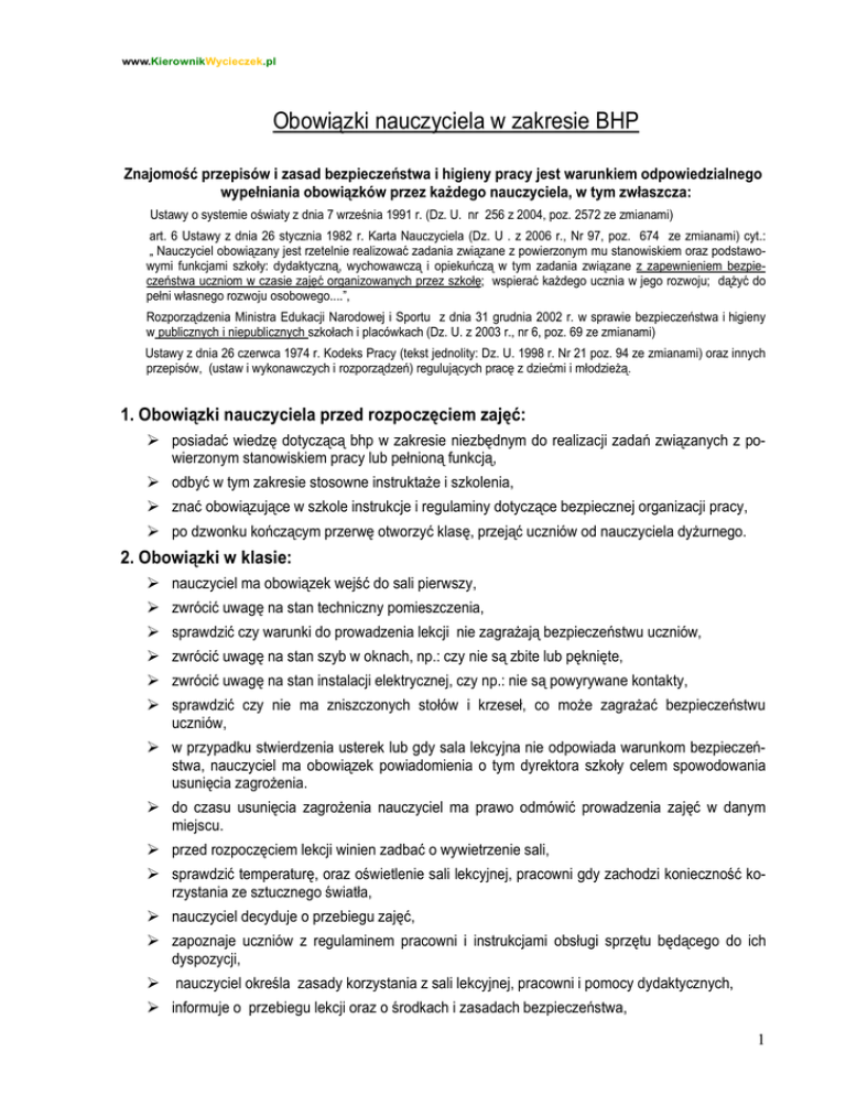 www.KierownikWycieczek.pl Obowiązki nauczyciela w zakresie BHP Znajomość przepisów i zasad bezpieczeństwa i higieny pracy jest warunkiem odpowiedzialnego wypełniania obowiązków przez każdego nauczyciela, w tym zwłaszcza: Ustawy o systemie oświaty z dnia 7 września 1991 r. (Dz. U. nr 256 z 2004, poz. 2572 ze zmianami) art. 6 Ustawy z dnia 26 stycznia 1982 r. Karta Nauczyciela (Dz. U . z 2006 r., Nr 97, poz. 674 ze zmianami) cyt.: „ Nauczyciel obowiązany jest rzetelnie realizować zadania związane z powierzonym mu stanowiskiem oraz podstawowymi funkcjami szkoły: dydaktyczną, wychowawczą i opiekuńczą w tym zadania związane z zapewnieniem bezpieczeństwa uczniom w czasie zajęć organizowanych przez szkołę; wspierać każdego ucznia w jego rozwoju; dążyć do pełni własnego rozwoju osobowego....”, Rozporządzenia Ministra Edukacji Narodowej i Sportu z dnia 31 grudnia 2002 r. w sprawie bezpieczeństwa i higieny w publicznych i niepublicznych szkołach i placówkach (Dz. U. z 2003 r., nr 6, poz. 69 ze zmianami) Ustawy z dnia 26 czerwca 1974 r. Kodeks Pracy (tekst jednolity: Dz. U. 1998 r. Nr 21 poz. 94 ze zmianami) oraz innych przepisów, (ustaw i wykonawczych i rozporządzeń) regulujących pracę z dziećmi i młodzieżą. 1. Obowiązki nauczyciela przed rozpoczęciem zajęć: posiadać wiedzę dotyczącą bhp w zakresie niezbędnym do realizacji zadań związanych z powierzonym stanowiskiem pracy lub pełnioną funkcją, odbyć w tym zakresie stosowne instruktaże i szkolenia, znać obowiązujące w szkole instrukcje i regulaminy dotyczące bezpiecznej organizacji pracy, po dzwonku kończącym przerwę otworzyć klasę, przejąć uczniów od nauczyciela dyżurnego. 2. Obowiązki w klasie: nauczyciel ma obowiązek wejść do sali pierwszy, zwrócić uwagę na stan techniczny pomieszczenia, sprawdzić czy warunki do prowadzenia lekcji nie zagrażają bezpieczeństwu uczniów, zwrócić uwagę na stan szyb w oknach, np.: czy nie są zbite lub pęknięte, zwrócić uwagę na stan instalacji elektrycznej, czy np.: nie są powyrywane kontakty, sprawdzić czy nie ma zniszczonych stołów i krzeseł, co może zagrażać bezpieczeństwu uczniów, w przypadku stwierdzenia usterek lub gdy sala lekcyjna nie odpowiada warunkom bezpieczeństwa, nauczyciel ma obowiązek powiadomienia o tym dyrektora szkoły celem spowodowania usunięcia zagrożenia. do czasu usunięcia zagrożenia nauczyciel ma prawo odmówić prowadzenia zajęć w danym miejscu. przed rozpoczęciem lekcji winien zadbać o wywietrzenie sali, sprawdzić temperaturę, oraz oświetlenie sali lekcyjnej, pracowni gdy zachodzi konieczność korzystania ze sztucznego światła, nauczyciel decyduje o przebiegu zajęć, zapoznaje uczniów z regulaminem pracowni i instrukcjami obsługi sprzętu będącego do ich dyspozycji, nauczyciel określa zasady korzystania z sali lekcyjnej, pracowni i pomocy dydaktycznych, informuje o przebiegu lekcji oraz o środkach i zasadach bezpieczeństwa, 1 podczas zajęć nauczyciel nie może uczniów pozostawić bez żadnej opieki, w nadzwyczajnej sytuacji winien wyprowadzić uczniów z sali, pracowni oraz zgłosić to nauczycielowi z sali obok, (sytuacja taka nie zwalnia go od odpowiedzialności za uczniów), uczniów chcących skorzystać z toalety nauczyciel powinien zwalniać pojedynczo. Winien brać pod uwagę fakt, iż uczniowie najczęściej dopuszczają się nierozważnych czynów kiedy są w grupach bez opieki dorosłych, w razie stwierdzenia niedyspozycji ucznia, jeśli zaistnieje taka potrzeba musi udzielić pierwszej pomocy i bezzwłocznie powiadomić o zdarzeniu dyrektora, powinien także kontrolować właściwą postawę uczniów w czasie lekcji. Korygować zauważone błędy w pozycji siedzenia, zadbać o czystość, ład i porządek sali lekcyjnej, pracowni podczas trwania lekcji i po jej zakończeniu, po skończonej lekcji powinien sam otworzyć drzwi, by nie dopuścić do gwałtownego ich otwarcia przez wybiegających uczniów (może to spowodować uderzenie w przechodzących na korytarzu, nauczyciel obowiązany jest przestrzegać ustalonych godzin rozpoczynania i kończenia lekcji oraz do respektowania prawa uczniów do pełnych przerw międzylekcyjnych. Nadzór nad uczniami w czasie przerw międzylekcyjnych, a także przed i po zajęciach określa regulamin dyżurów. Regulamin jest załącznikiem do regulaminu pracy. Organizację i harmonogram dyżurów nauczycieli ustala dyrektor szkoły po rozpoznaniu potrzeb szkoły. W czasie przerw uczniowie pozostają pod nadzorem i opieką nauczycieli. Przy sprzyjających warunkach atmosferycznych powinni przebywać na boisku szkolnym (na świeżym powietrzu). 3. Obowiązki nauczyciela dyżurnego podczas przerw międzylekcyjnych i przed rozpoczęciem zajęć: Podczas pełnienia dyżuru nauczyciel obowiązany jest do: punktualnego rozpoczynania dyżuru i ciągłej obecności w miejscu podlegającym jego nadzorowi, znać regulaminy pełnienia dyżuru obowiązujące na poszczególnych kondygnacjach, boisku i pozostałym terenie szkoły, aktywnego pełnienia dyżuru - reagowania na wszelkie przejawy zachowań odbiegających od przyjętych norm, reagowania na niebezpieczne, zagrażające bezpieczeństwu uczniów zachowania (agresywne postawy wobec kolegów; bieganie, siadanie na poręczach schodów, parapetach okiennych, wchodzenia na drzewa, płoty itp.), przestrzegania zakazu otwierania okien na korytarzach, obowiązku zamykania drzwi do sal lekcyjnych (przewiewy), dbania by uczniowie nie śmiecili, brudzili, dewastowali ścian, ławek i innych urządzeń szkolnych oraz by nie niszczyli roślin, zwracania uwagi na przestrzeganie przez młodzieżą ustalonych zasad wchodzenia do budynku szkolnego i sal lekcyjnych, dopilnowania, by w czasie przerw sale lekcyjne były wywietrzone - nie powinno się otwierać dużych skrzydeł okiennych, dopilnowania i egzekwowania, zakazu opuszczali terenu szkoły podczas przerwy, 2 niedopuszczania do